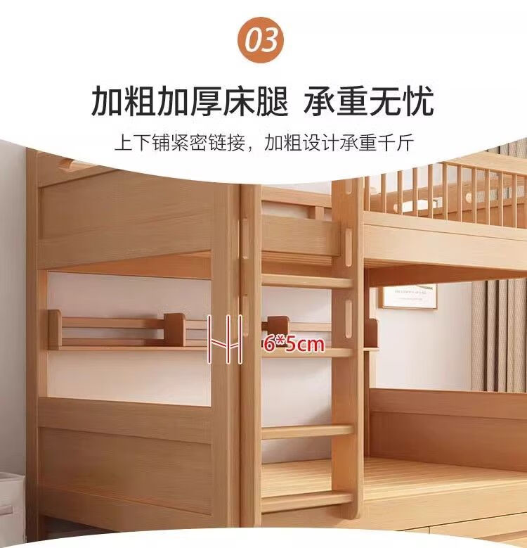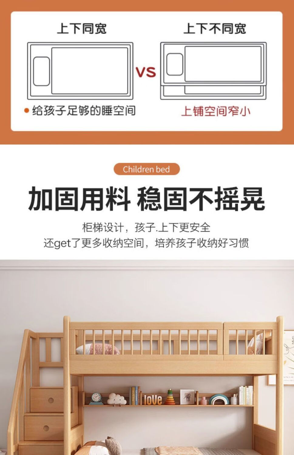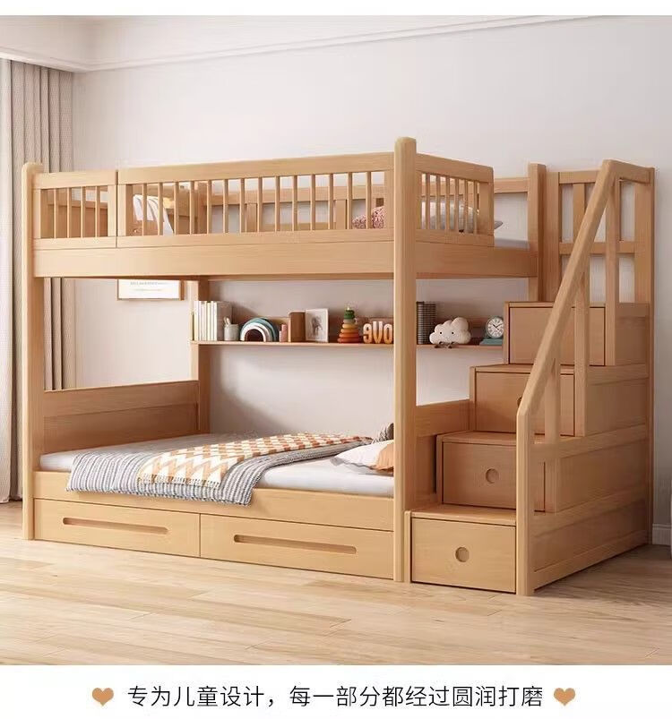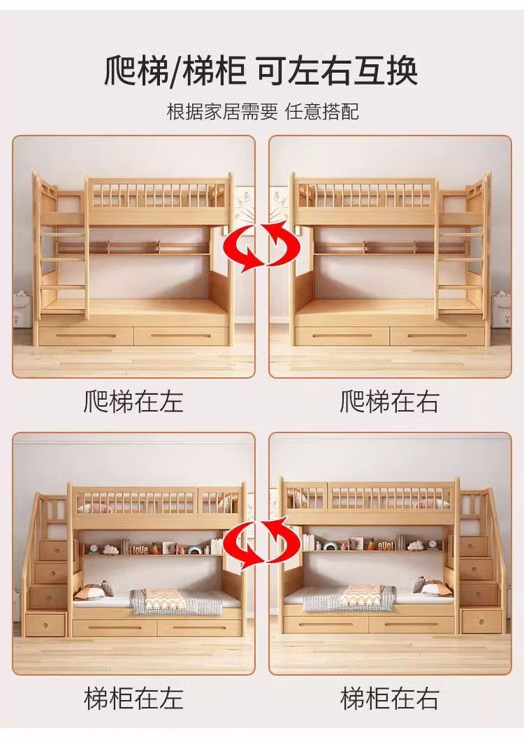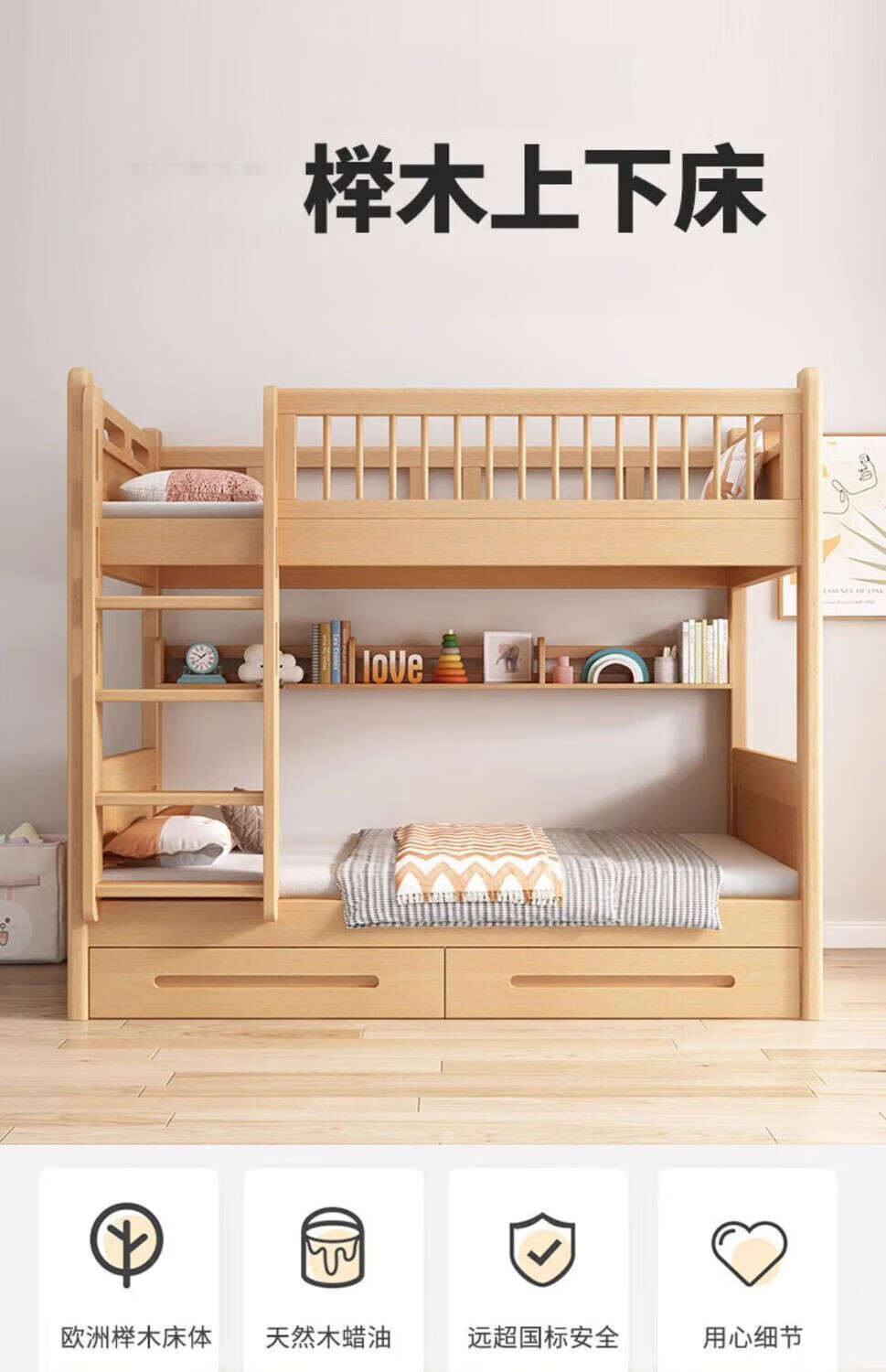 Ou Xufeng's 2026 new beech bunk bed, solid wood bunk bed, high and low small apartment bed, double bed, bunk bed, beech ladder bed + drawer + solid wood bookshelf + free mattress (upper and lower * same width) 1.5 meters wide * 2.0 meters long
