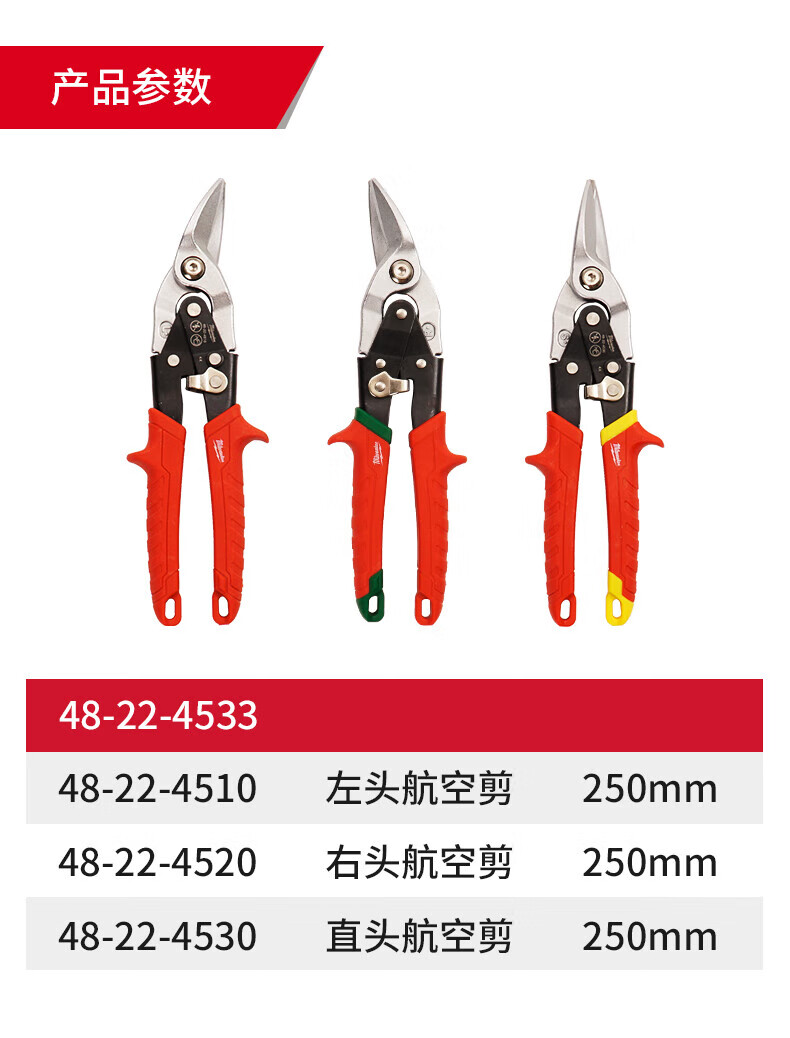 Milwaukee Milwaukee metal scissors high hardness scissors stainless steel keel aviation scissors aluminum gusset industrial scissors 48-22-4510 (left head aviation scissors)