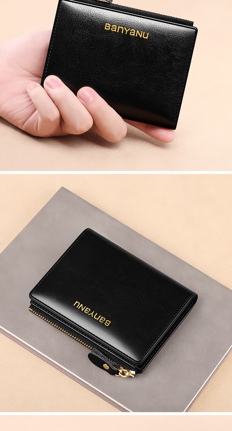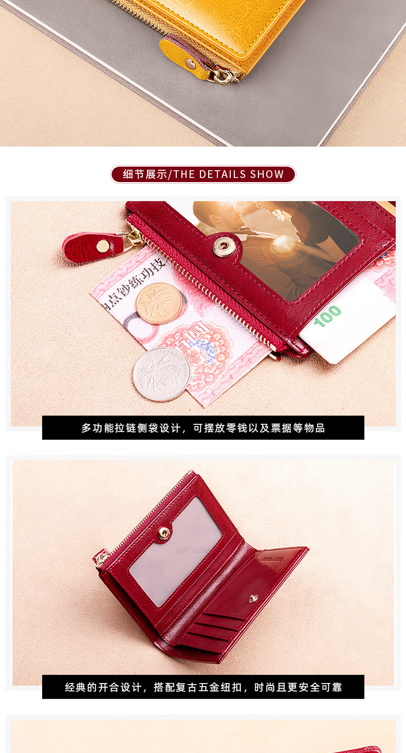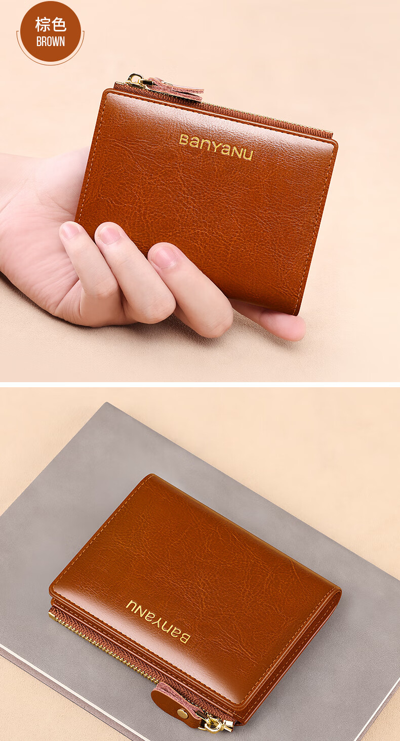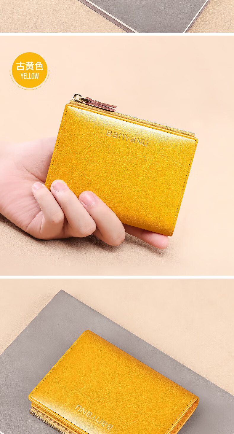 Banyanu Women's Wallet Short Genuine Leather Exquisite Coin Purse Women's 2025 New Fashion Wallet Folding Wallet Thin Antique Yellow-Anti-Theft Brush
