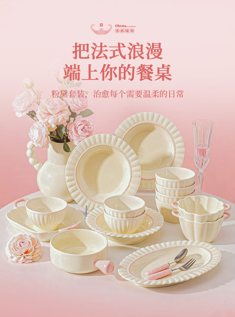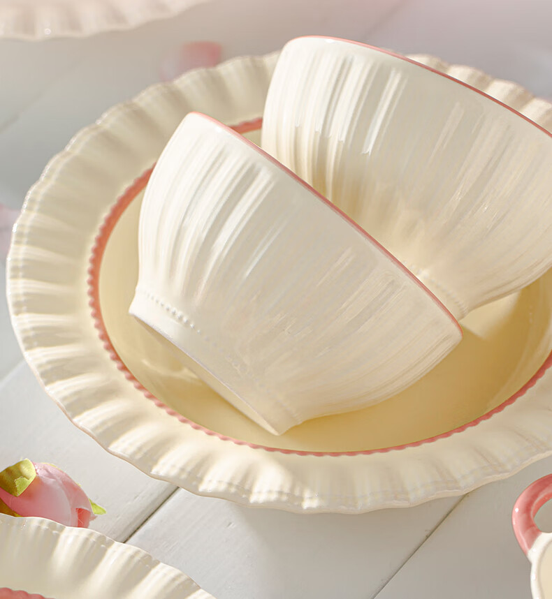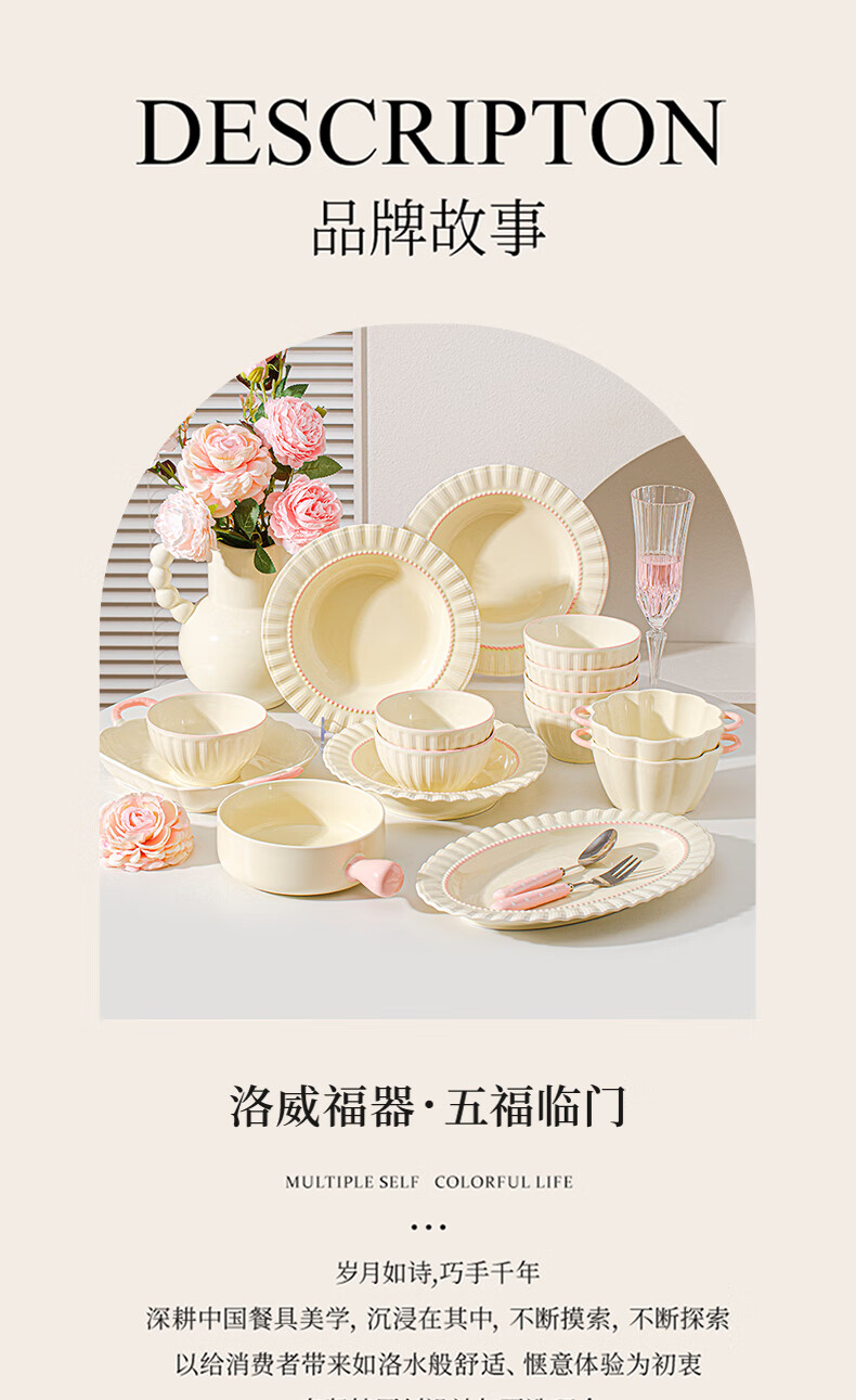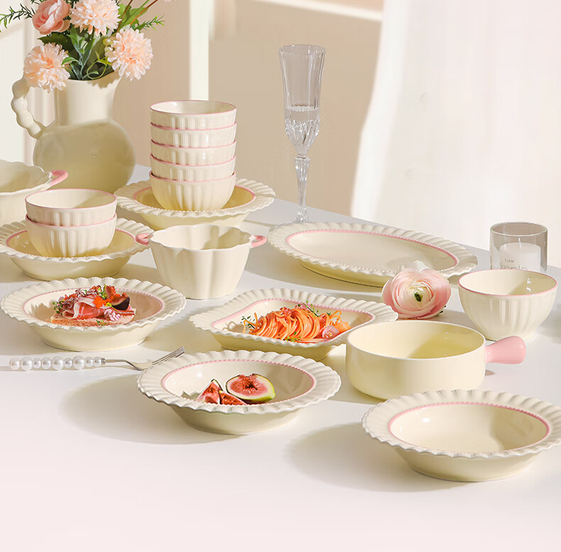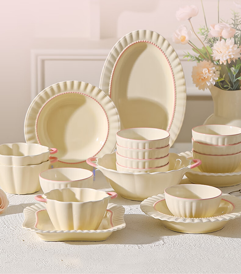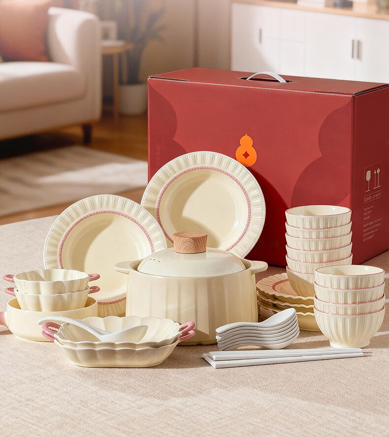 Lowe dish set for home use 2025 new high-looking bowls, chopsticks and plates cream style tableware set wedding gift recommended by the store manager Fendai 32-piece set for 6 people