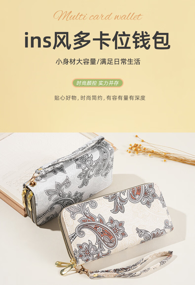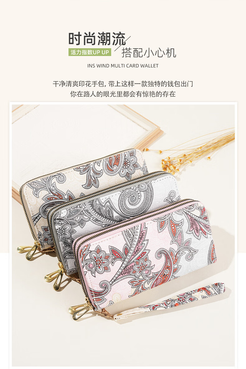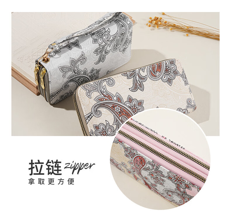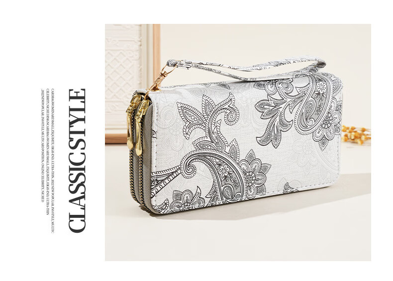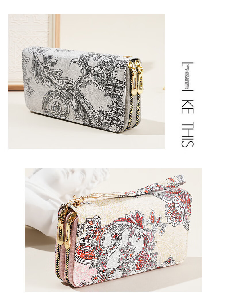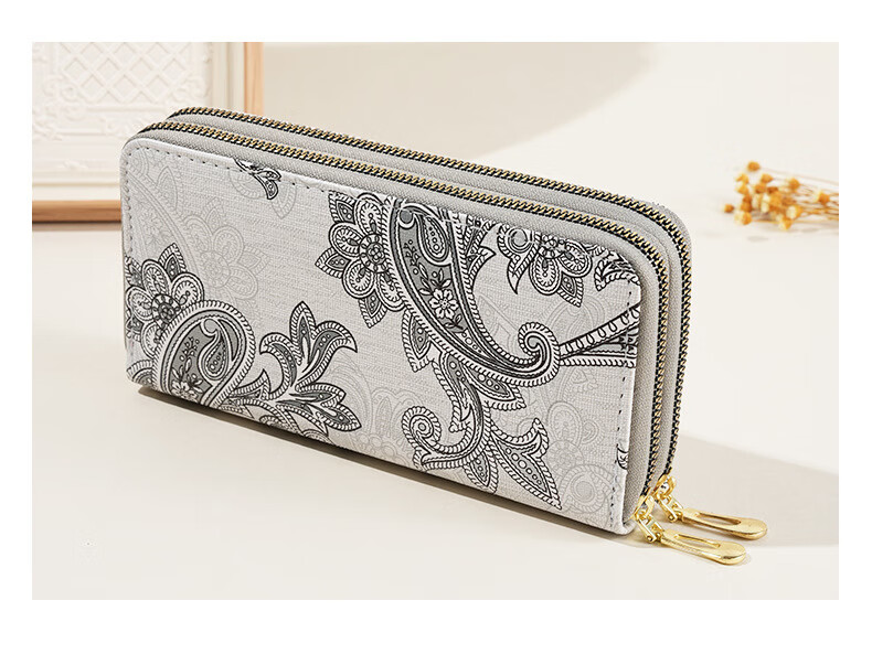 Ye Yu 2025 New Retro Print Lace Wallet Women's National Style Double Zipper Large Capacity Mobile Phone Bag Fashion Gray