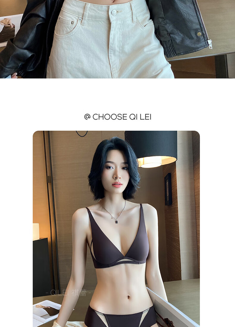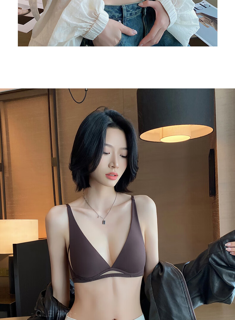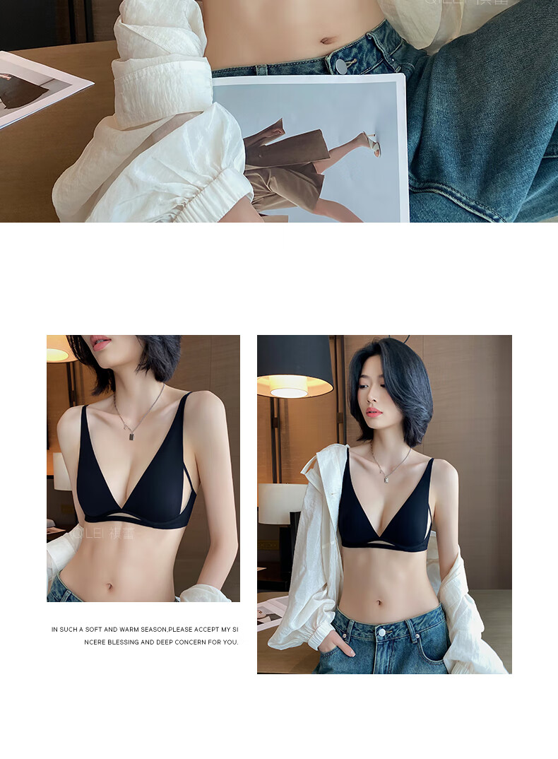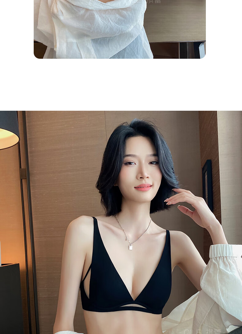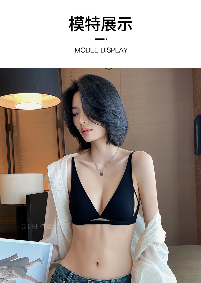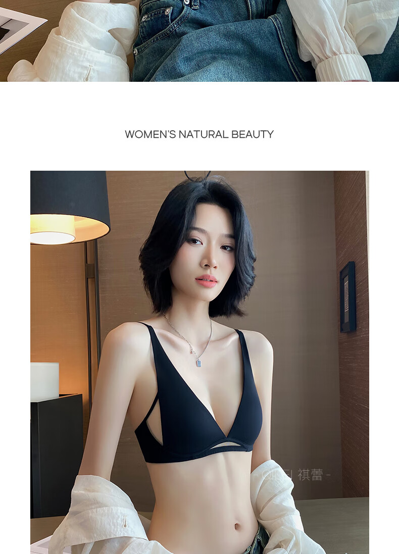 Seamless underwear for women, summer thin, small breasts, no steel rings, comfortable and sexy, deep v rabbit ears, triangle cup bra 2025 new style, black suit + champagne suit XL suitable for 85A/85B