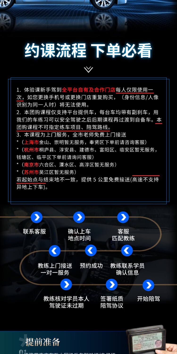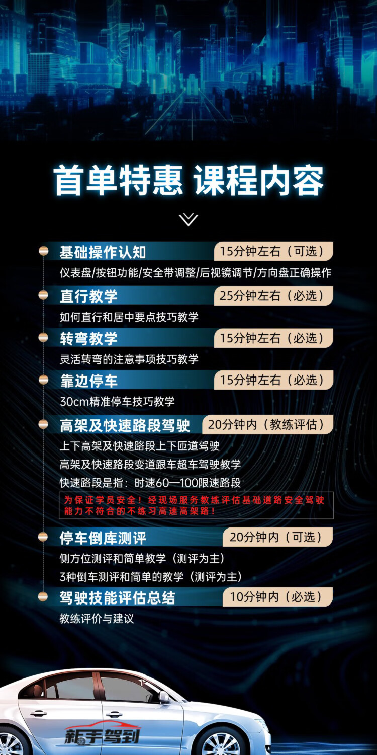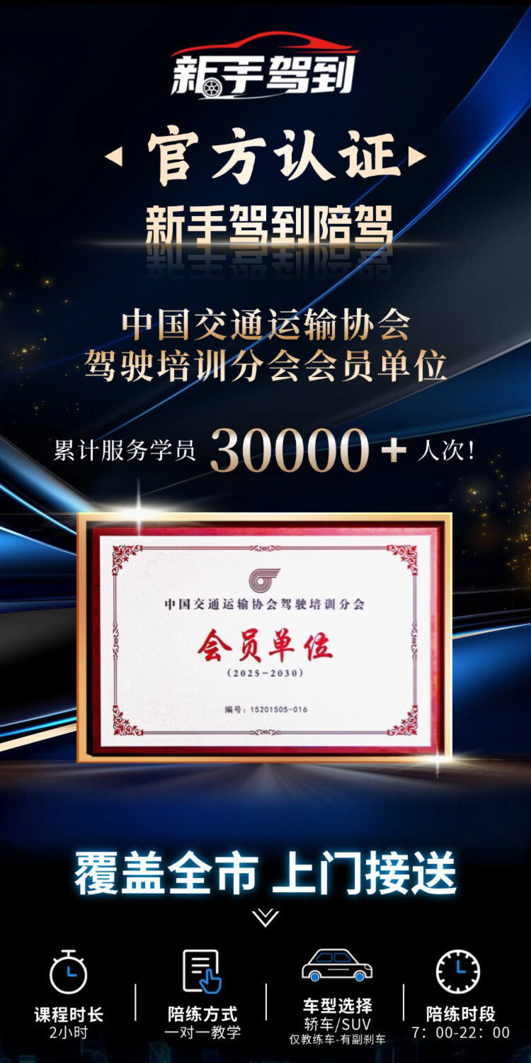 Novices drive to Shanghai/Hangzhou/Nanjing/Suzhou. Accompanying car driving and practice driving. Door-to-door pick-up and drop-off in the city for 2 hours. 1-on-1 for novices. 2-hour experience class in Shanghai (limited to one order/person)