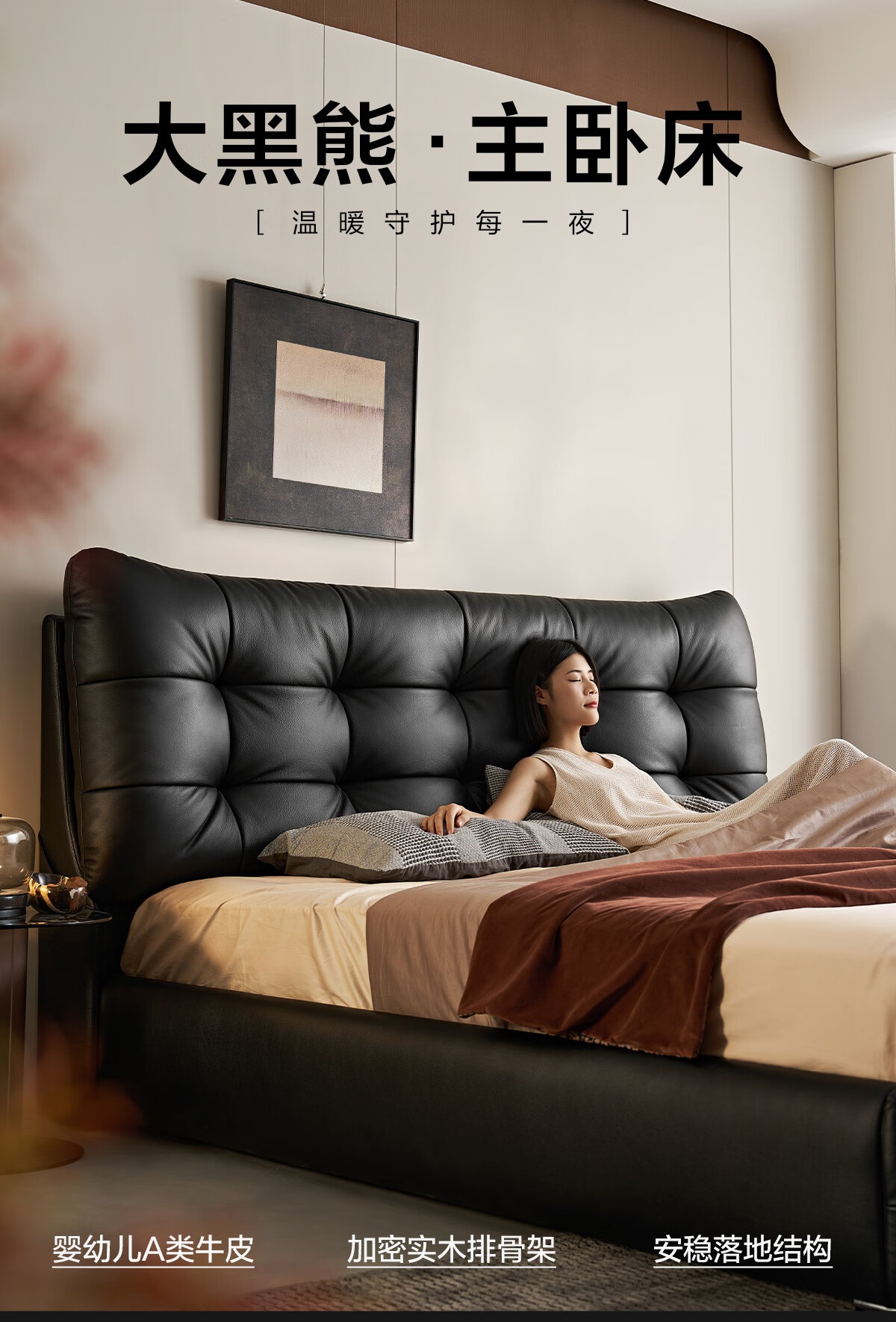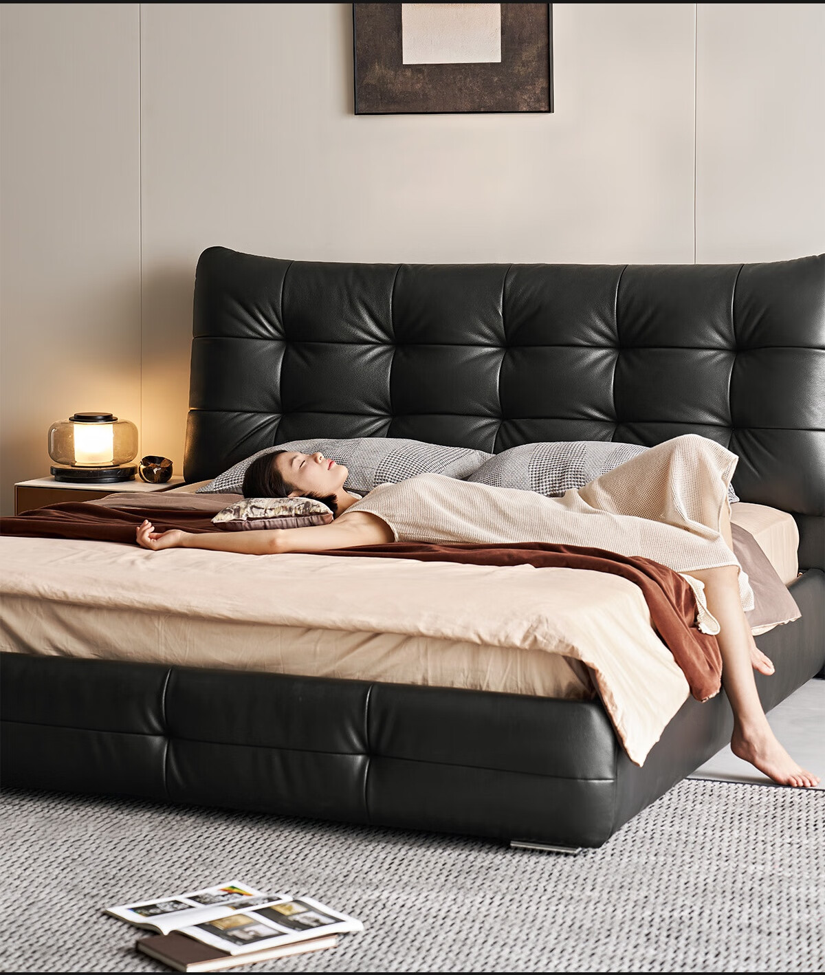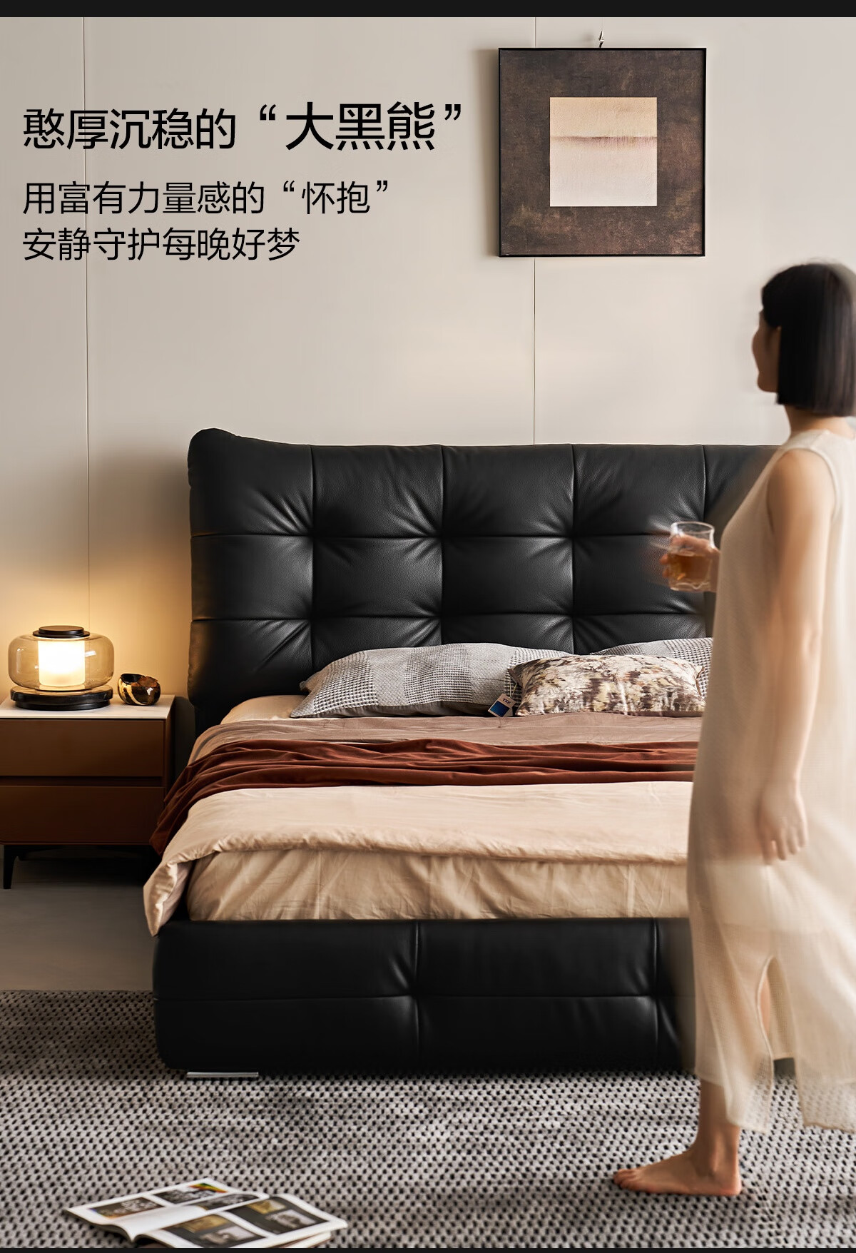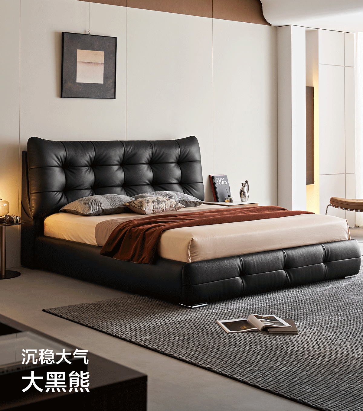 Lin's Home Leather Bed Master Bedroom Double Bed 1.8m 1.5m Large Black Bear Bed Home Upholstered Bed Light Luxury PC596 Black Brown | Floor Bed 1.8x2m