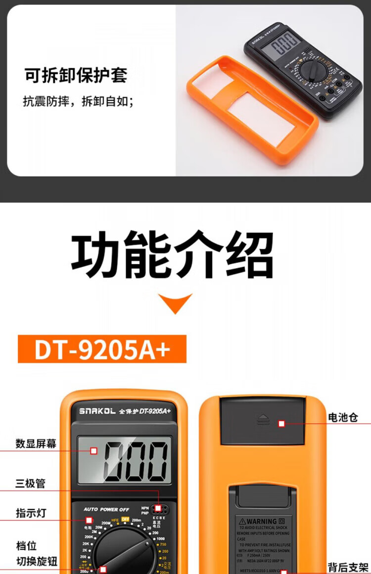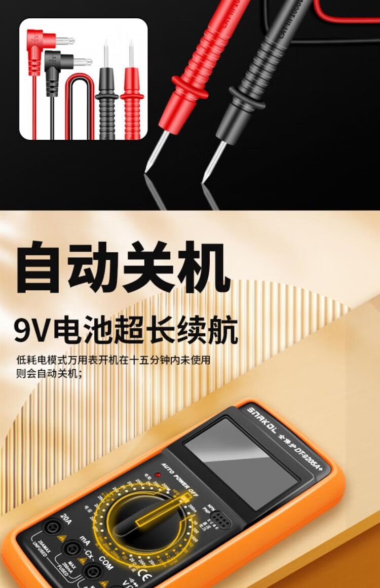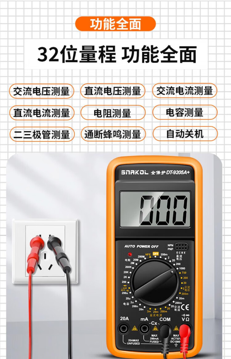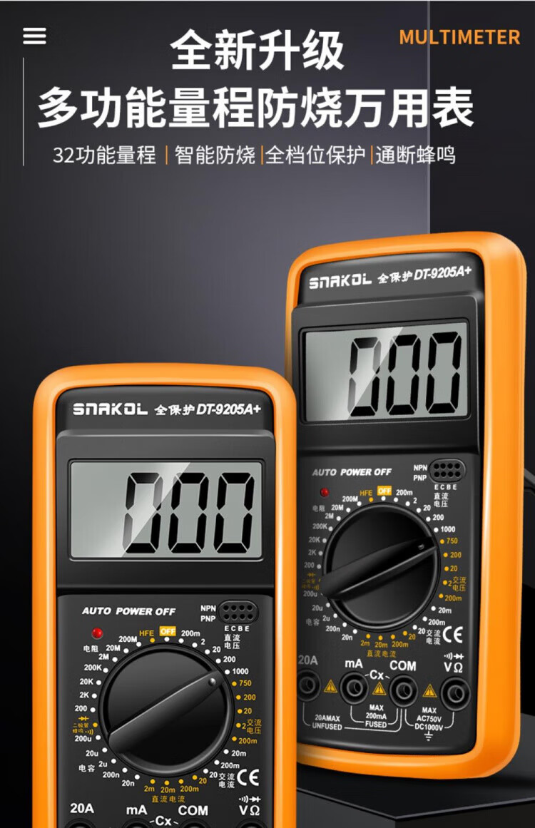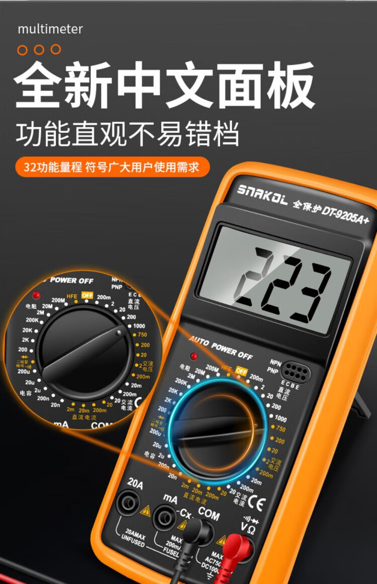 JCZS German multimeter electrician special high-precision DT9205A anti-burn digital protection large-screen digital display meter 9205A comes standard with battery test pen