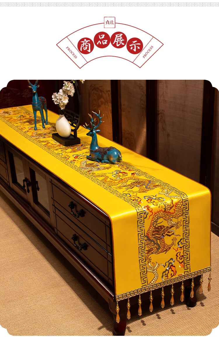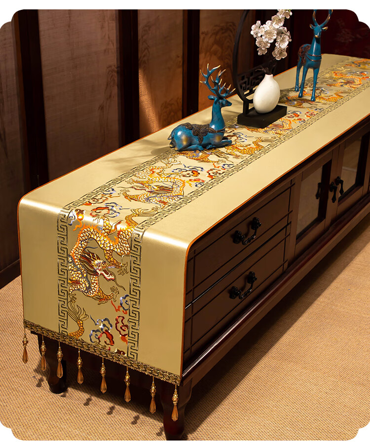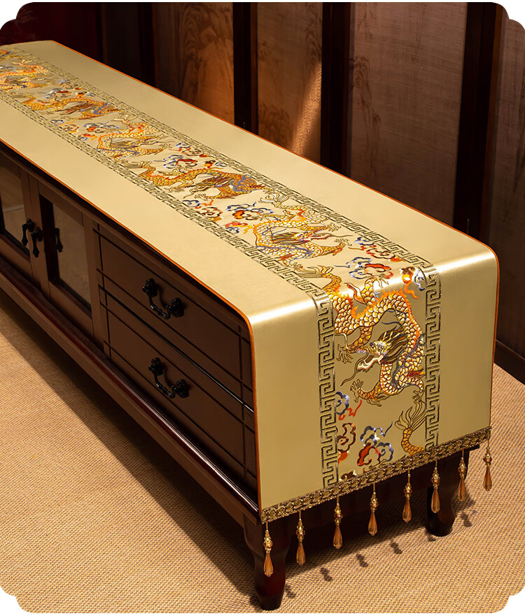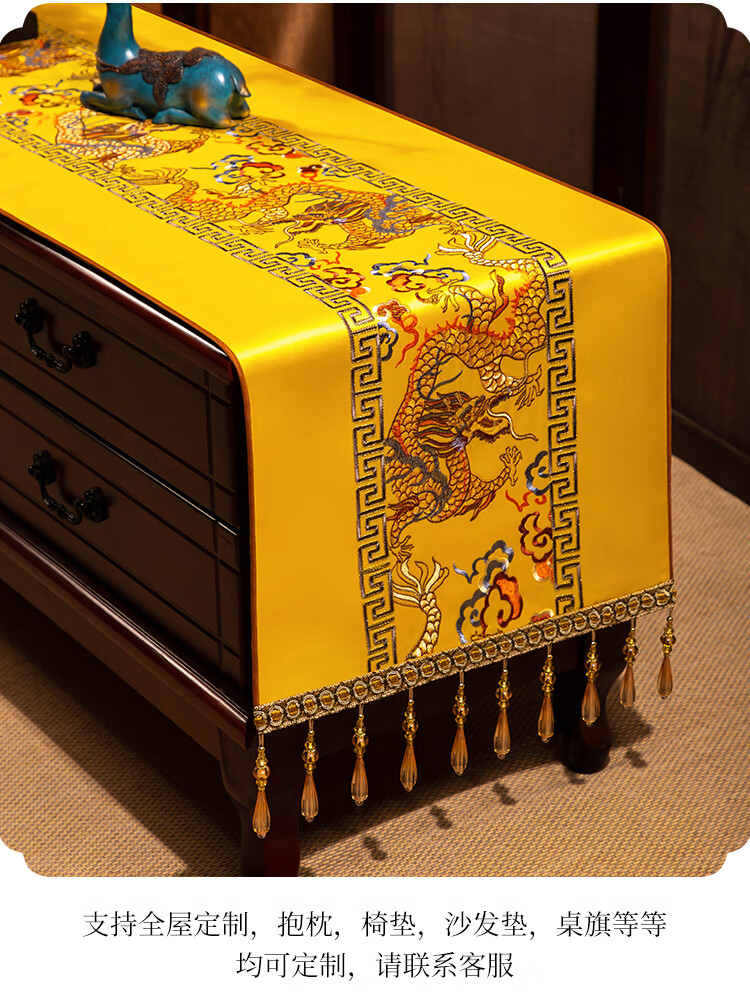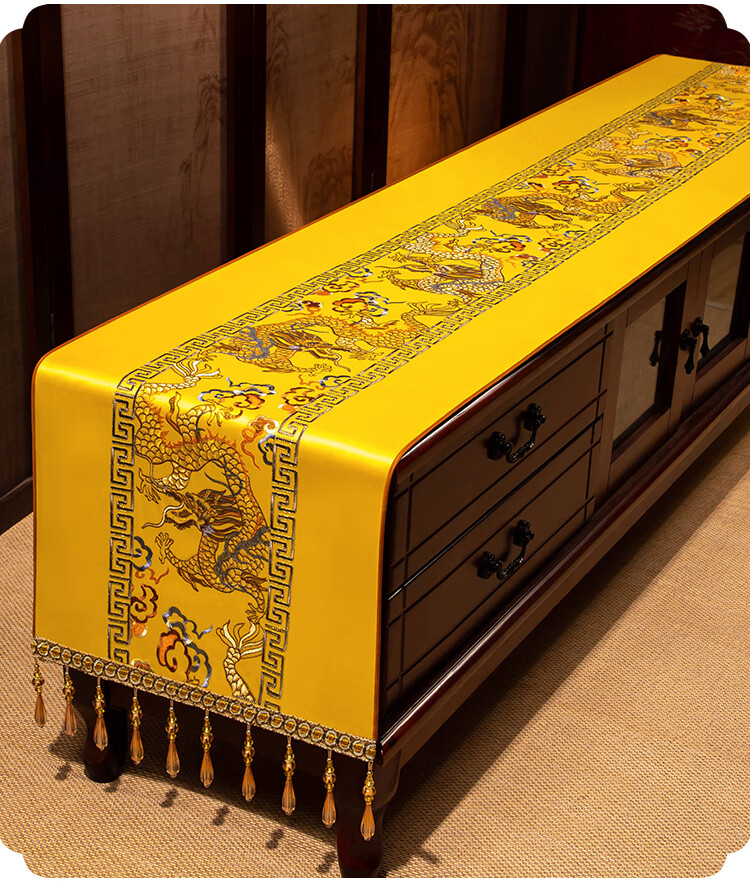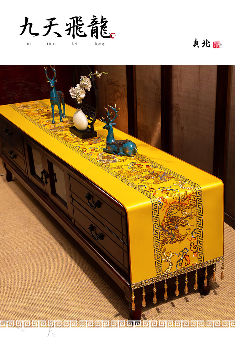 Yiboqiantang New Chinese Zen Coffee Table Tablecloth Chinese Style TV Cabinet Decorative Cover Cloth Rectangular Dining Table Sideboard Dustproof Cloth Nine Heavens Feilong Emperor Yellow High Precision/Waterproof Cabinet Cloth 40*200cm (Applicable table length 1.5-1.6m)