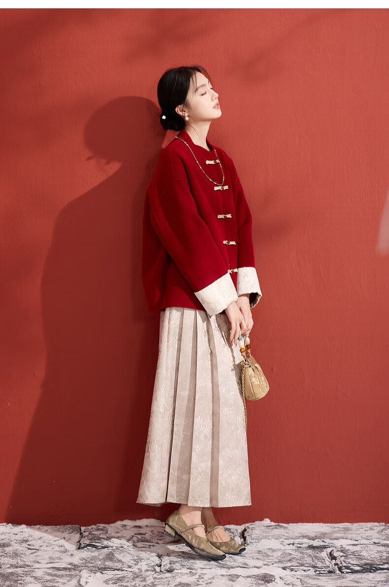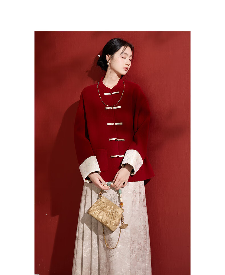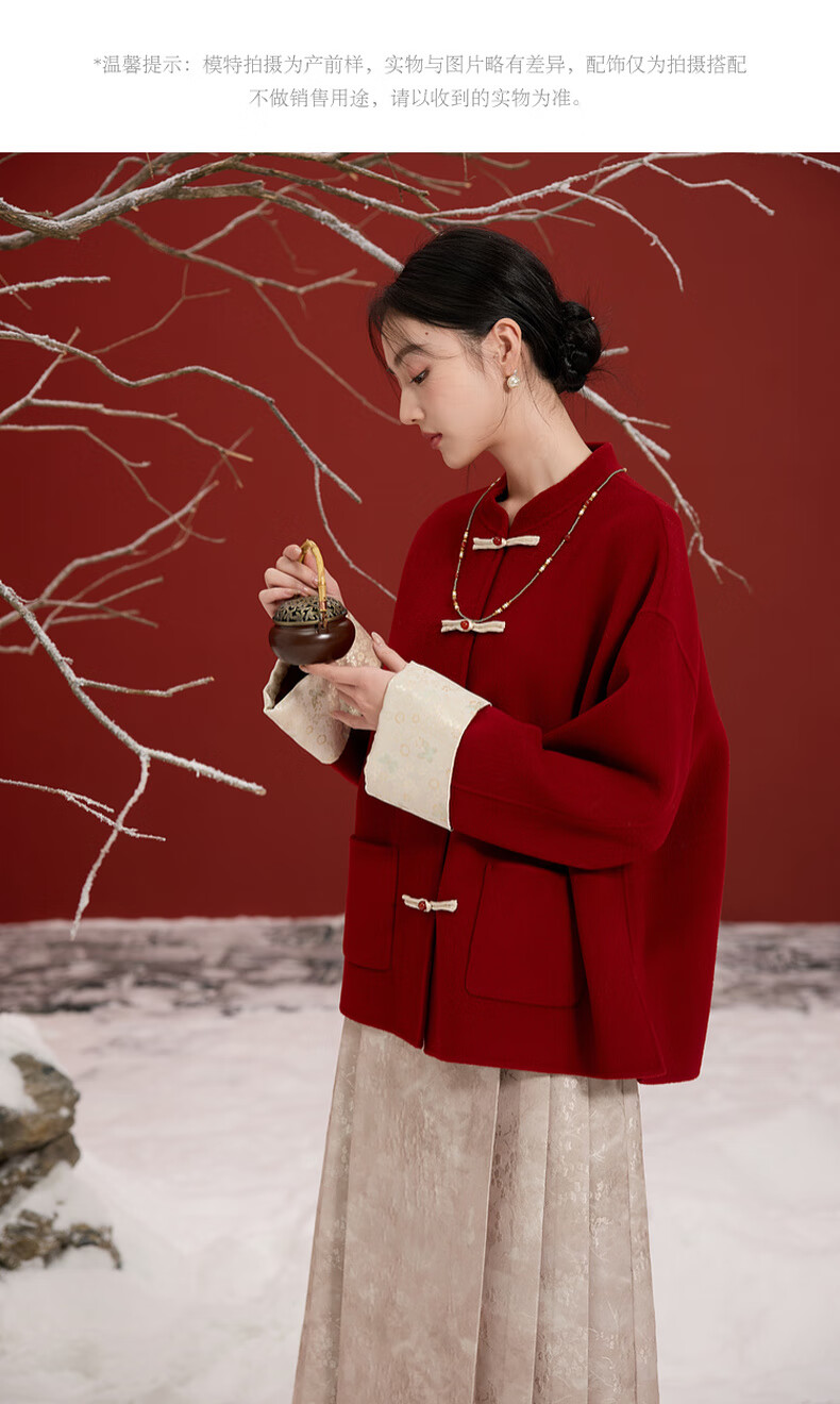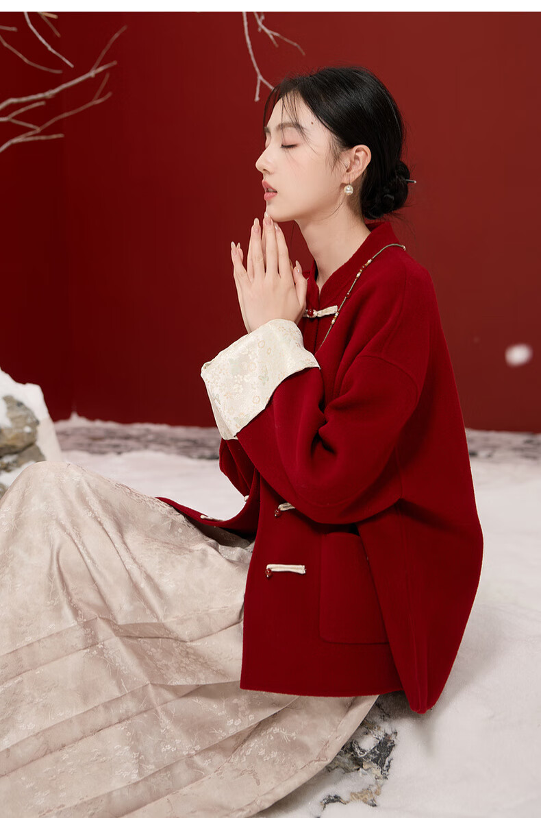 Tricolor Red Plum Yingxue 2025 Winter New Sheep Wool Double-sided Wool Coat Loose Short C Cherry Red S 155/80A