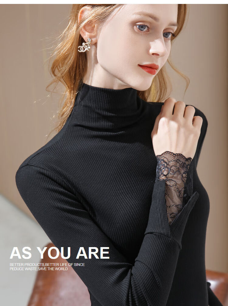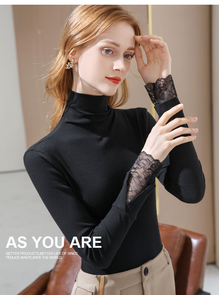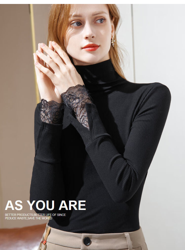 Playboy (PLAYBOY) ladylike turtleneck bottoming shirt for women in autumn and winter, long-sleeved, stylish and slim T-shirt spliced lace trumpet sleeve top, black plus velvet S