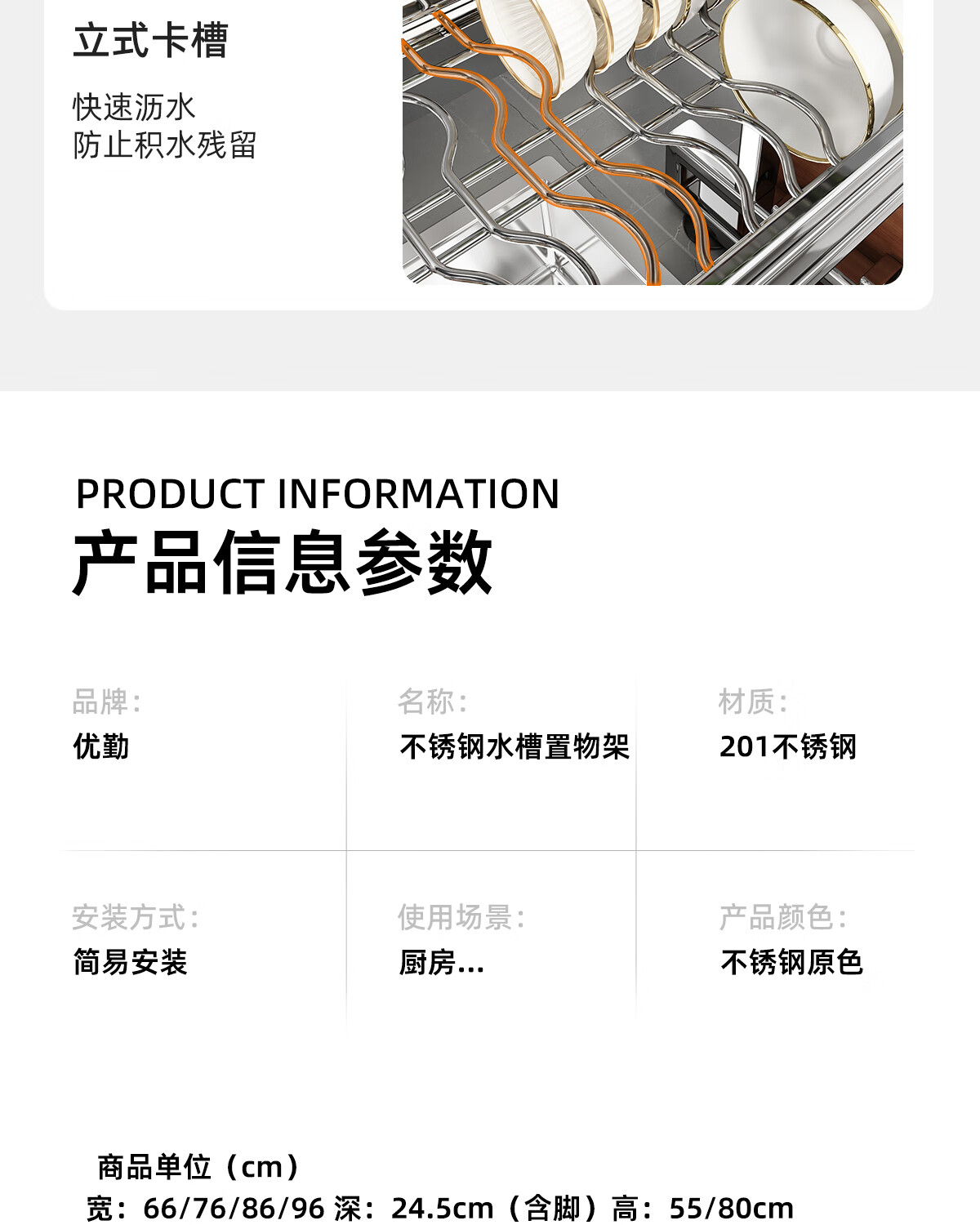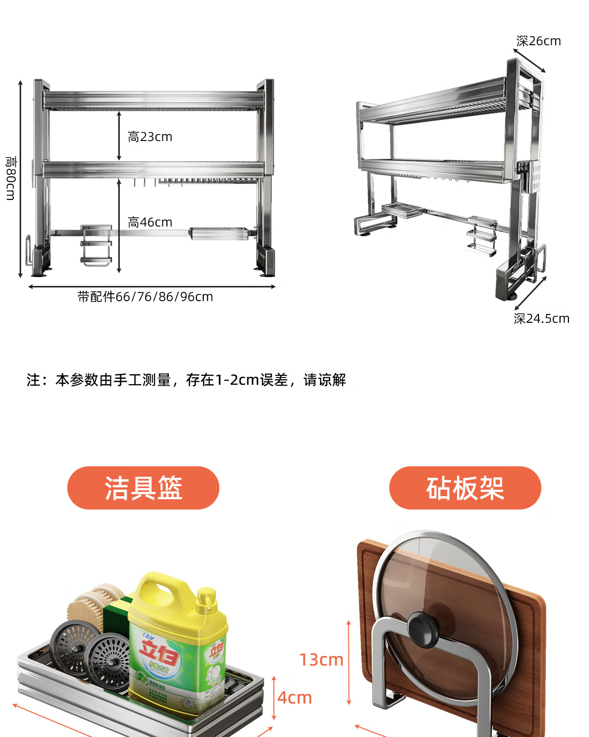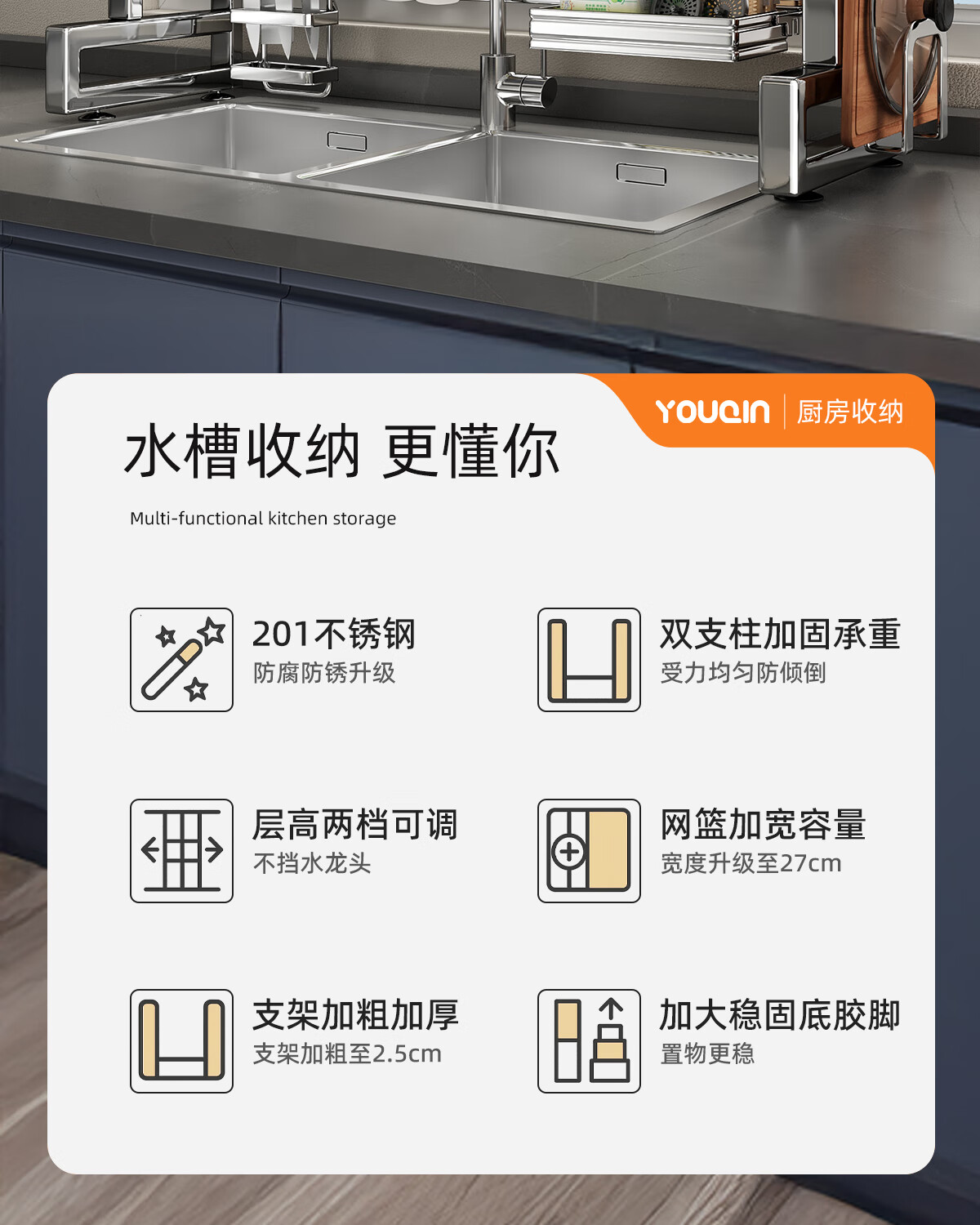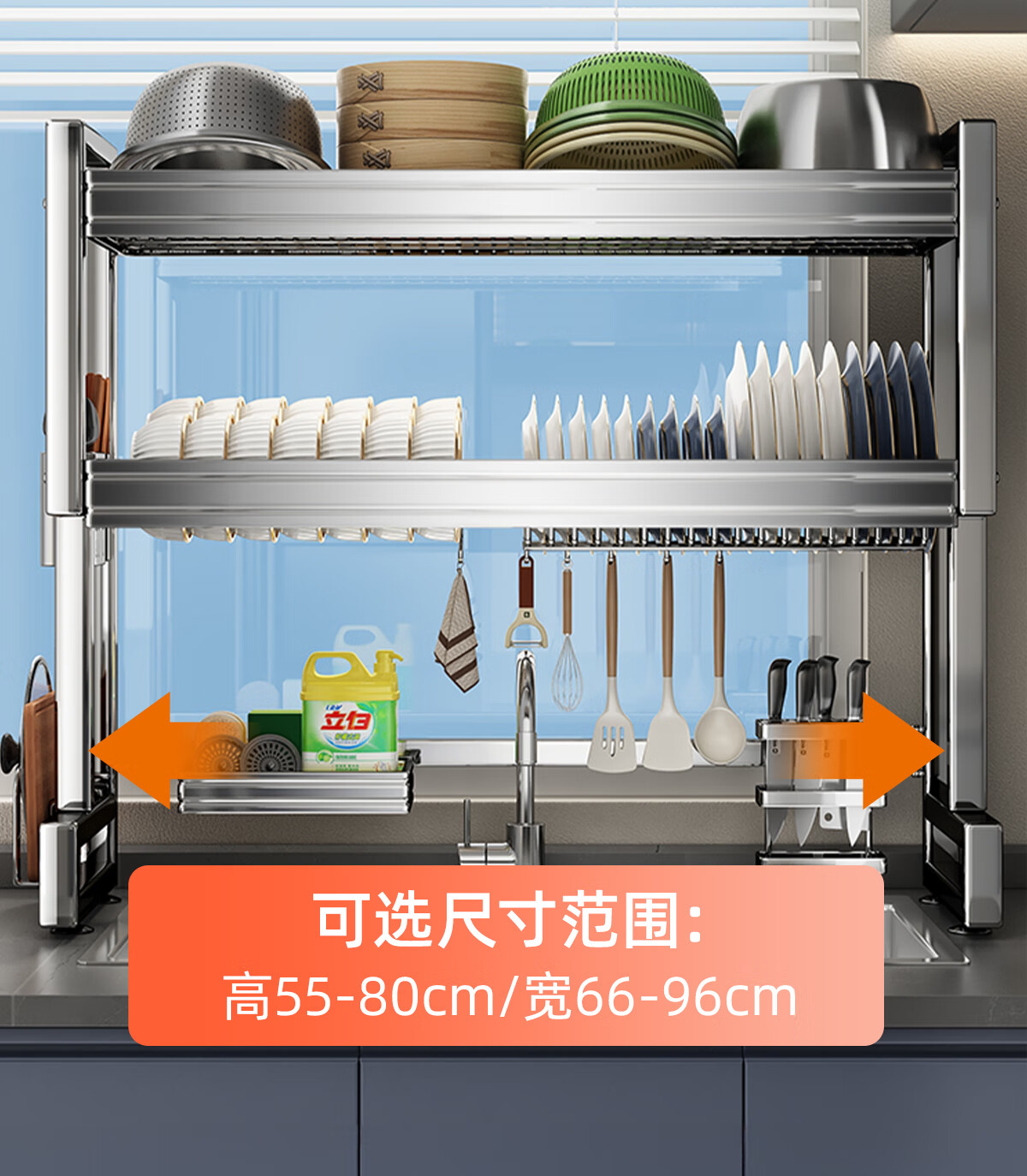 YOUQIN Stainless Steel Kitchen Sink Rack Dish Drain Storage Pool Washing Pool Multifunctional Dish Drain Rack Upgraded Thickened Stainless Steel Single Layer 76CM Main Rack + Hooks*4