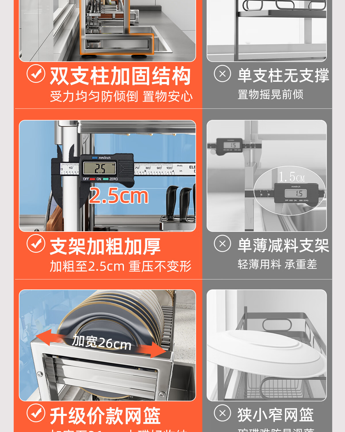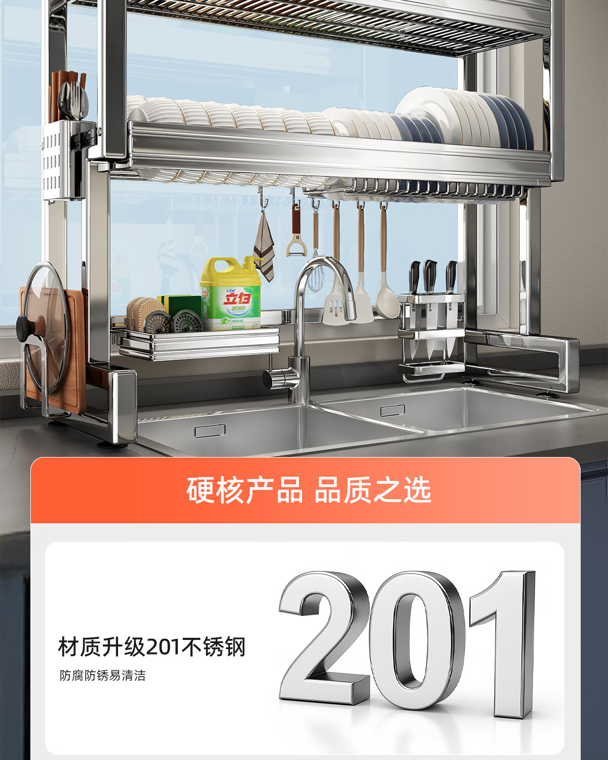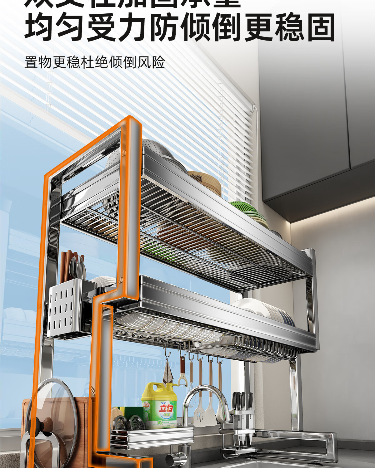 YOUQIN Stainless Steel Kitchen Sink Rack Dish Drain Storage Pool Washing Pool Multifunctional Dish Drain Rack Upgraded Thickened Stainless Steel Single Layer 76CM Main Rack + Hooks*4