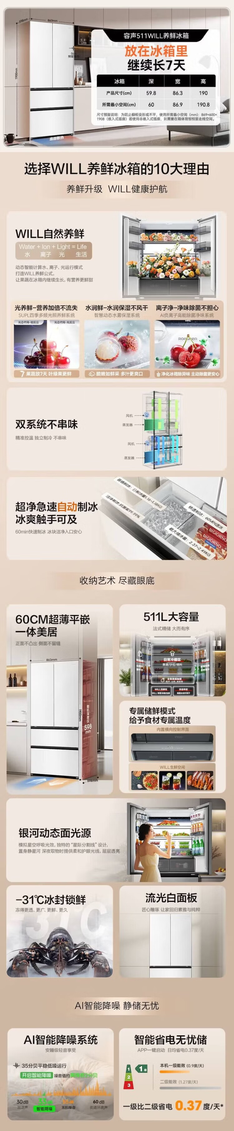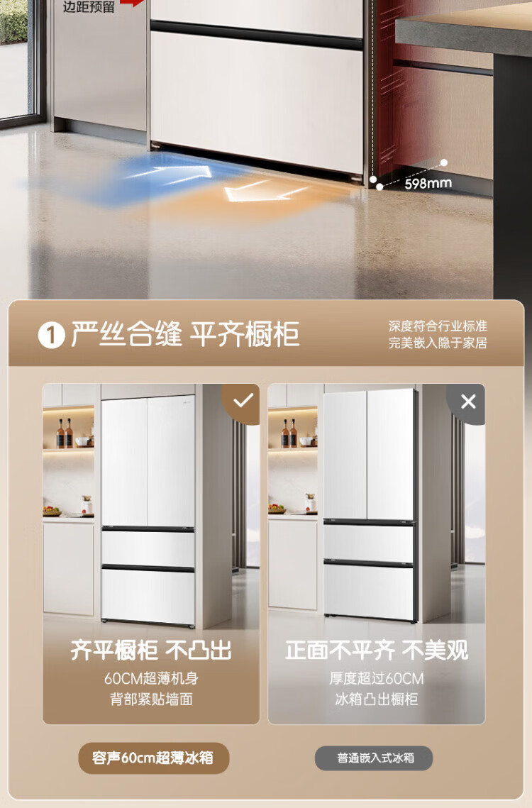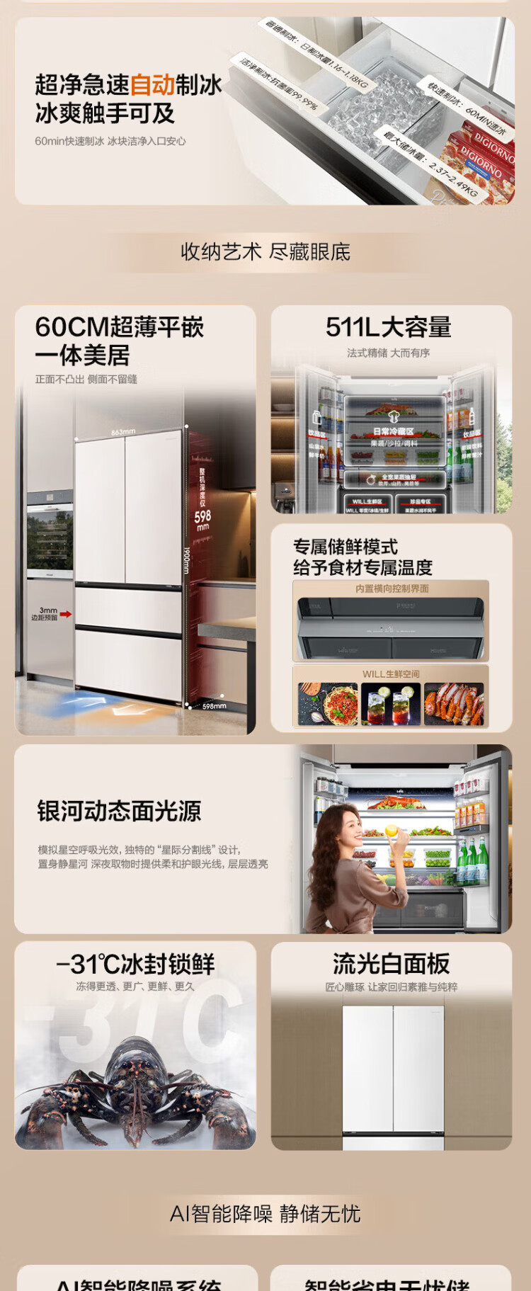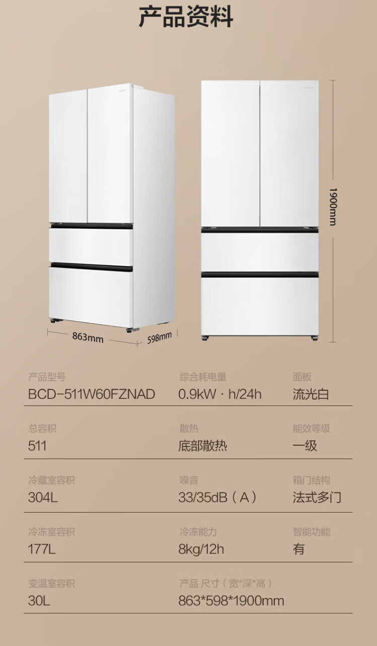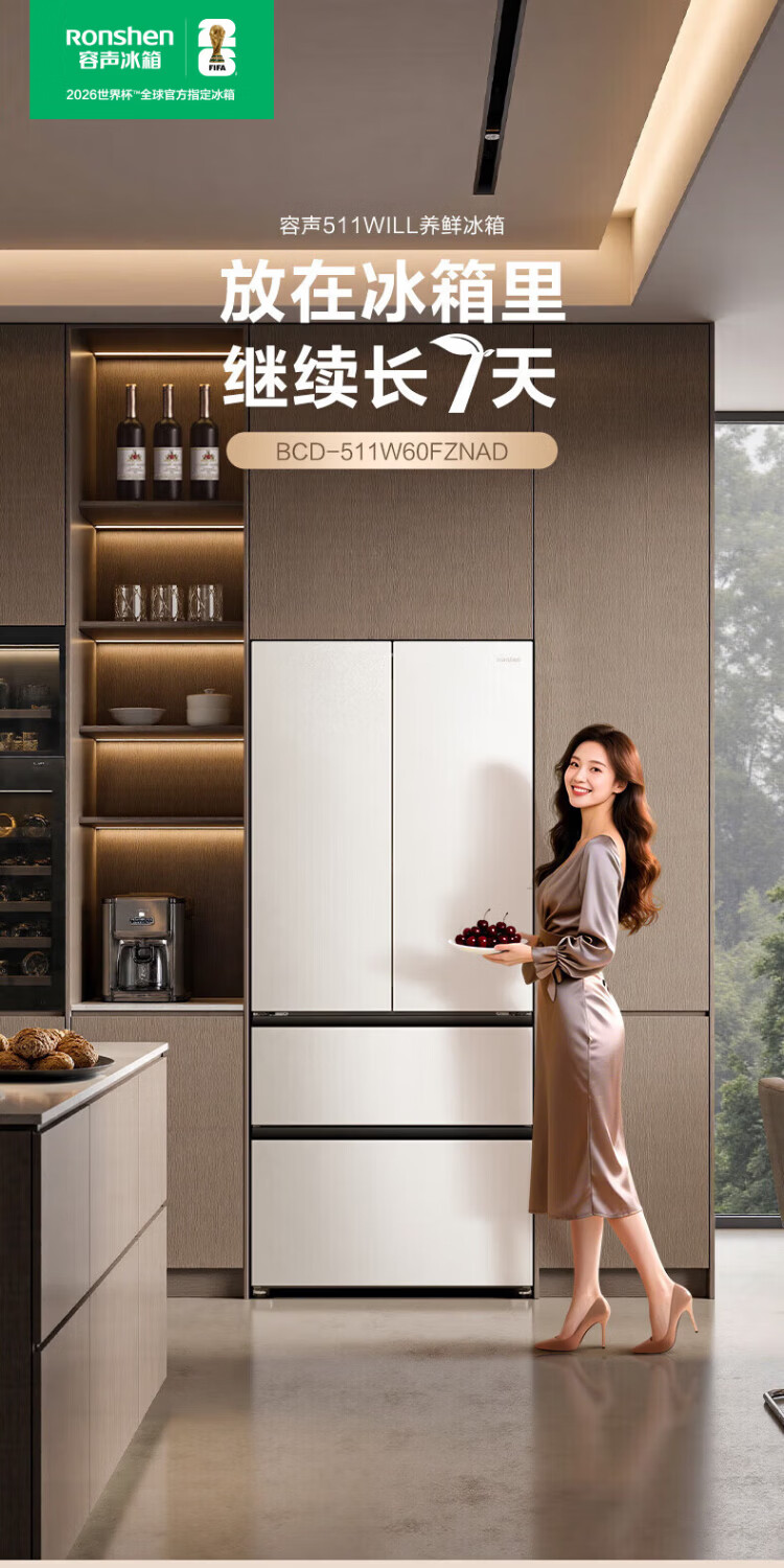 Rongsheng World Cup customized model 511WILL Fresh Dual System French multi-door four-door ultra-thin embedded refrigerator home automatic ice making first-class energy efficiency national subsidy BCD-511W60FZNAD
