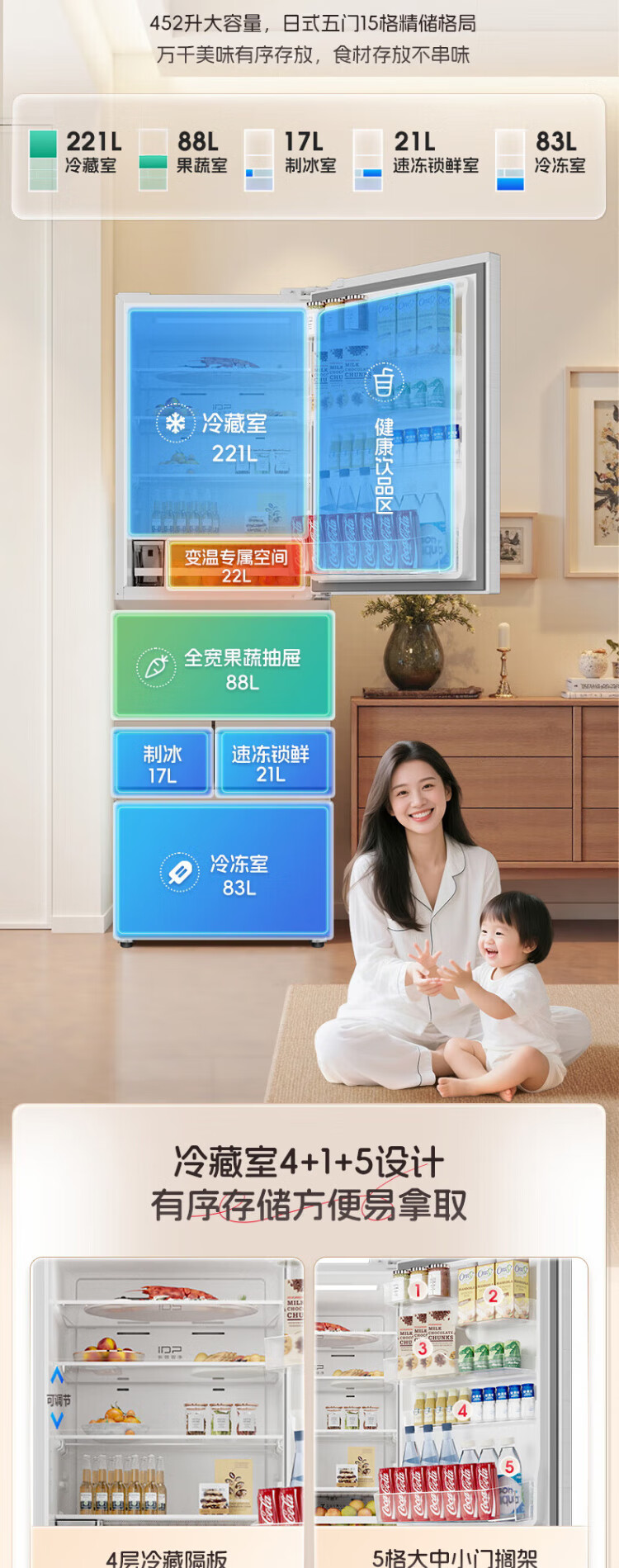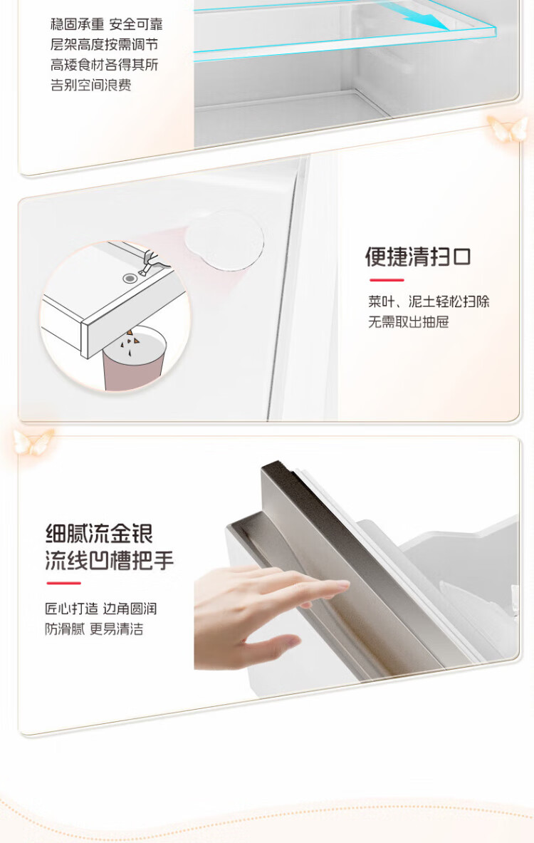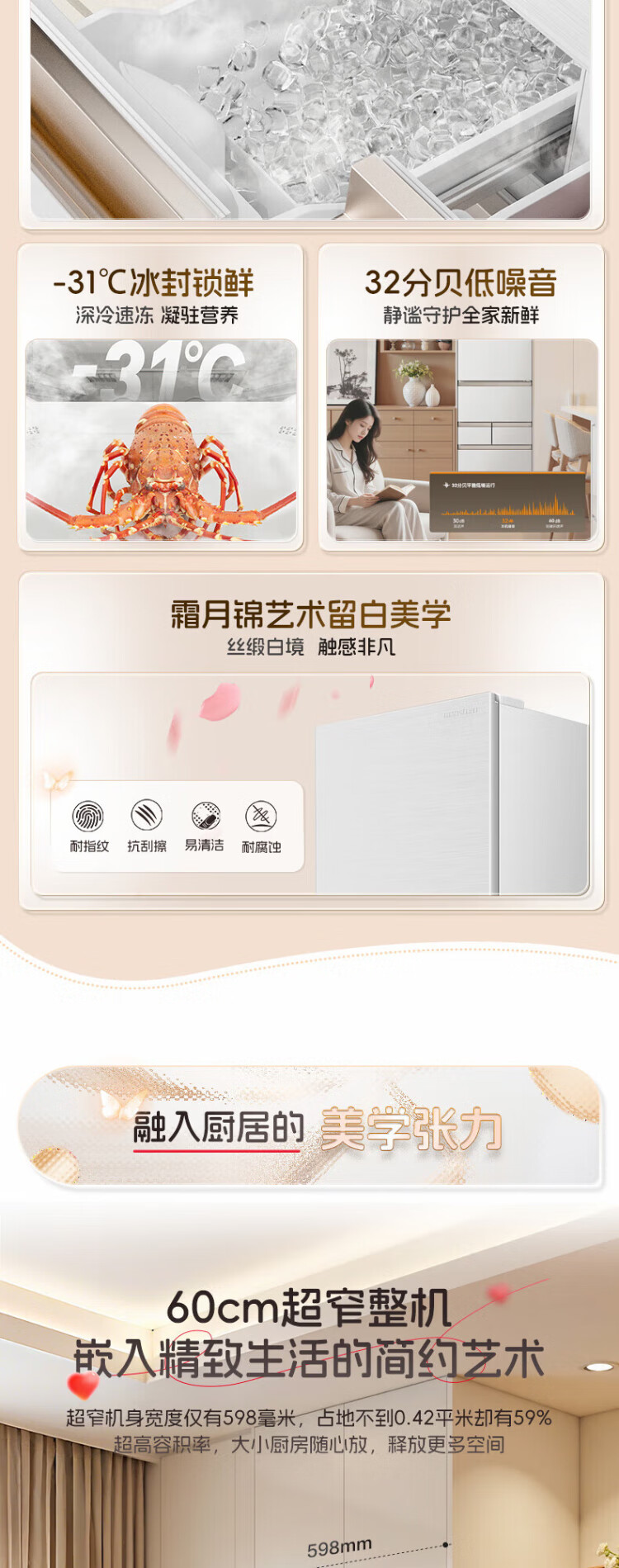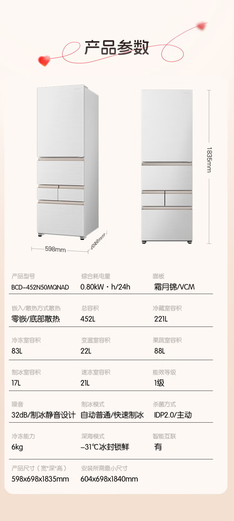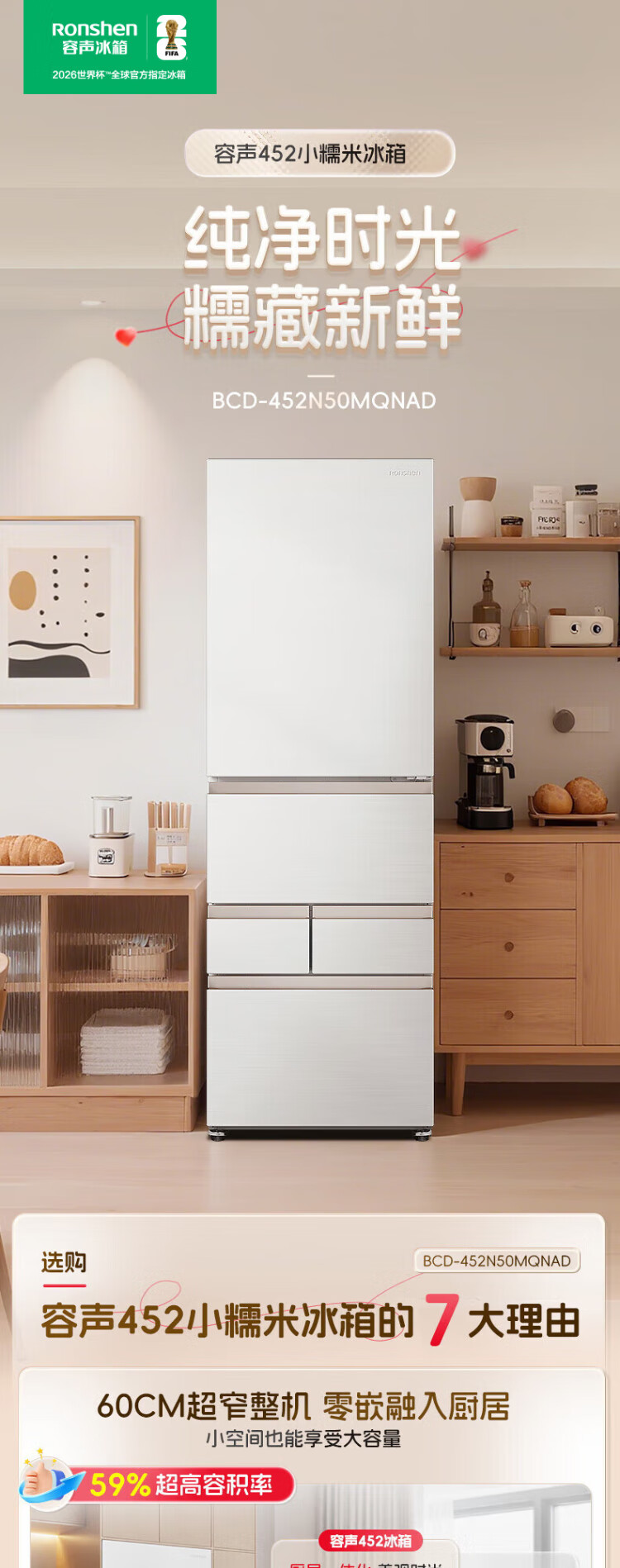 Rongsheng 452L small glutinous rice white five-door refrigerator IDP2.0 active sterilization embedded first-level energy efficiency household active sterilization and deodorization frequency conversion independent ice-making French refrigerator BCD-452N50MQNAD-DC34 Frost Moon White