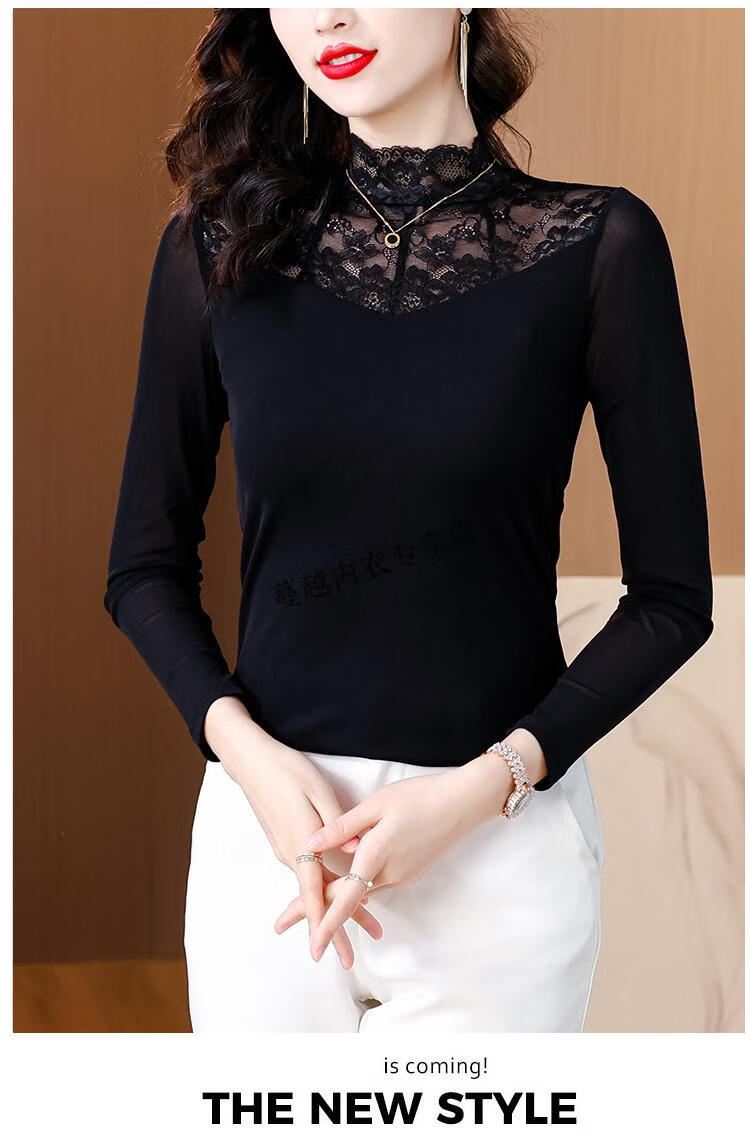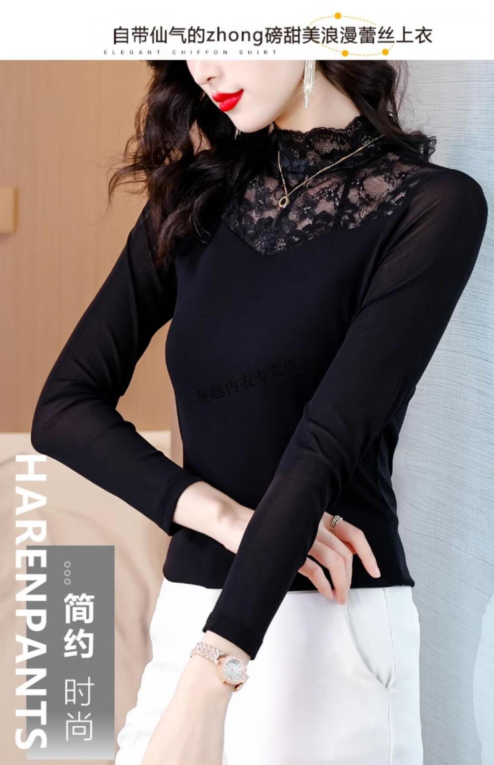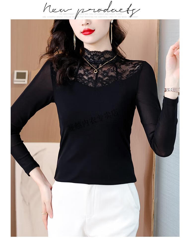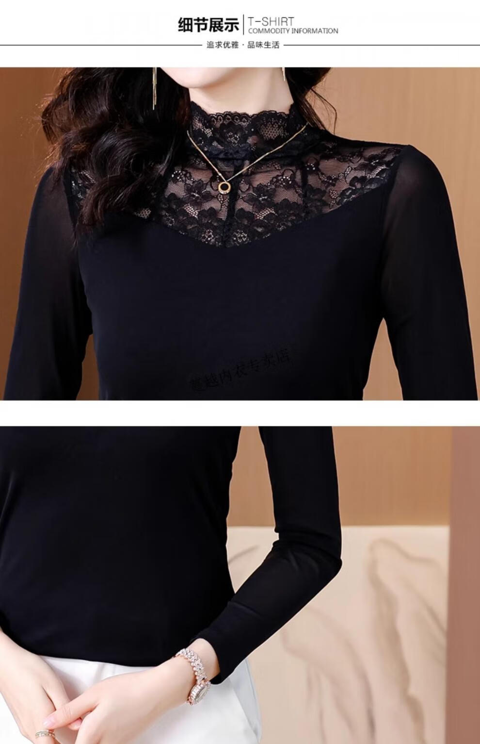 Modal half-high collar lace mesh bottoming shirt long-sleeved women's autumn new slim fit inner shirt slim black T-shirt black regular