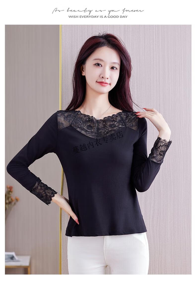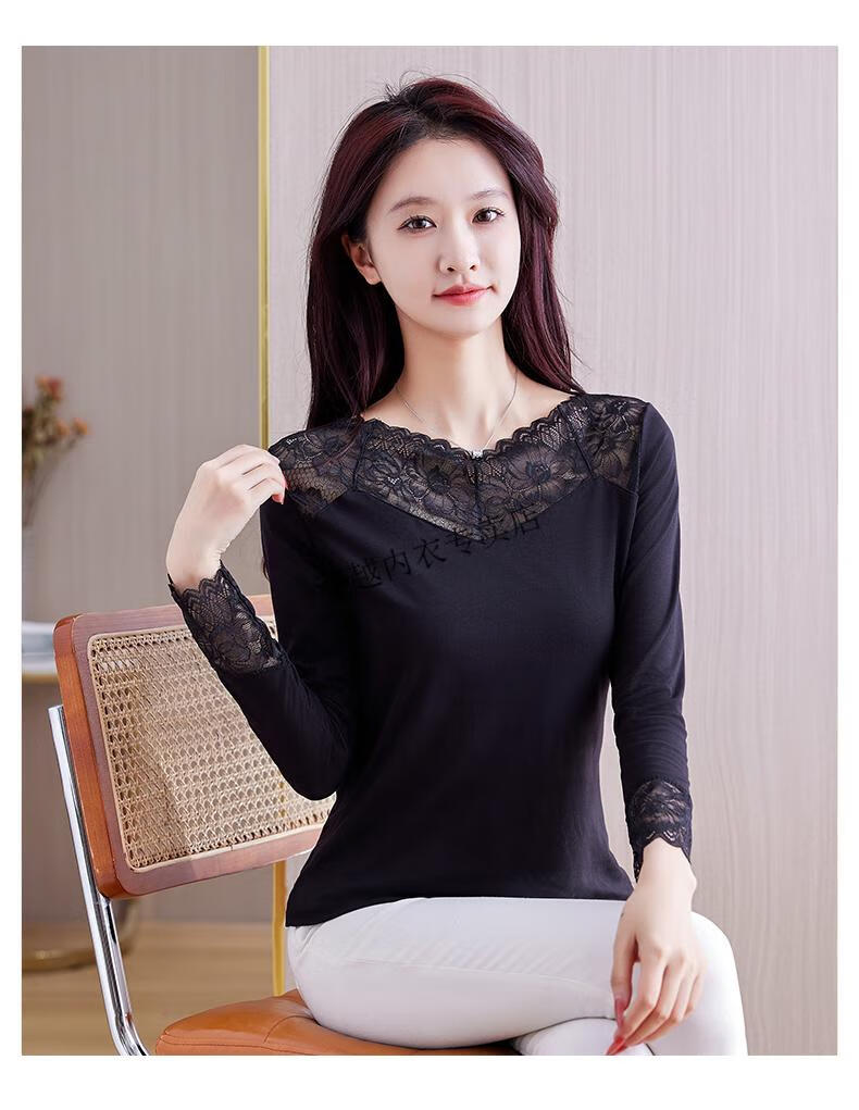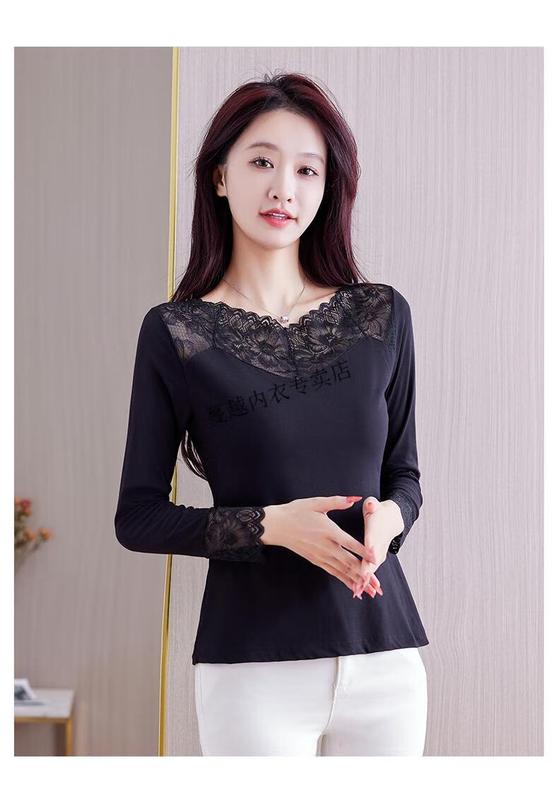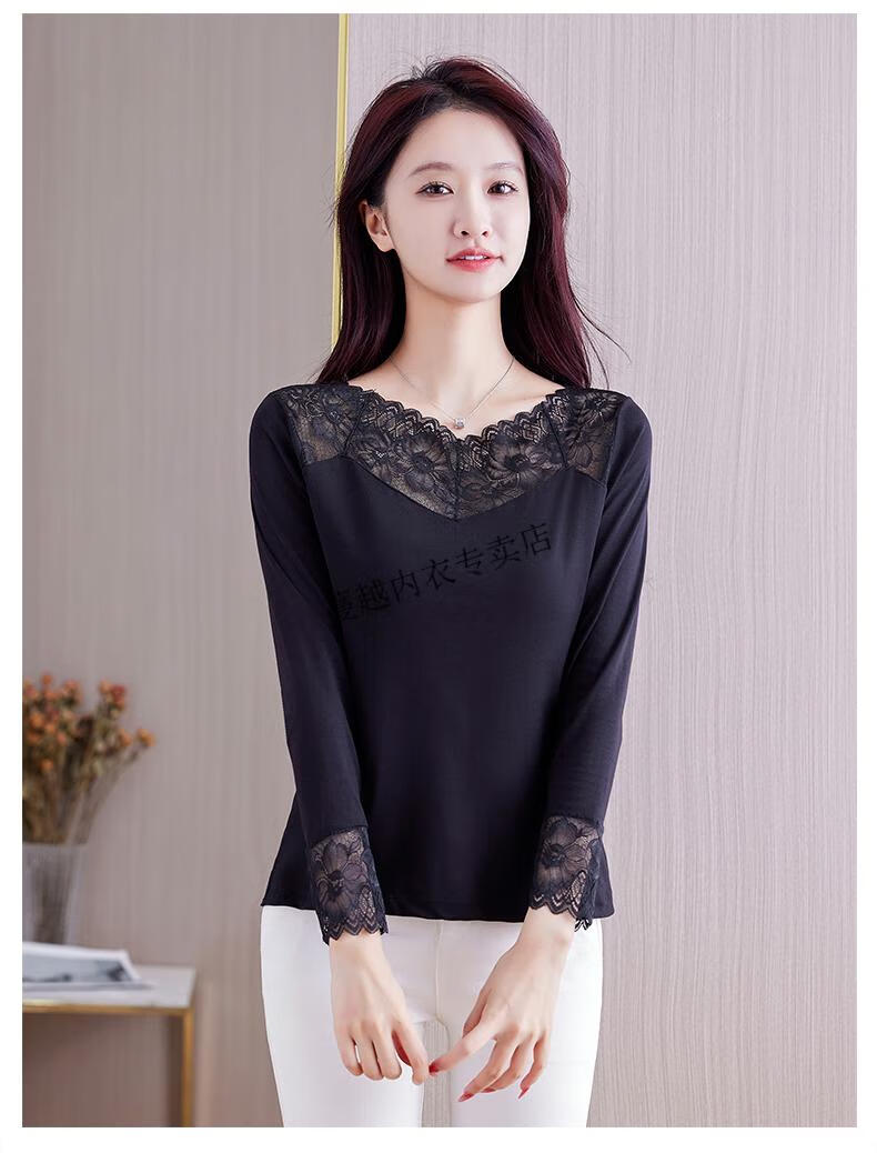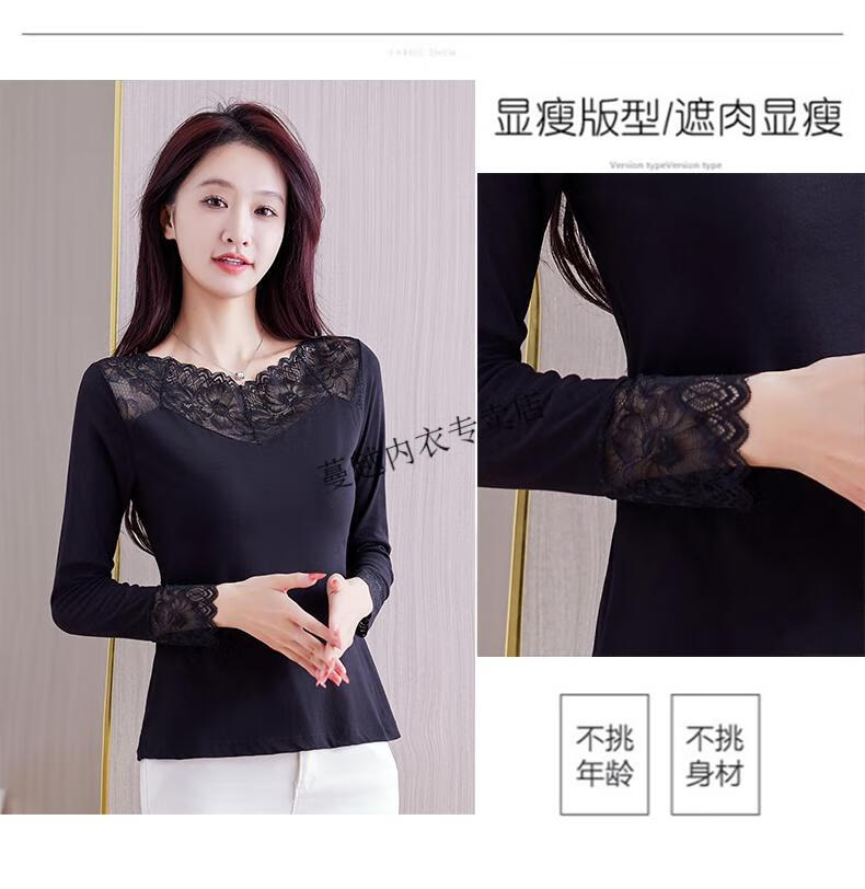 Modal V-neck Modal bottoming shirt for women low-neck versatile lace bottoming shirt 2026 autumn new trend 8145 black V-neck rose lace long-sleeves One size fits all 90kg-130kg