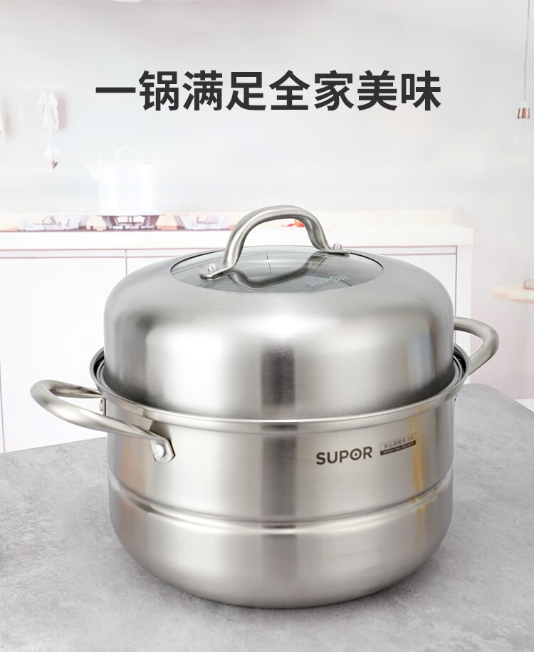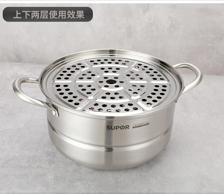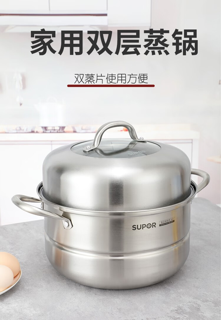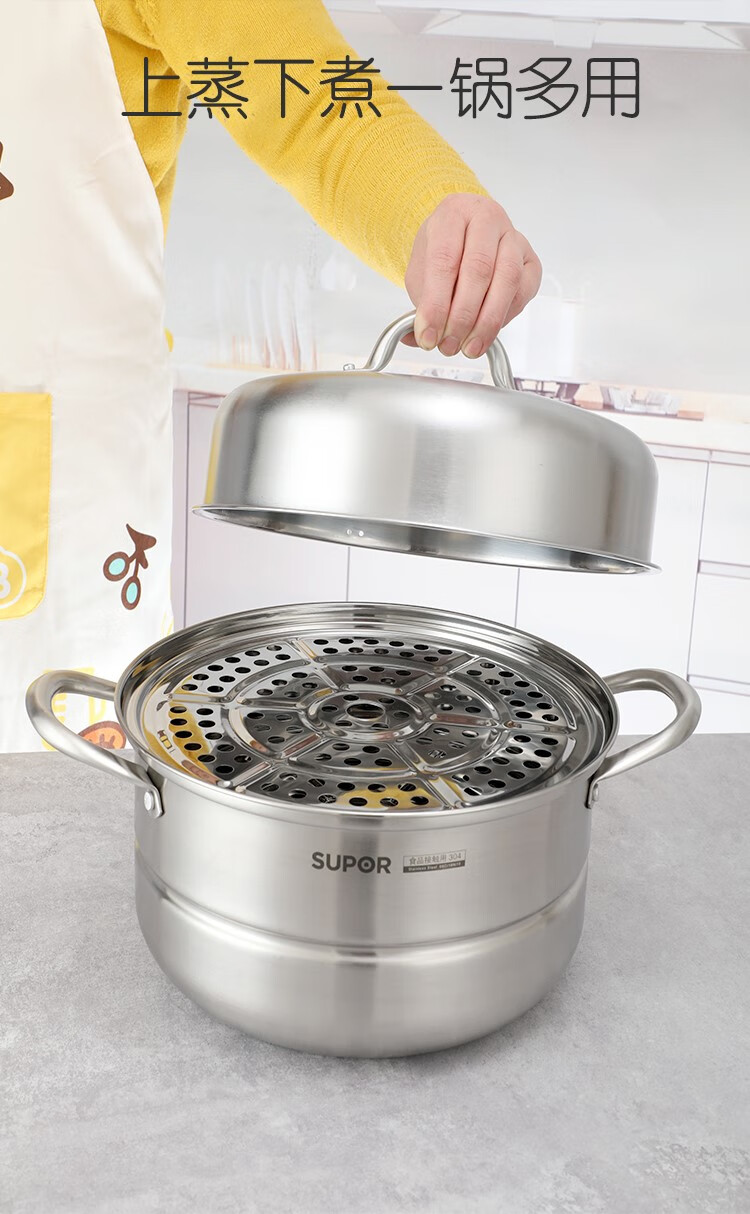 Supor steamer 304 stainless steel double-layer 2-layer integrated single-bottom soup pot for steaming steamed buns and cooking noodles for gas stoves 26 26cm