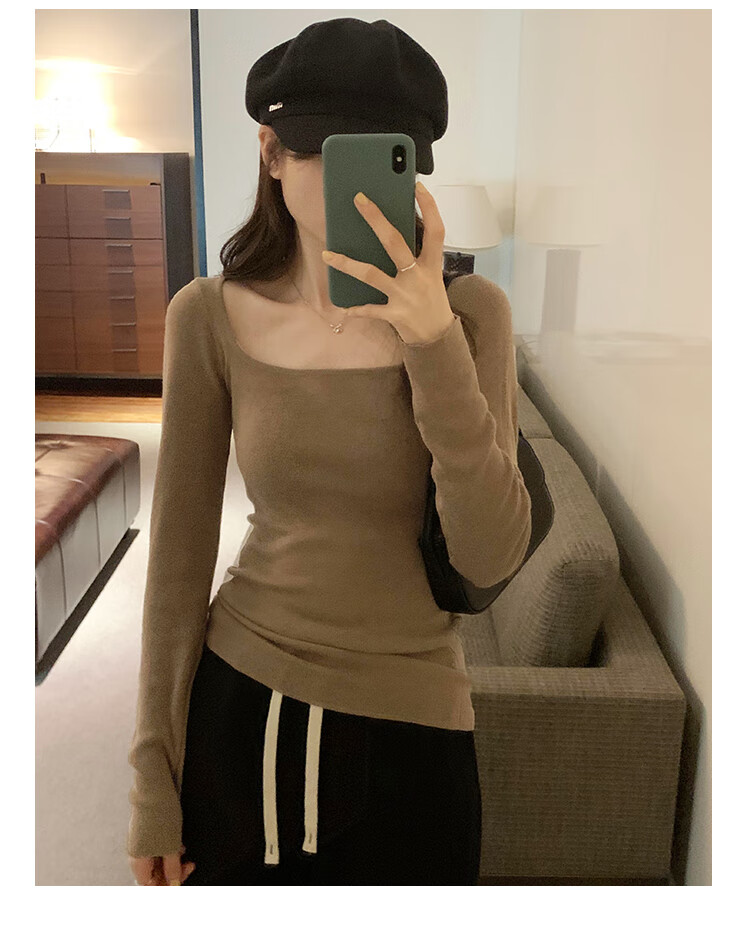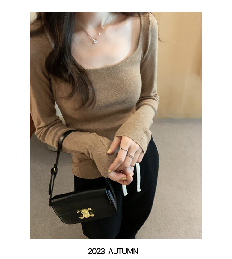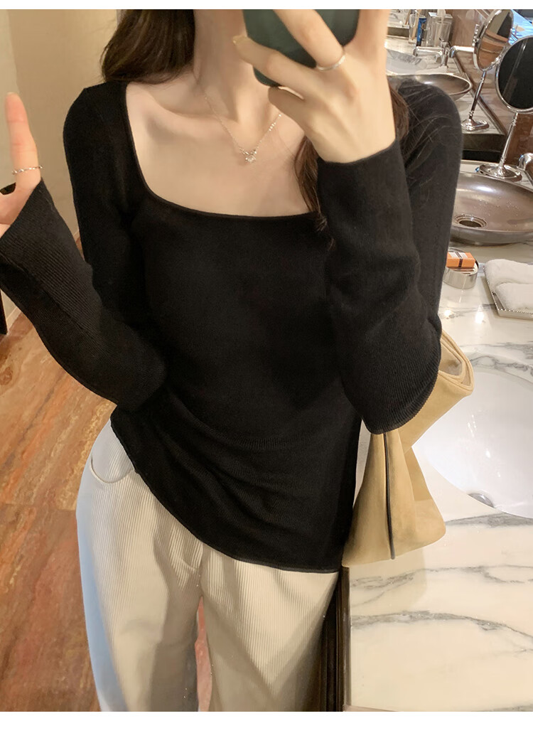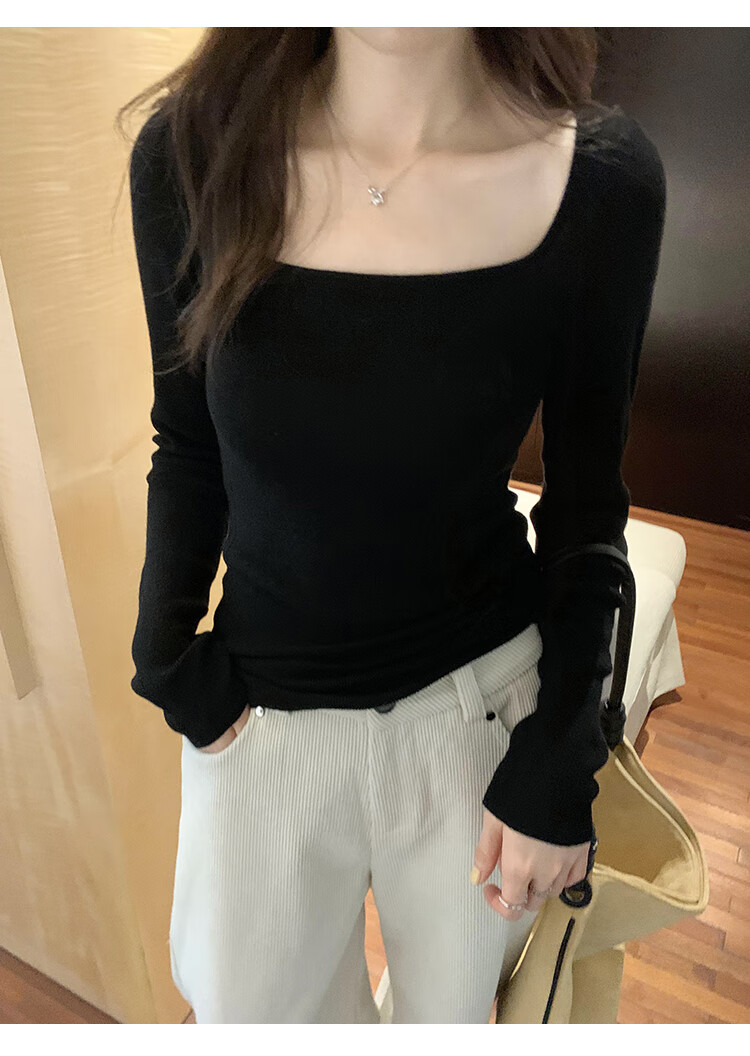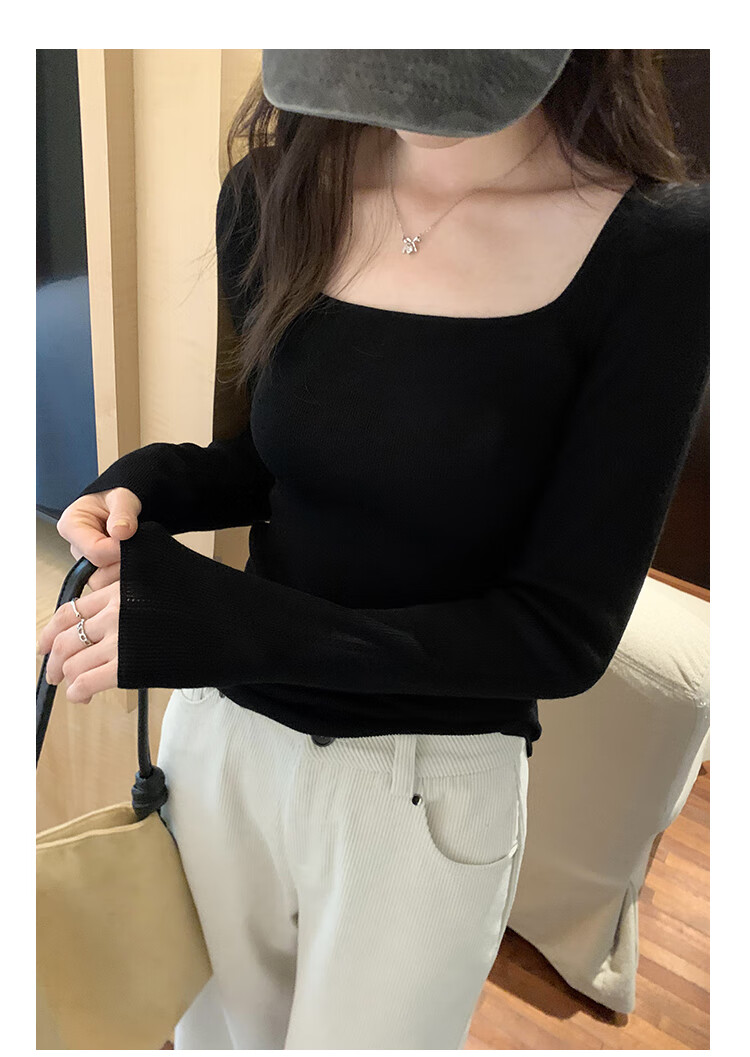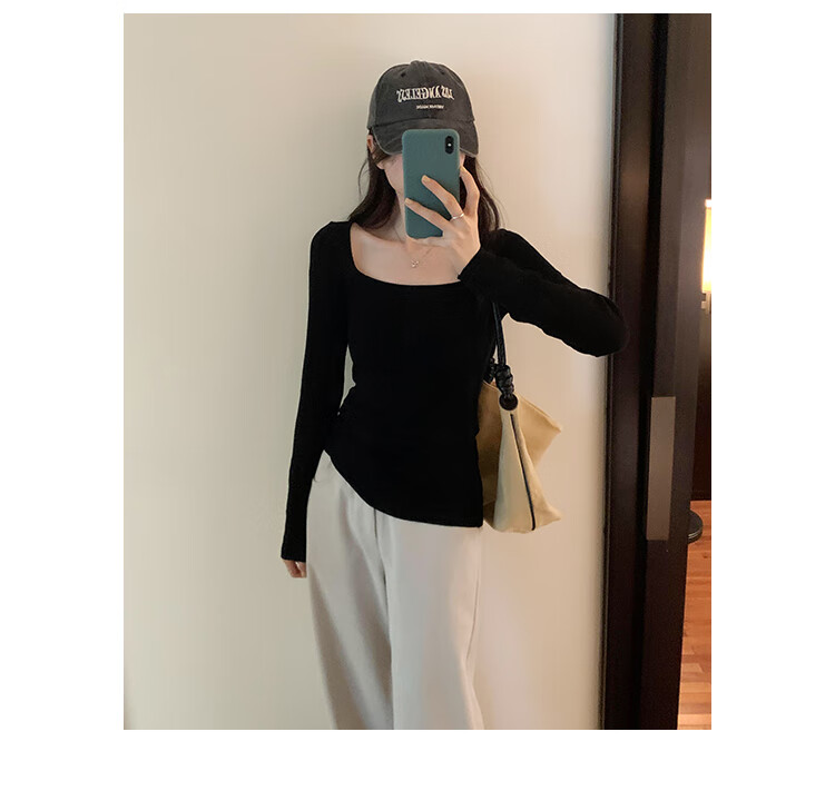 Modal pink square neck knitted bottoming shirt for women in autumn and winter 2024 new coat with slim and stylish low-neck long-sleeved top, black S