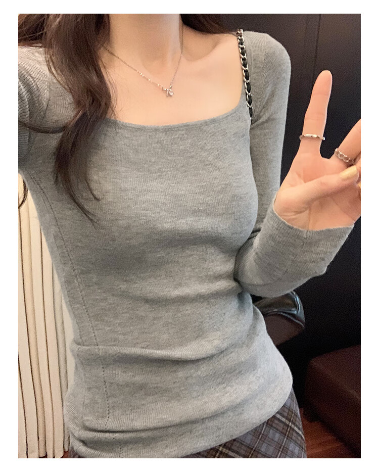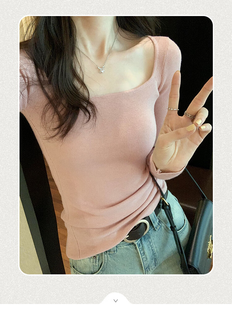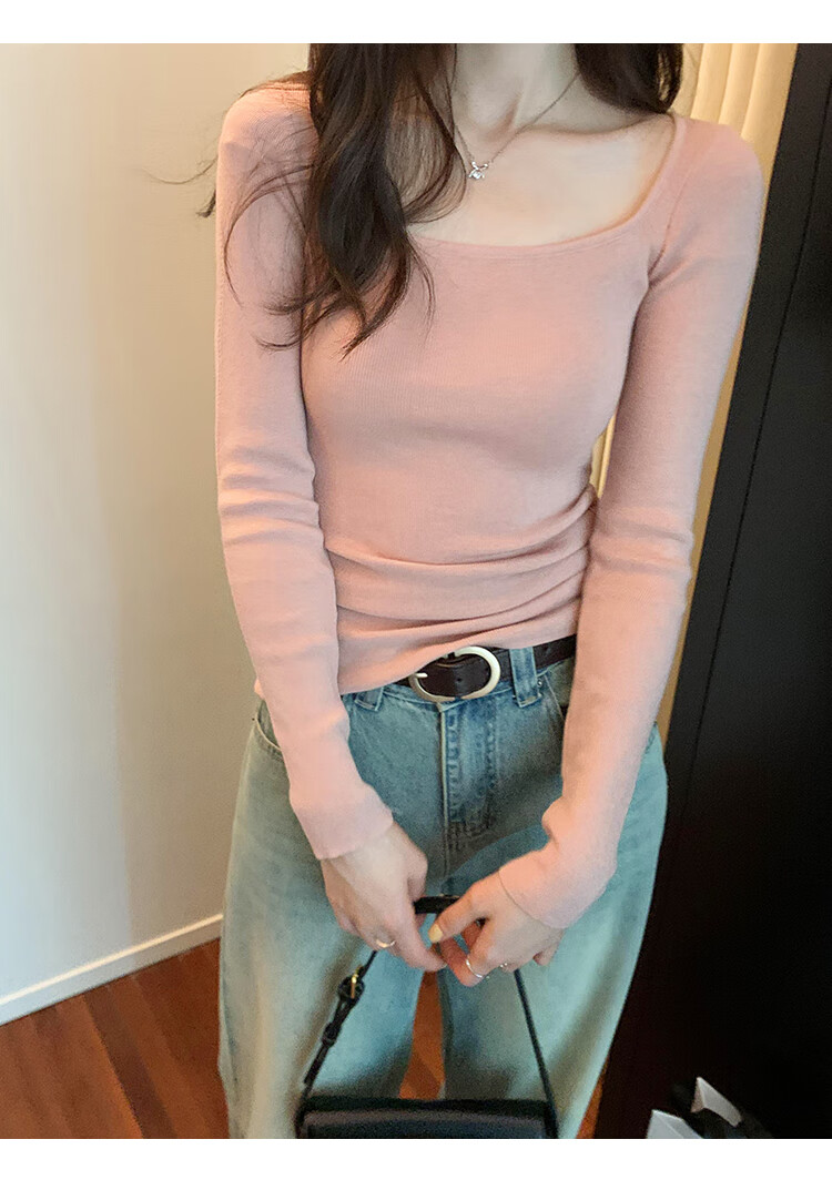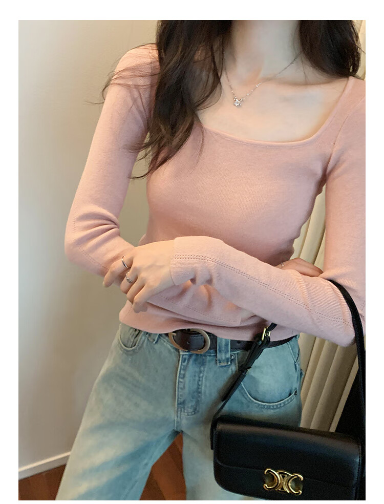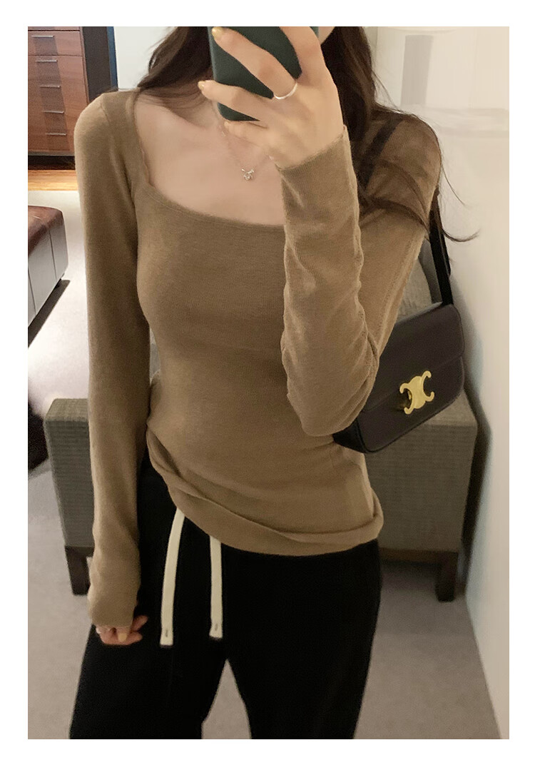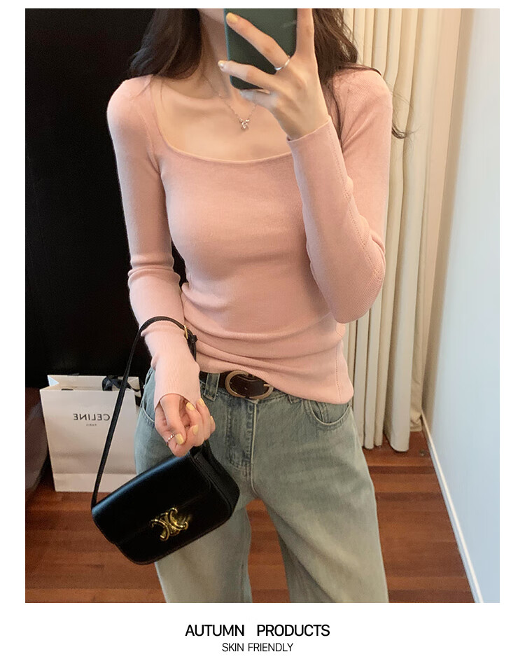 Modal pink square neck knitted bottoming shirt for women in autumn and winter 2024 new coat with slim and stylish low-neck long-sleeved top, black S