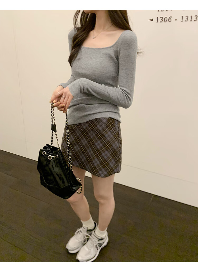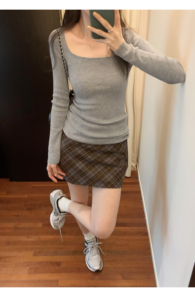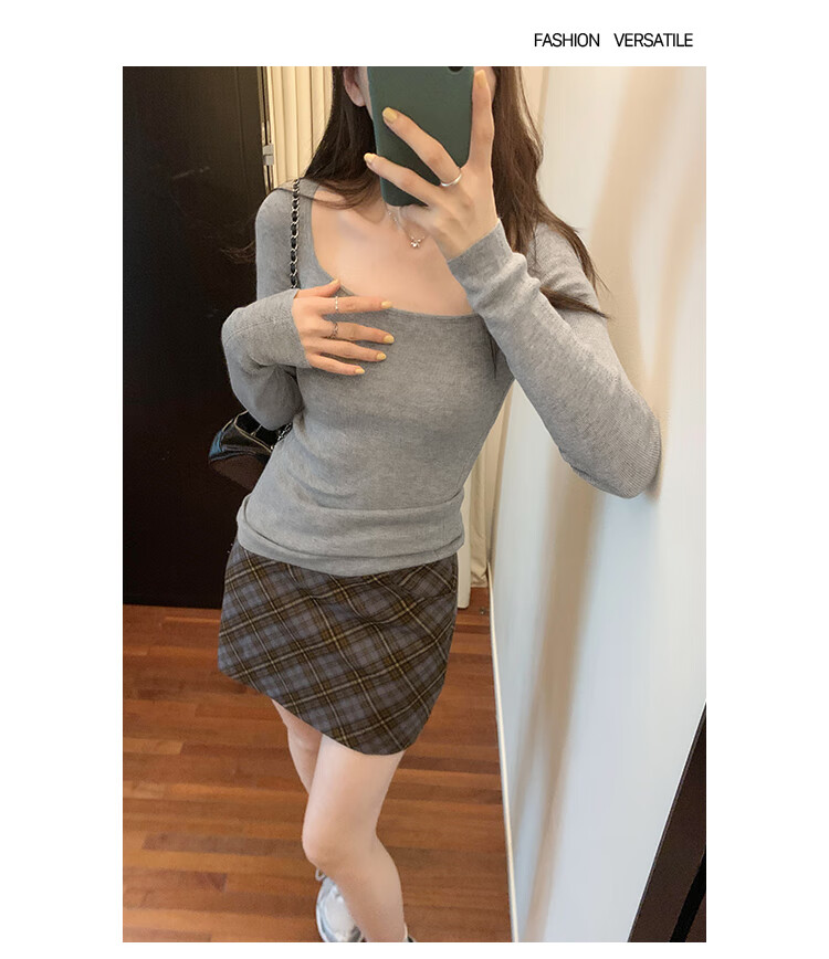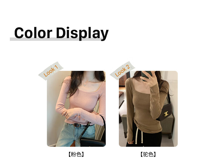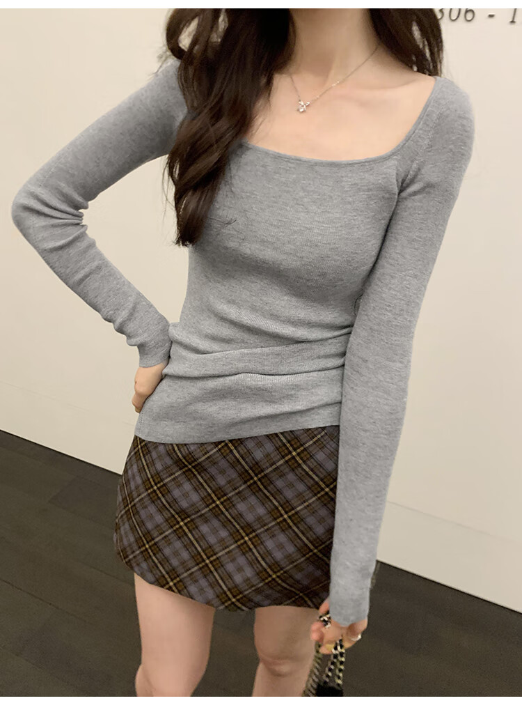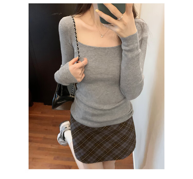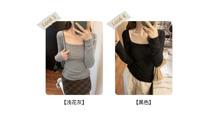 Modal pink square neck knitted bottoming shirt for women in autumn and winter 2024 new coat with slim and stylish low-neck long-sleeved top, black S