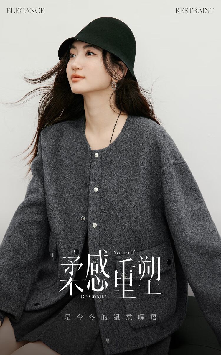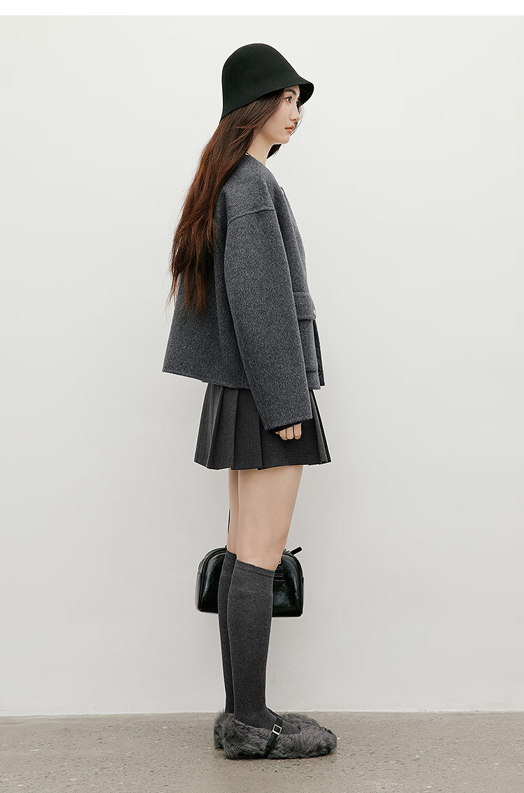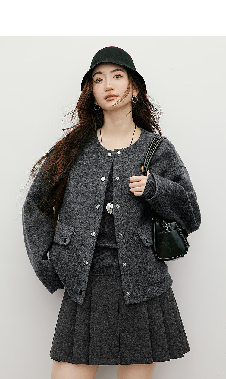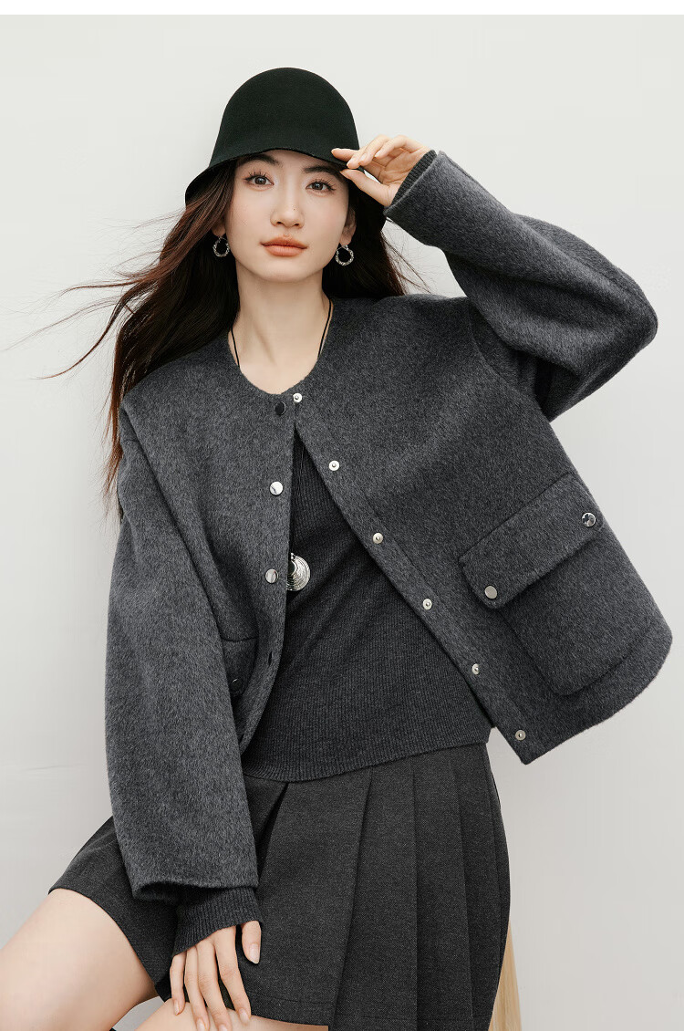 Red sleeve work style woolen coat 2025 winter new women's round neck light and mature temperament short double-sided woolen coat Ash 056 S