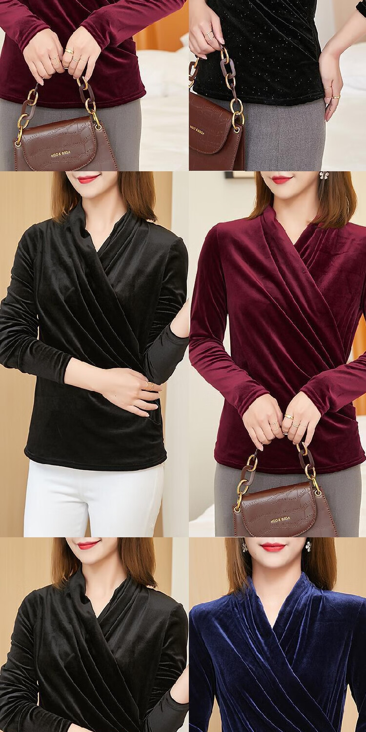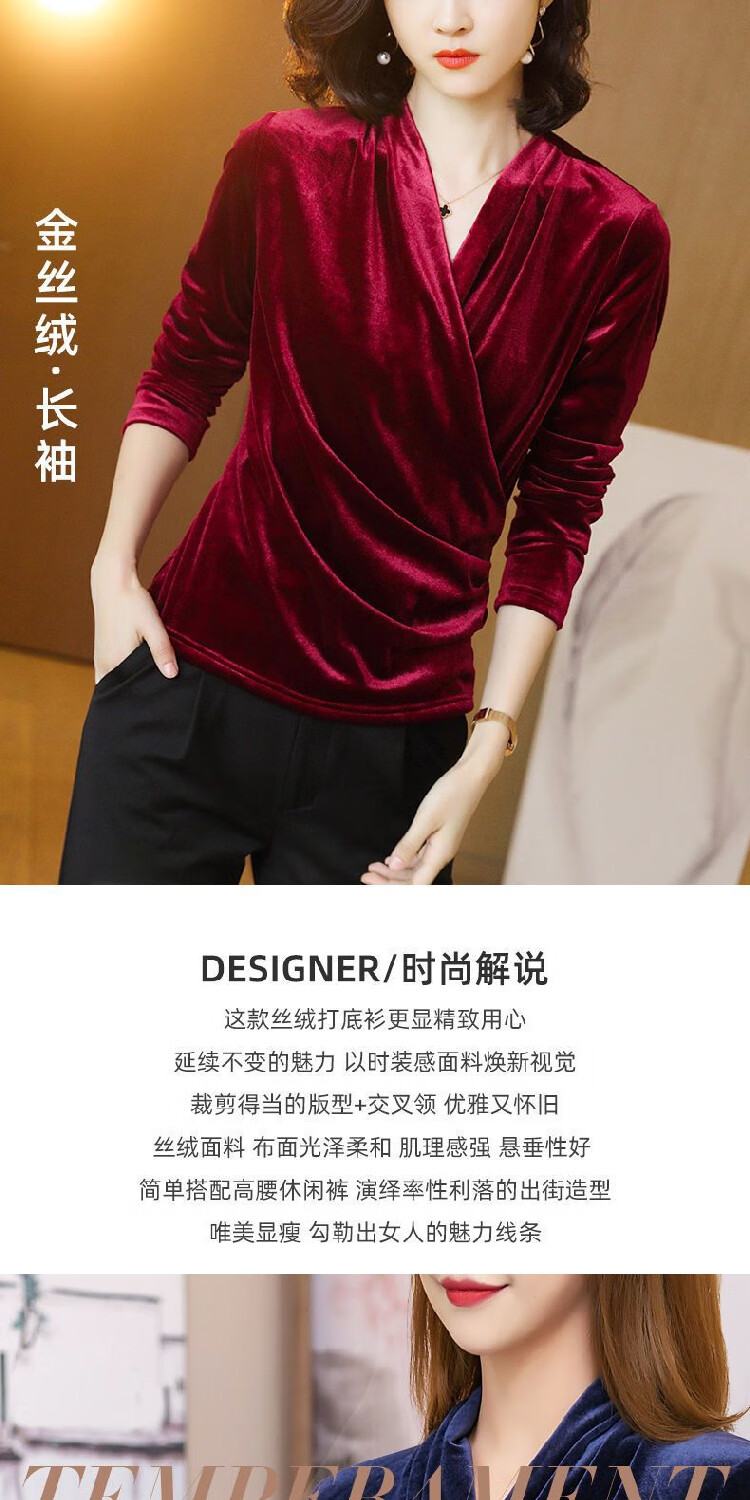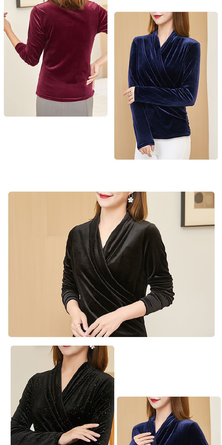 Black V-neck autumn top for women, slim waisted long-sleeved gold velvet European style fashionable European station T-shirt for women blue velvet thickened 2XL recommended 135-150 catties