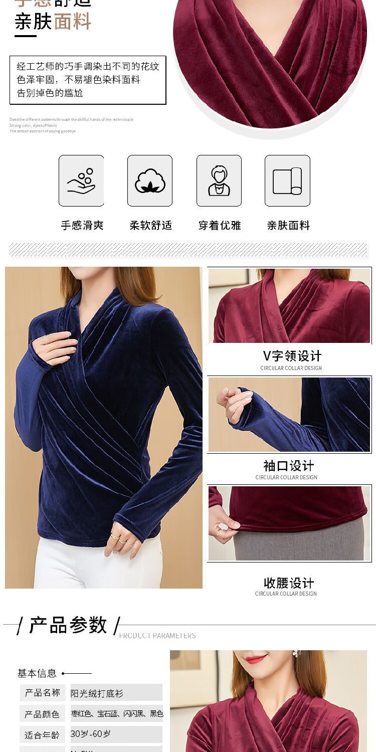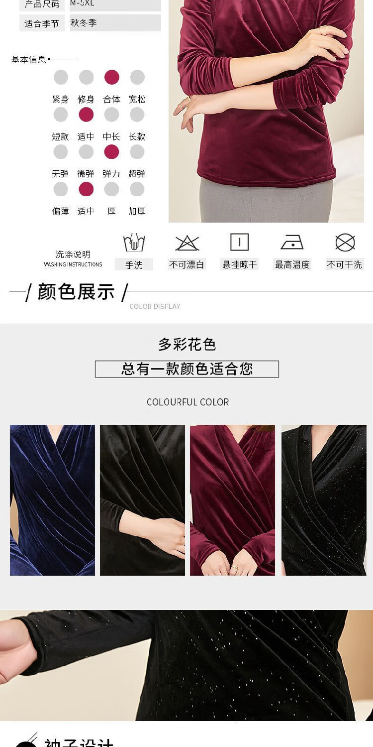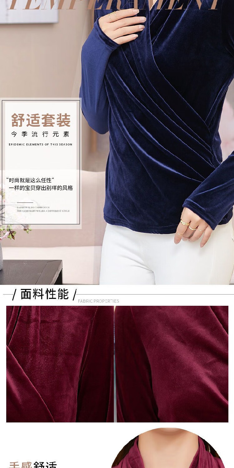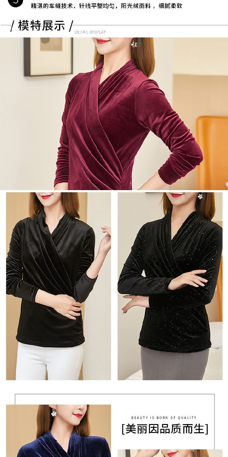 Black V-neck autumn top for women, slim waisted long-sleeved gold velvet European style fashionable European station T-shirt for women blue velvet thickened 2XL recommended 135-150 catties