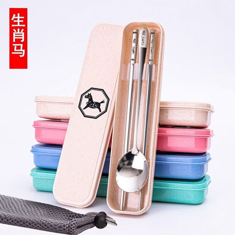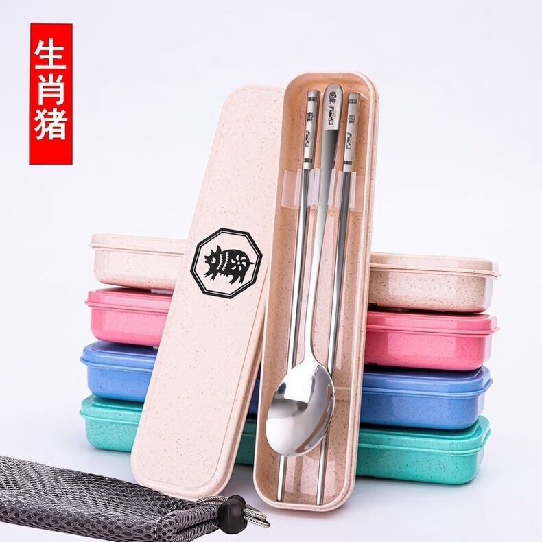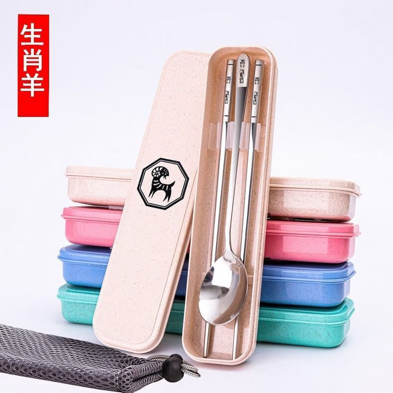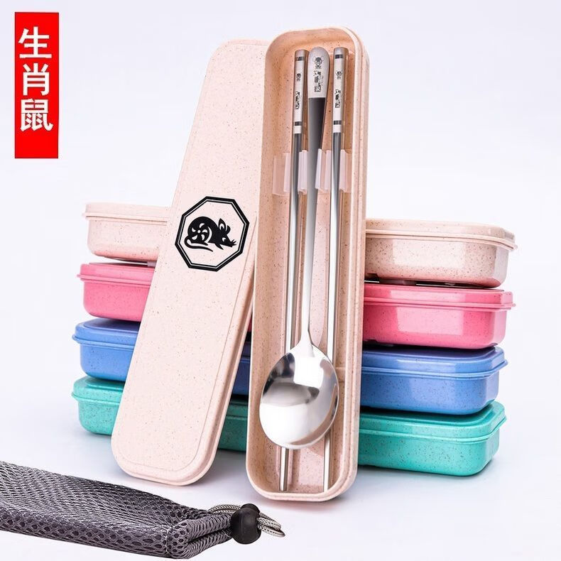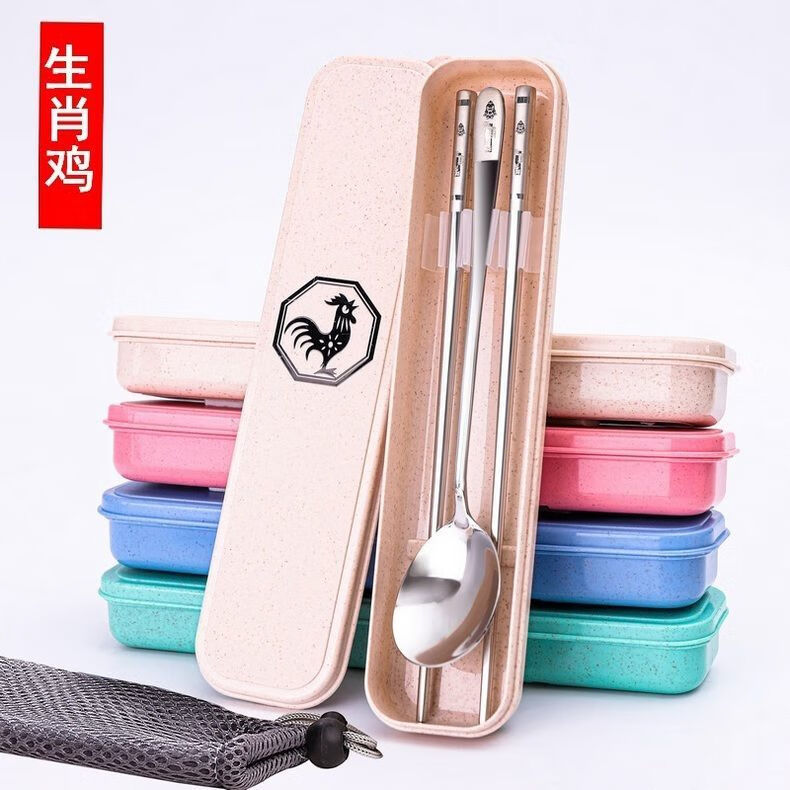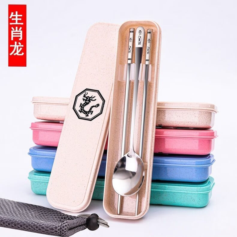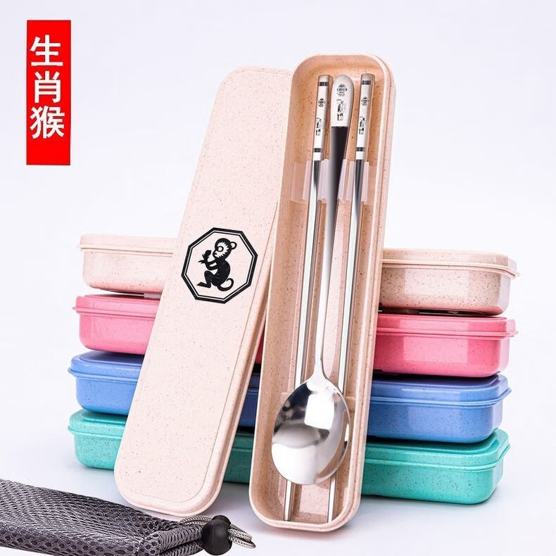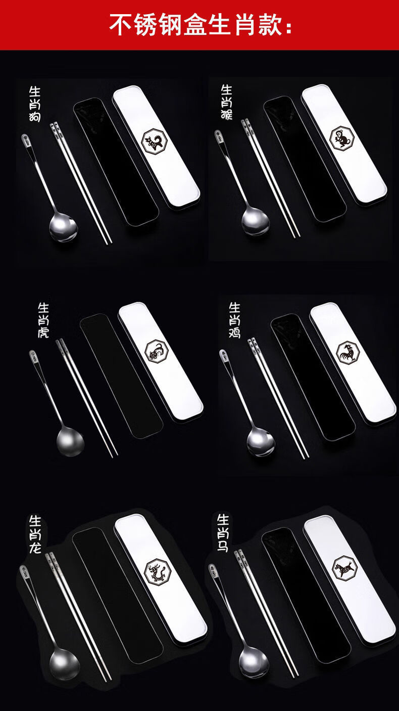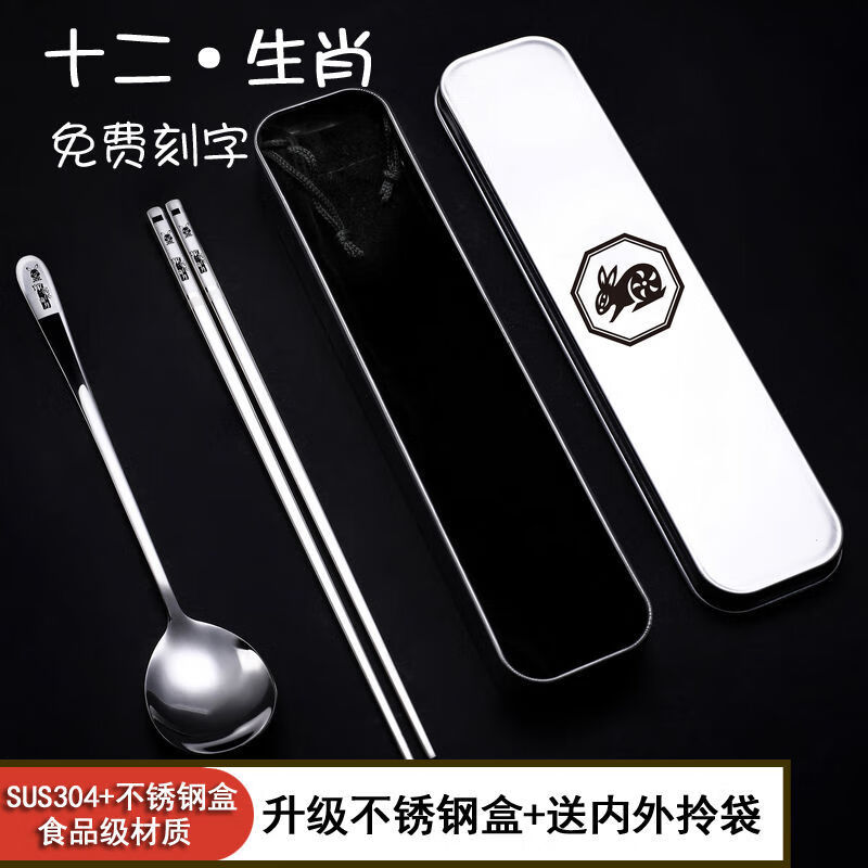 MZXM Japan imported quality stainless steel box with engraving, portable tableware, zodiac sign 304 chopsticks spoon 304 chopsticks spoon-(zodiac dog) plastic box style