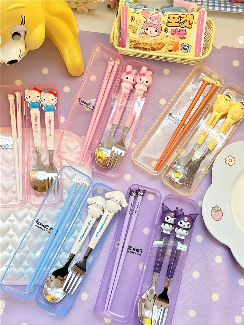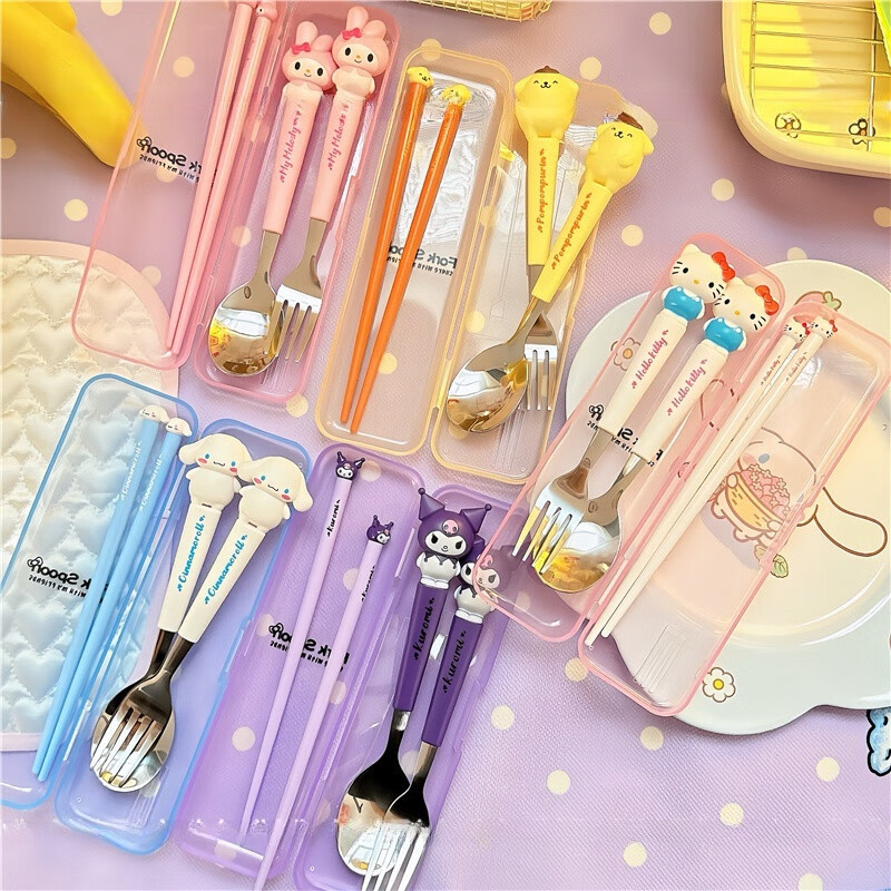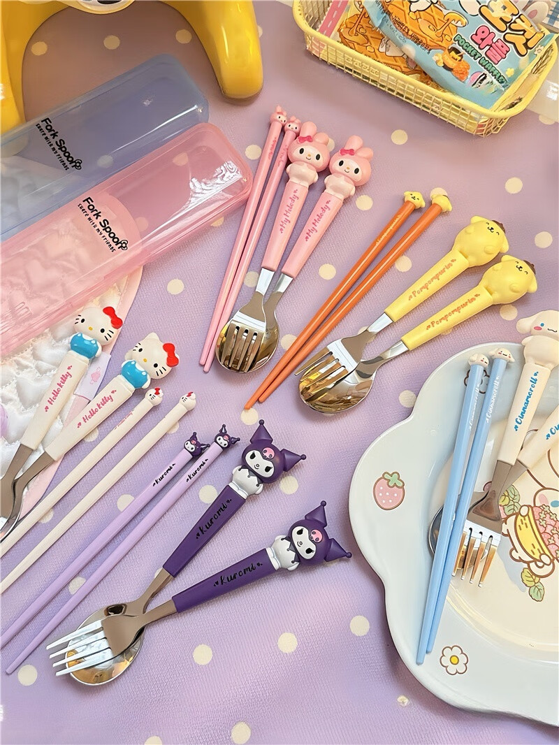 MZXM Japanese imported high-quality styling tableware children's set Kuromi big-eared dog stainless steel fork students can bring rice with styling library standing abs chopsticks + spoon + fork color box recommended