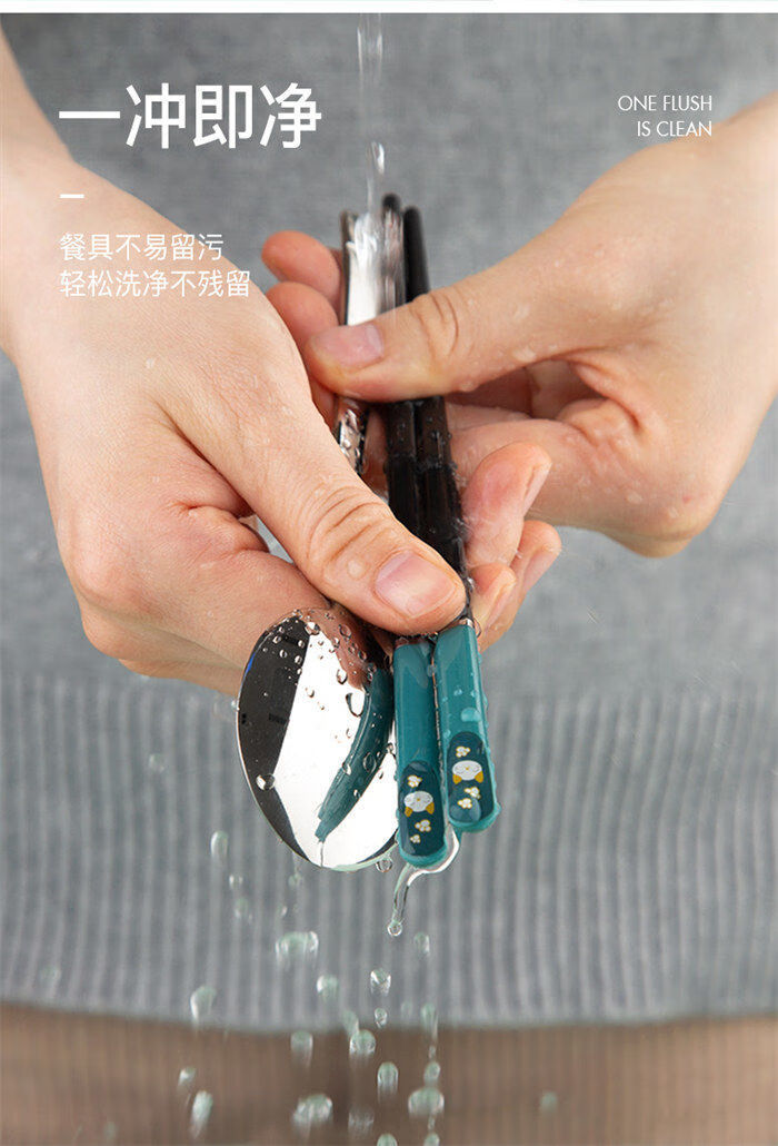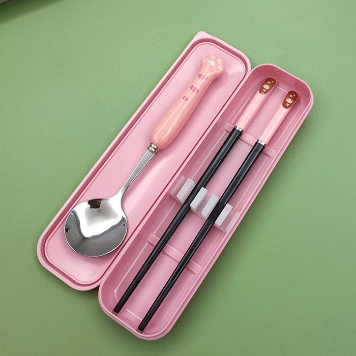 MZXM Japan imported quality primary school student cartoon chopsticks and spoon set cute children's portable stainless steel tableware three pieces color box blue radish + cat chopsticks