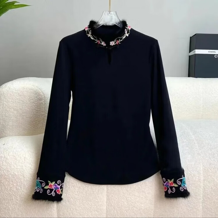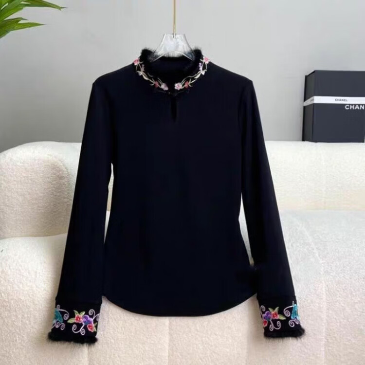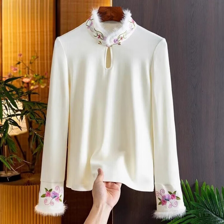 Pierre Cardin autumn and winter new German velvet national style embroidered bottoming shirt autumn plus velvet 200 pounds new Chinese style plate button long-sleeved T-shirt for women white 2XL suitable for about 135-150 pounds