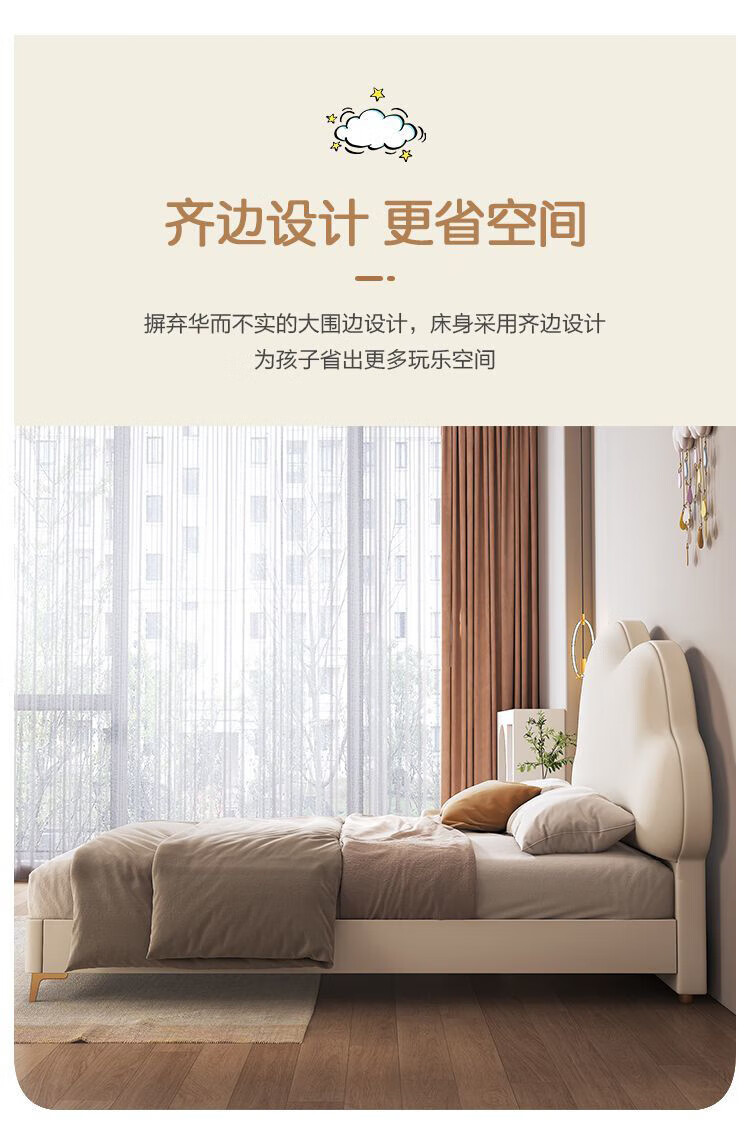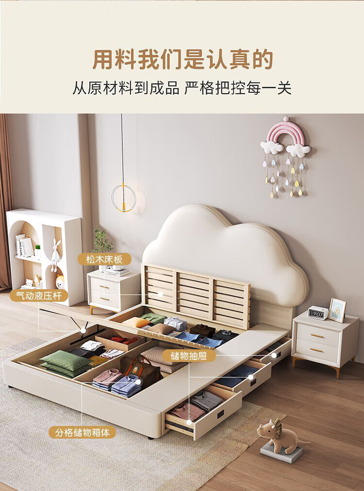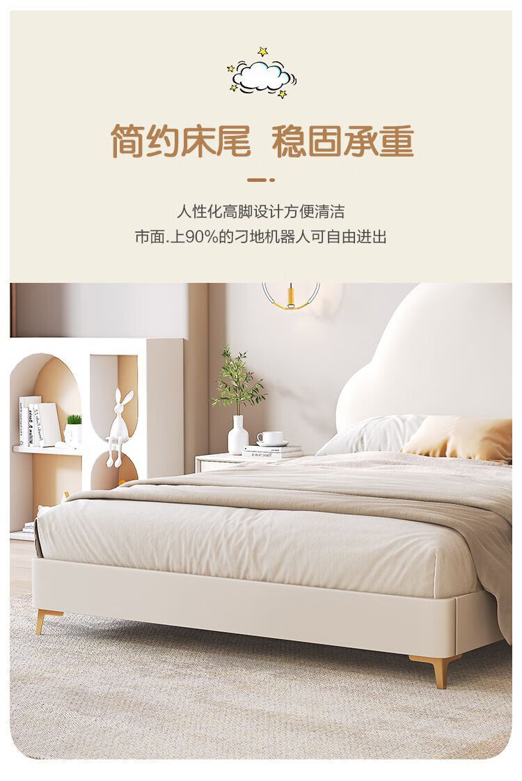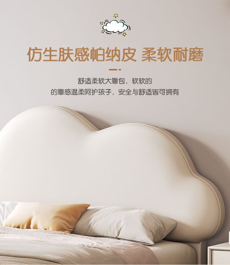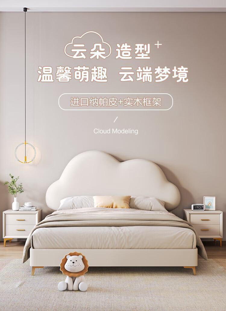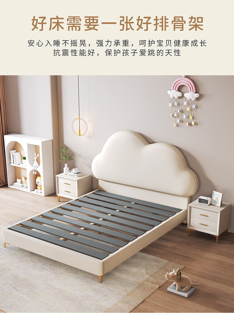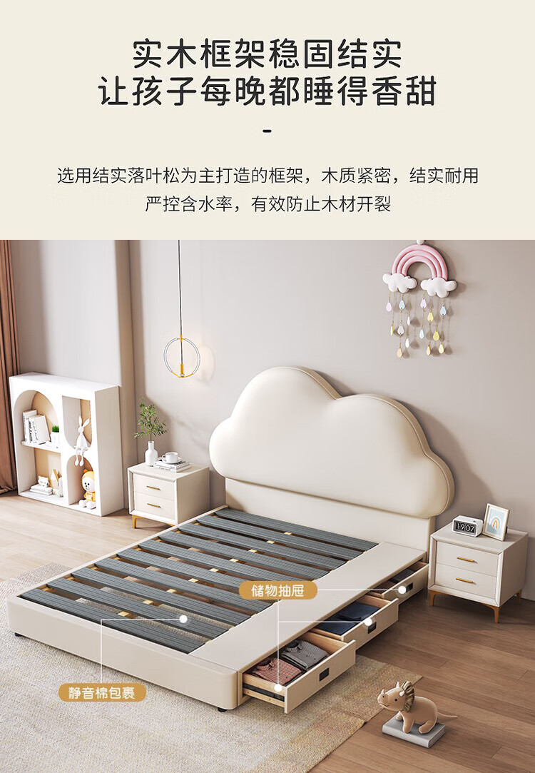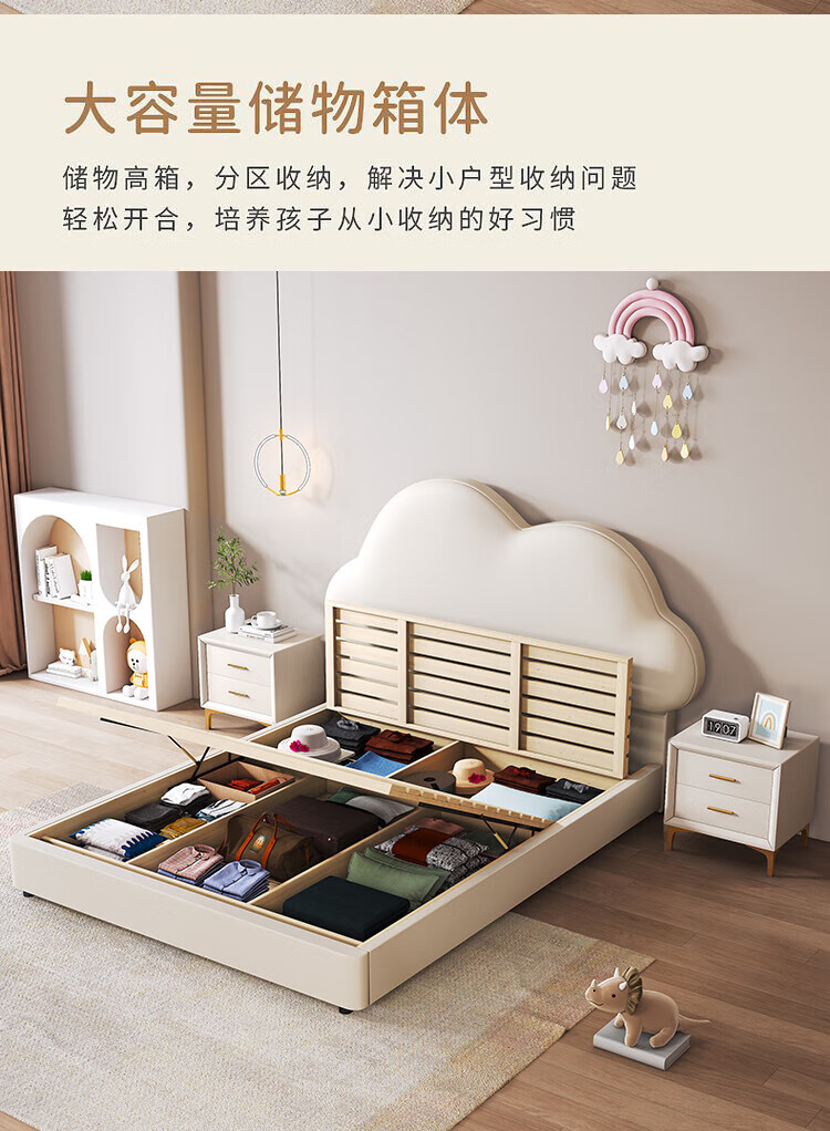 Cream Wind Cloud Children's Leather Bed Modern Simple Solid Wood Double Bed Boys and Girls Princess Bed Cartoon Storage Bed Quality/Children's Bed Color Note/Delivery to Home 1200mm*2000mm Frame Structure