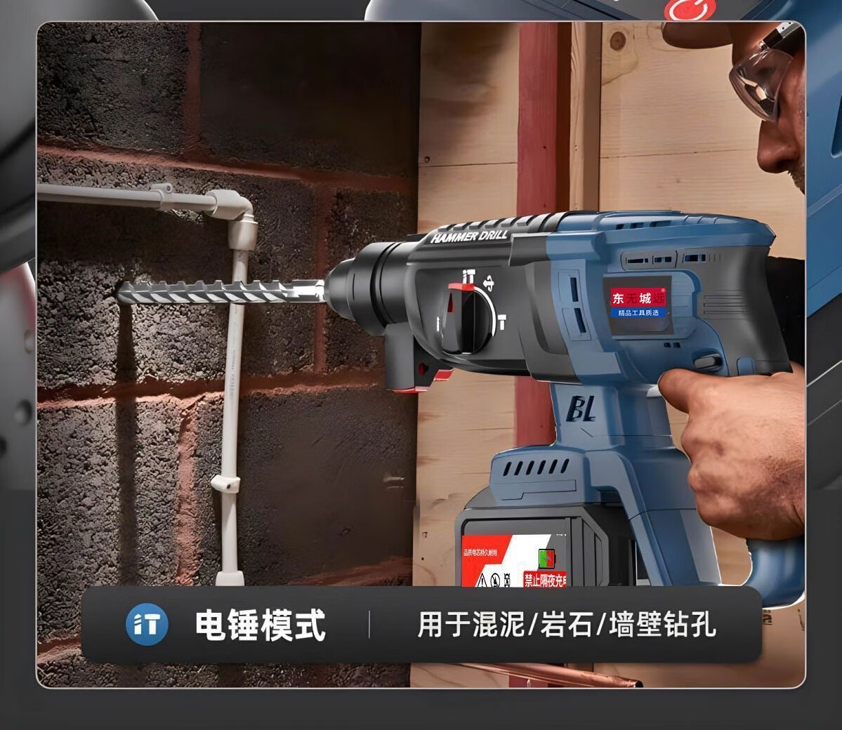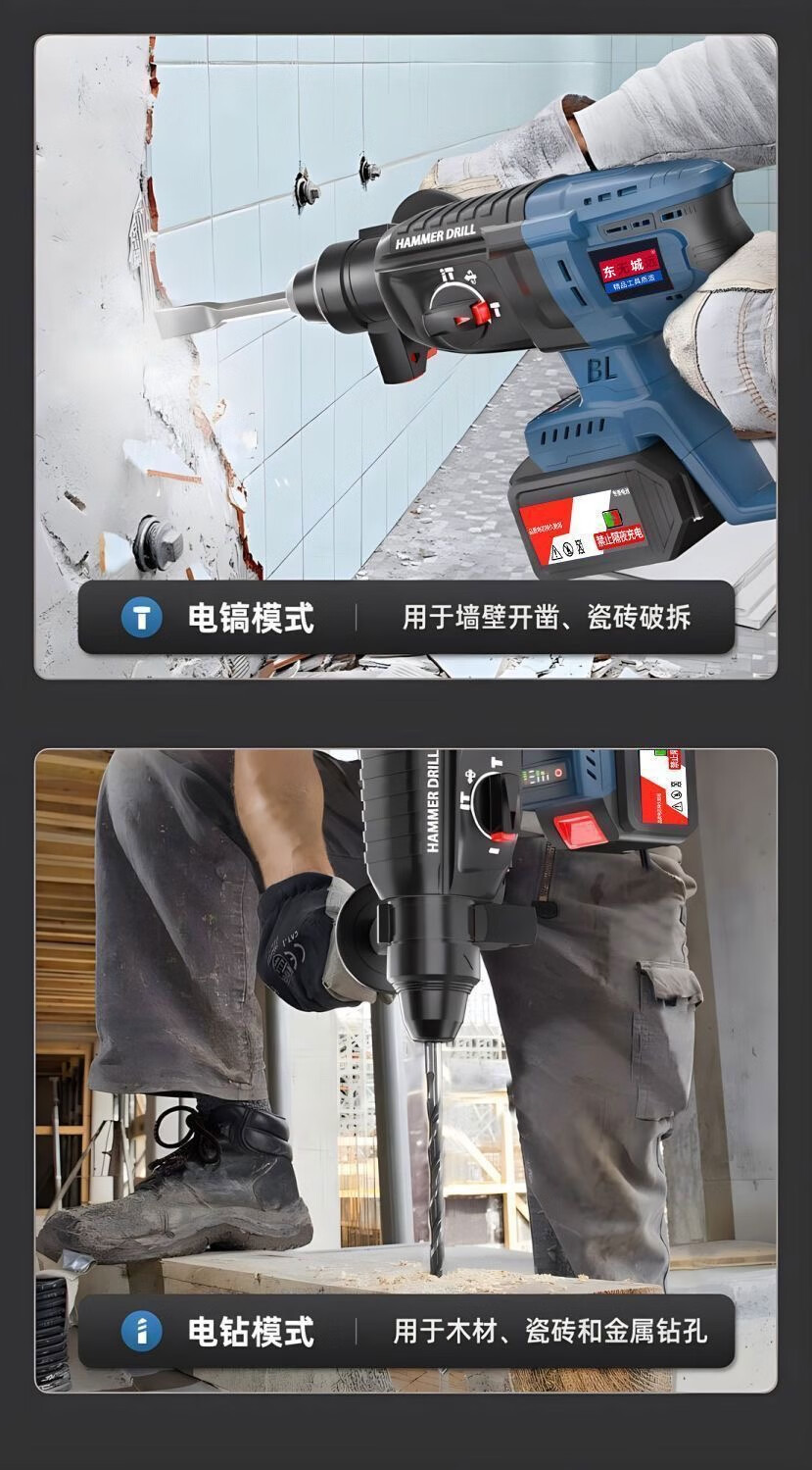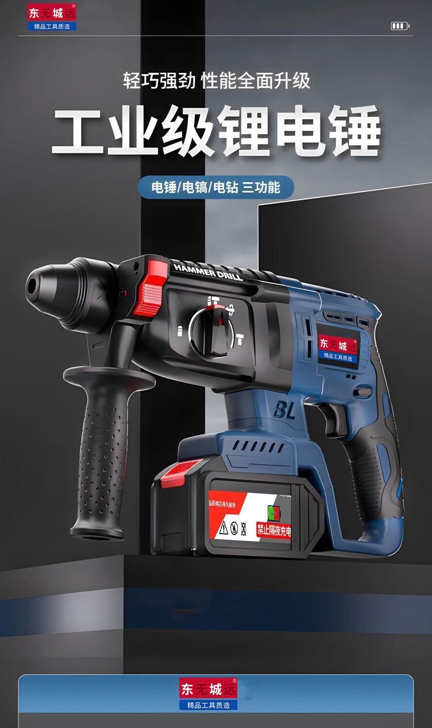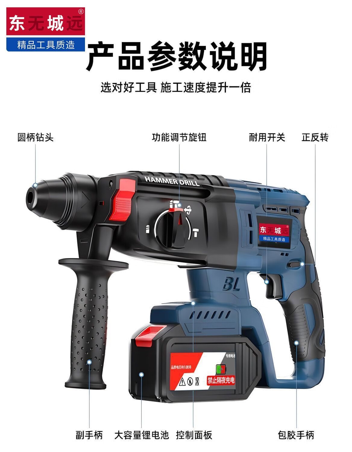 Dongcheng style brushless electric hammer rechargeable lithium battery pick high power concrete wall hole three-purpose impact drill for home use industrial grade 20 cells two batteries one charge + plastic box