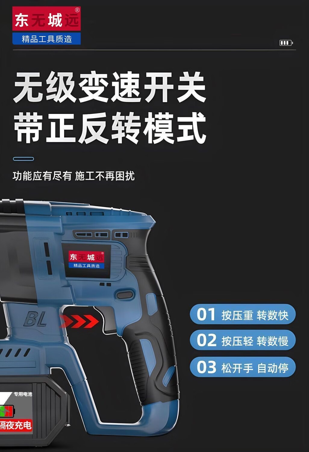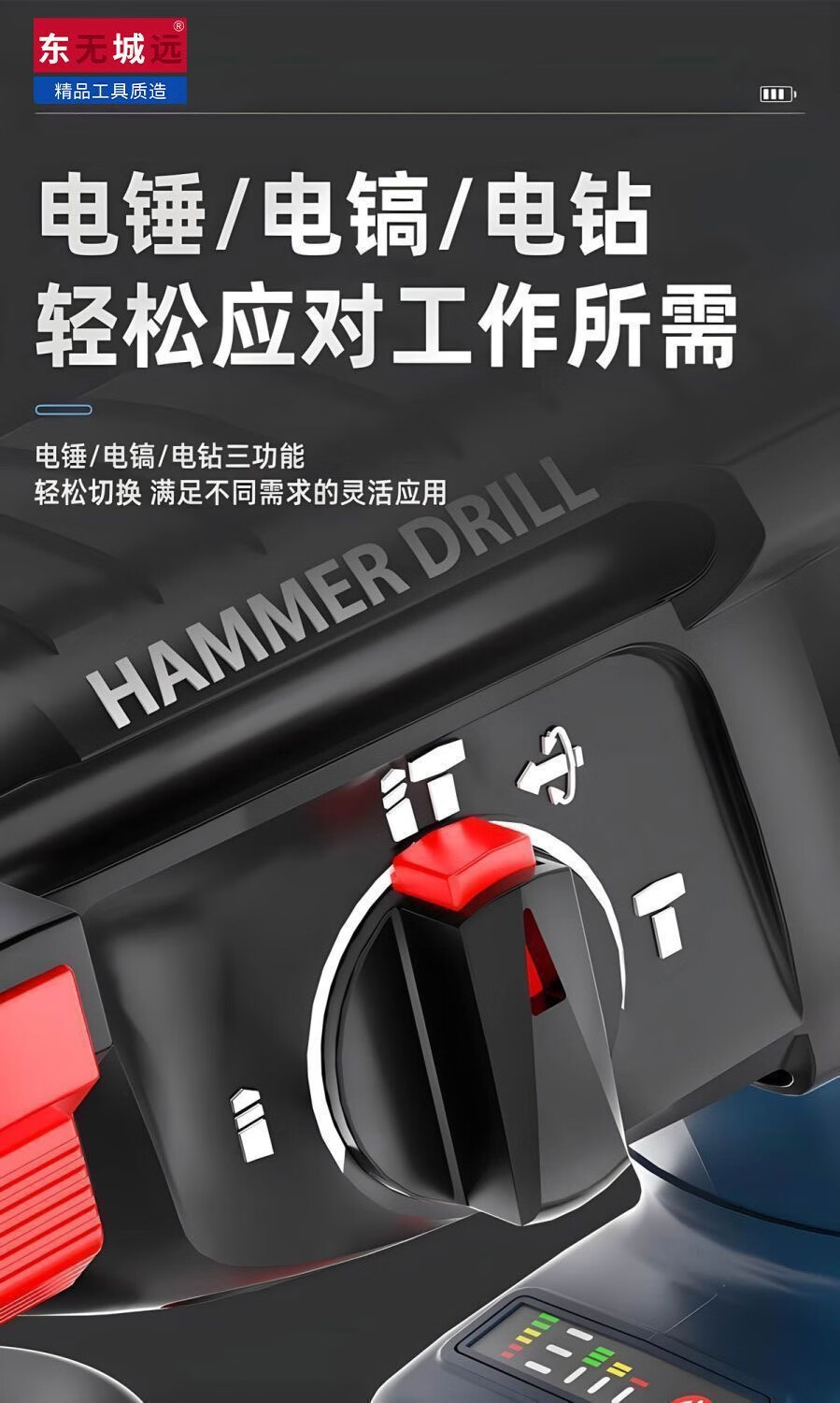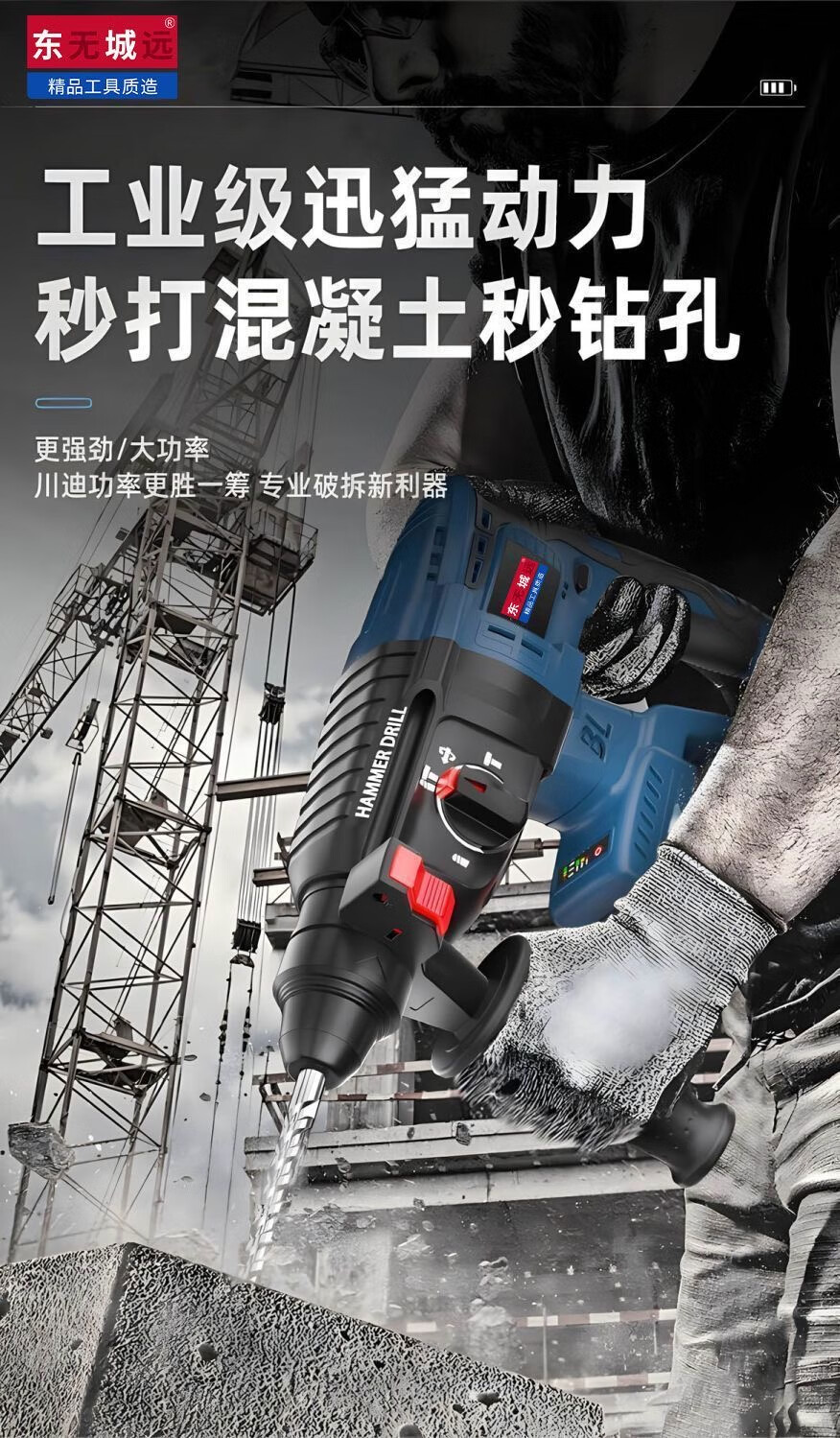 Dongcheng style brushless electric hammer rechargeable lithium battery pick high power concrete wall hole three-purpose impact drill for home use industrial grade 20 cells two batteries one charge + plastic box