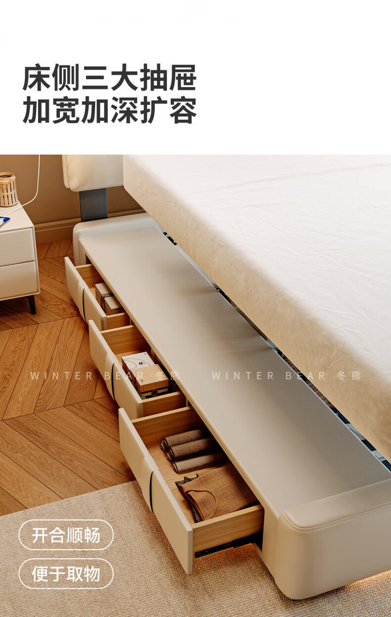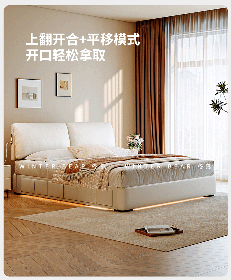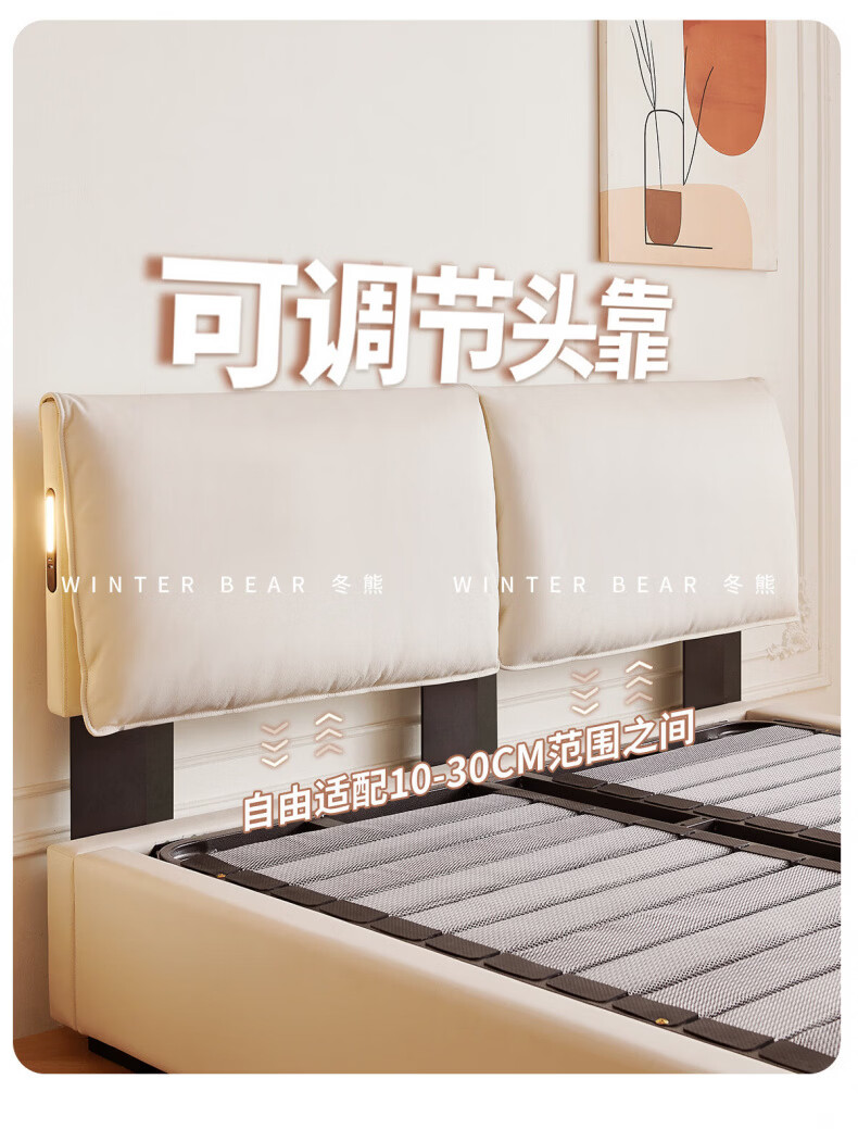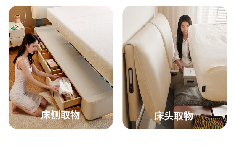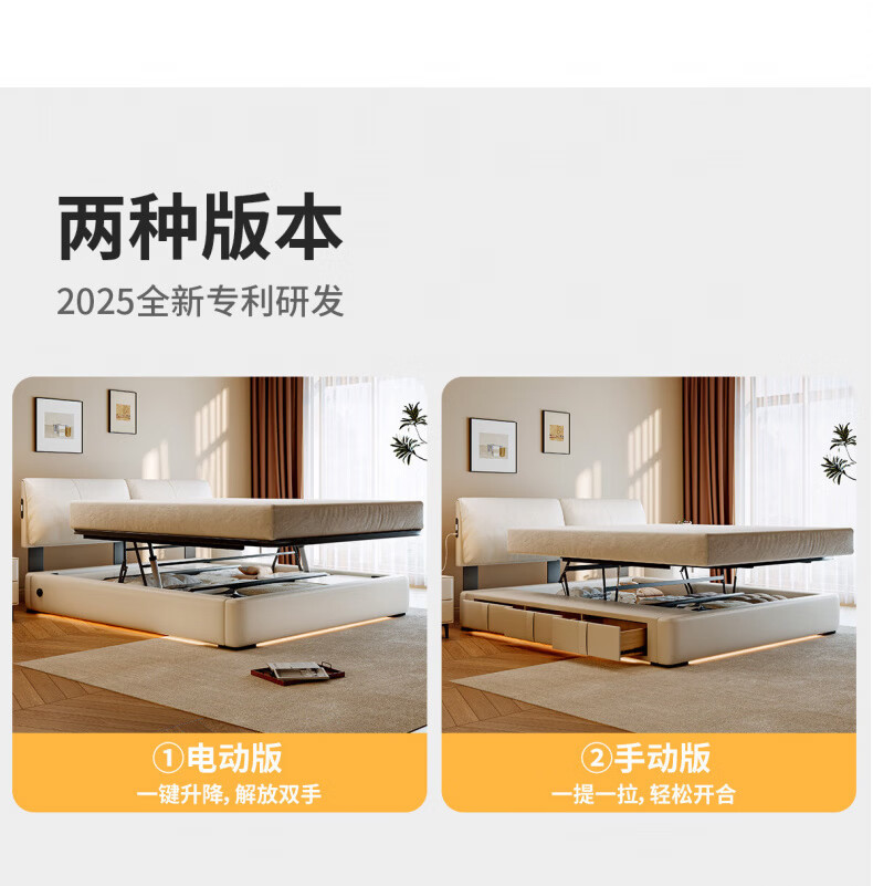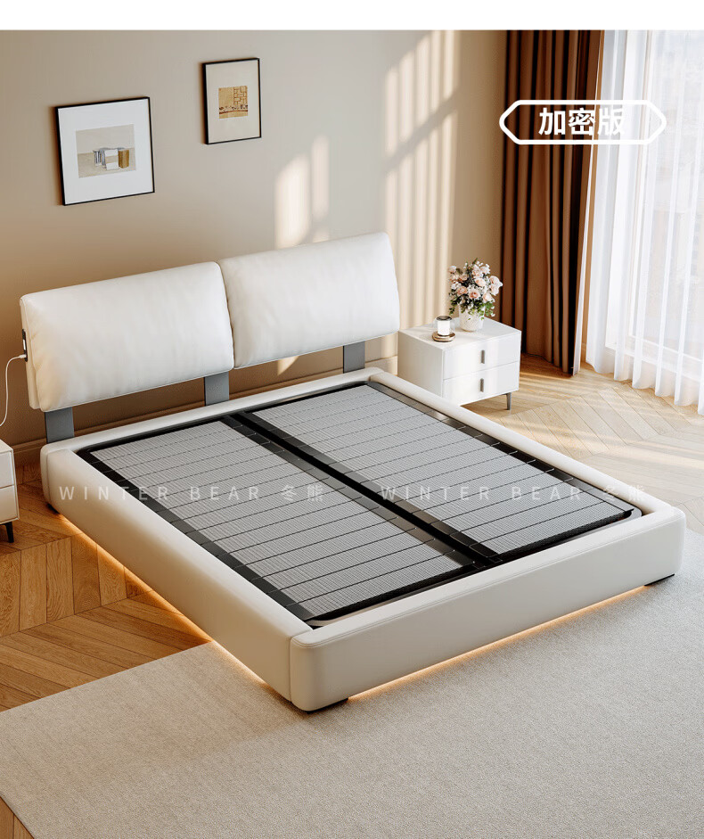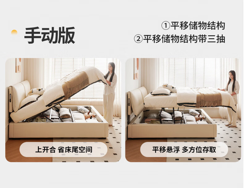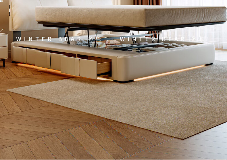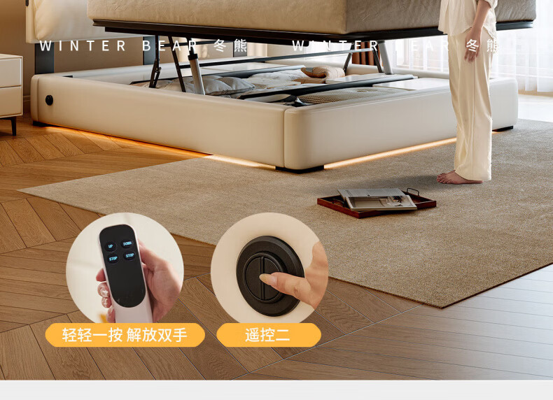 Dongxiong Ultra-Thin Leather Bedside Bed Master Bedroom Small Apartment Adjustable Double Elephant Ears High Box Storage Translation Bed Smart Version Imported Cowhide/All Solid Wood Beech Rib Frame 1500mm*2000mm Electric Translation Storage Structure