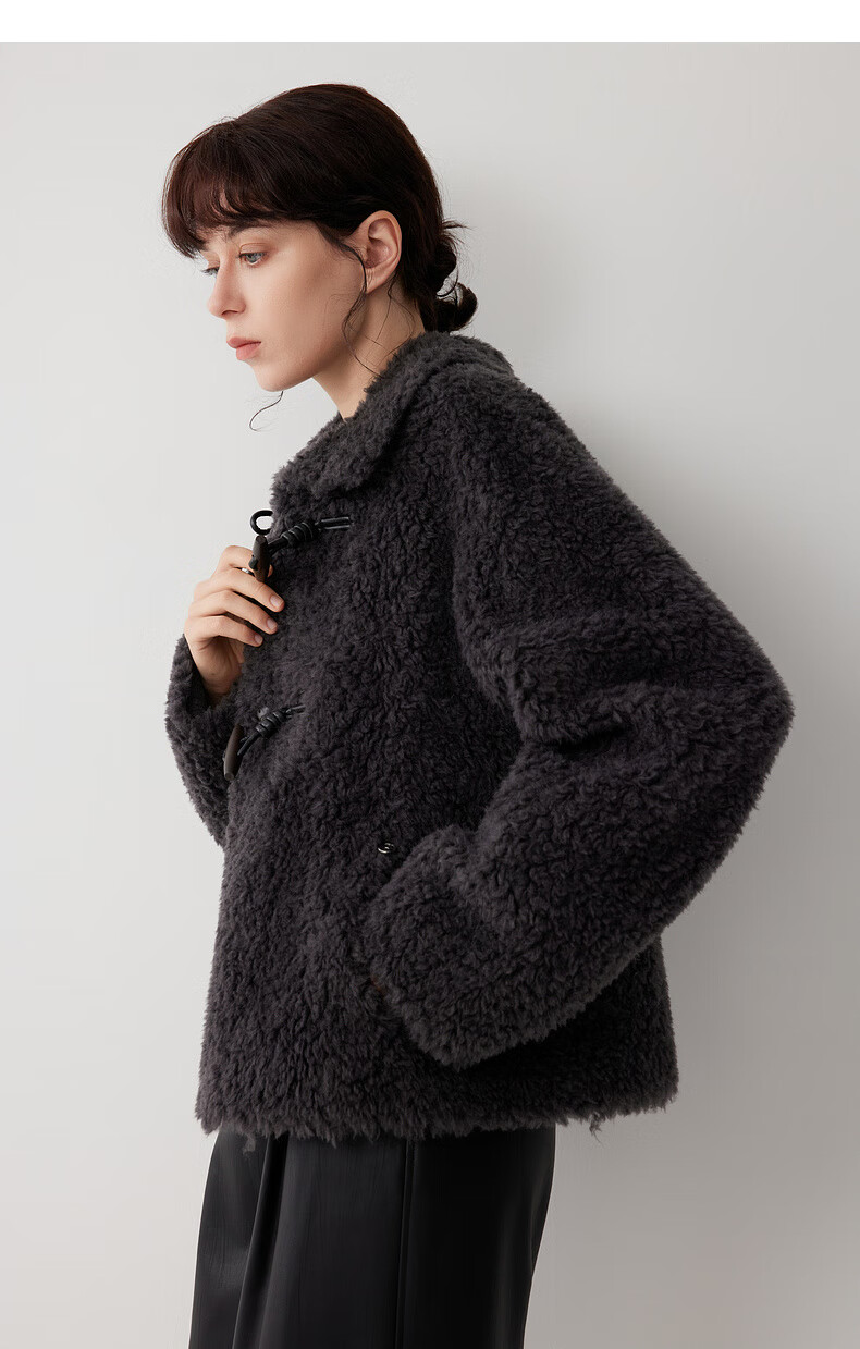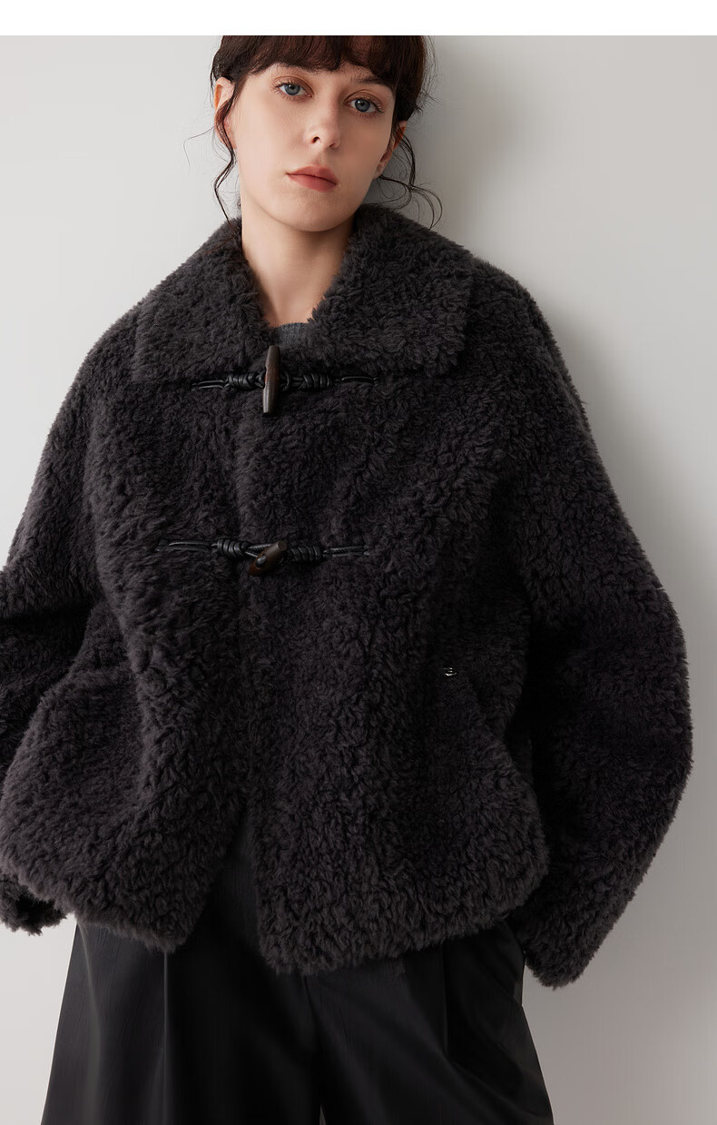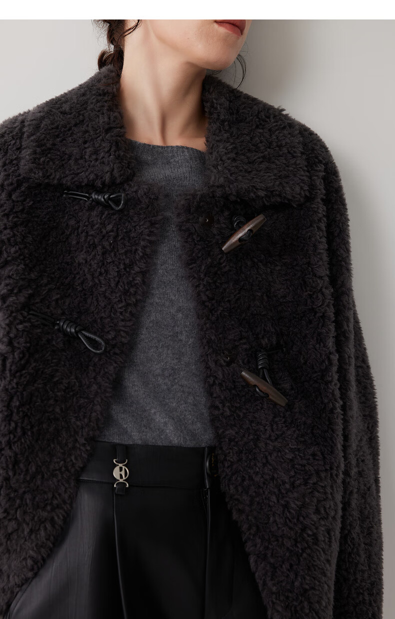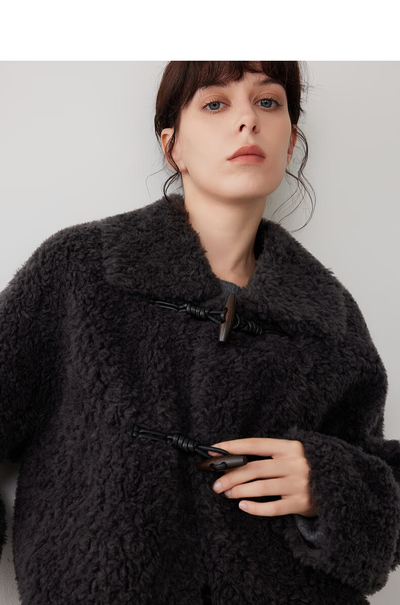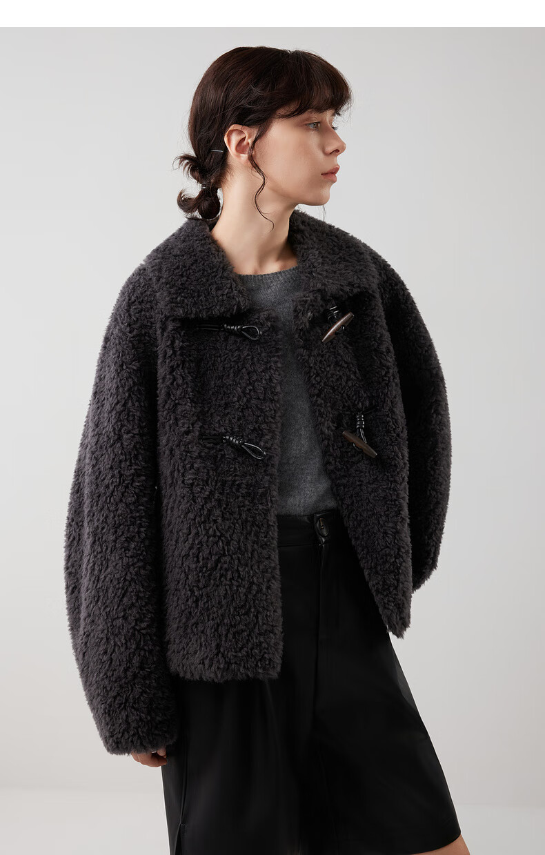 ELLE Sheep Wool Horn Button Plush Short Jacket Women 2025 Winter New New Year Retro Commuting Lamb Wool Top Dark Gray M
