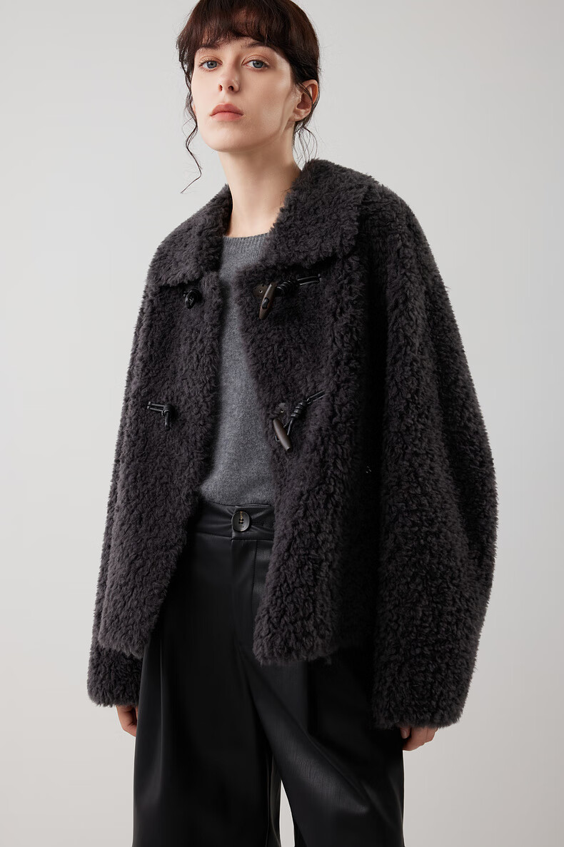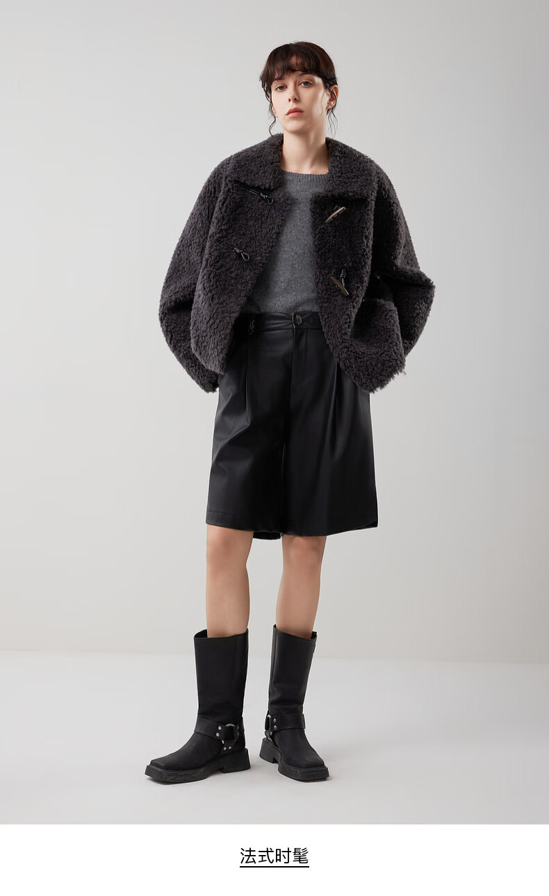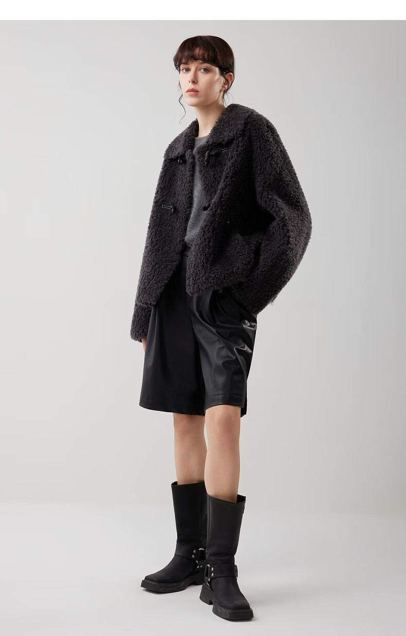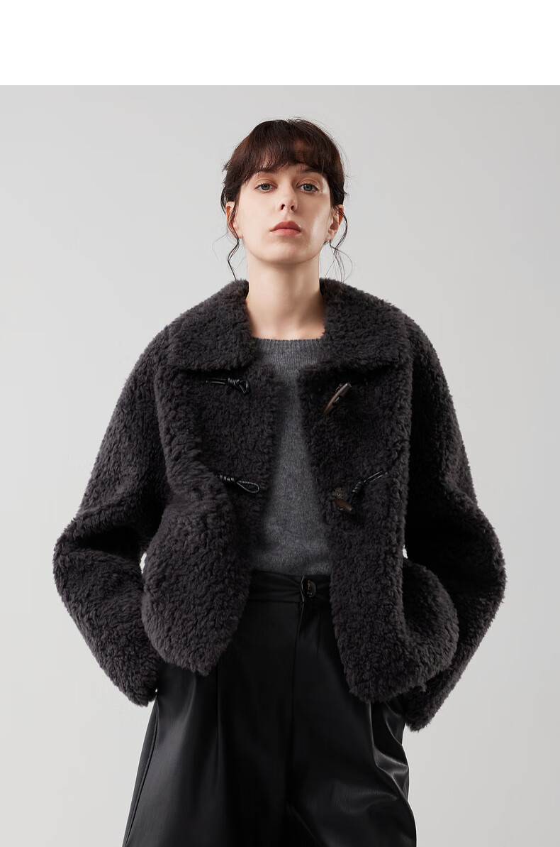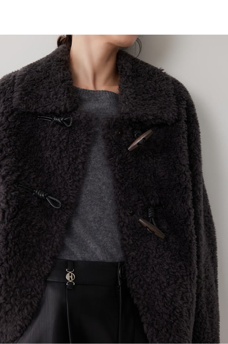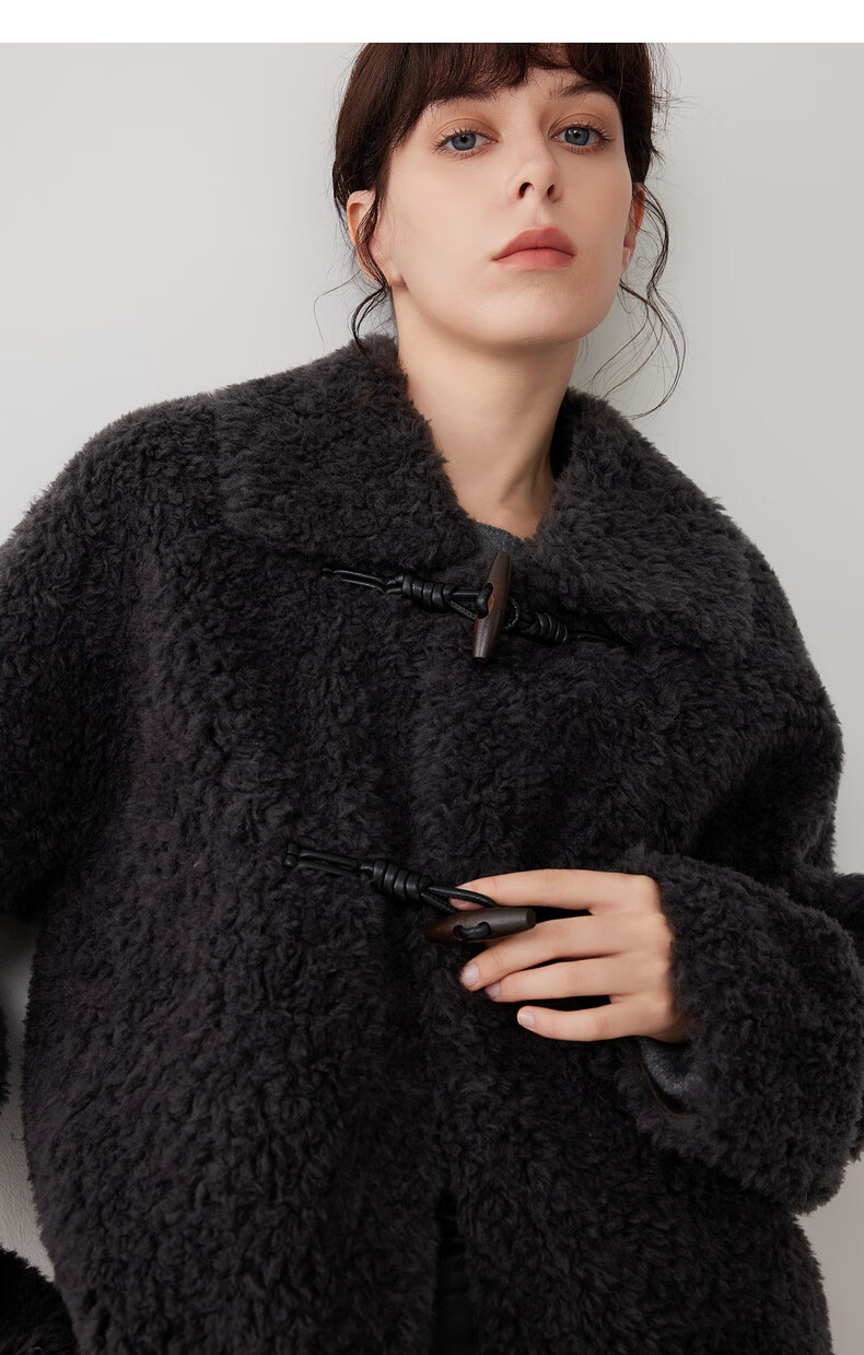 ELLE Sheep Wool Horn Button Plush Short Jacket Women 2025 Winter New New Year Retro Commuting Lamb Wool Top Dark Gray M