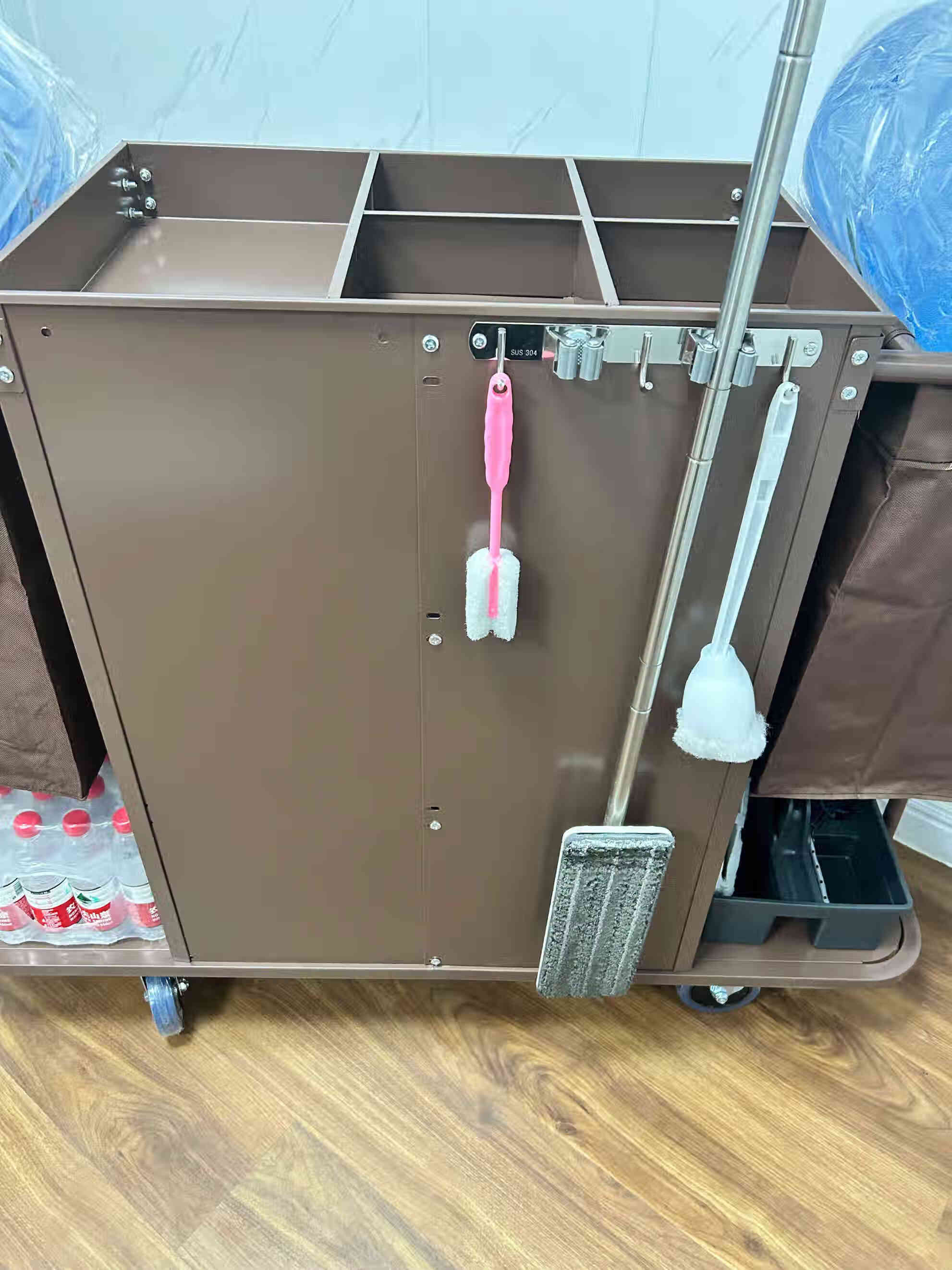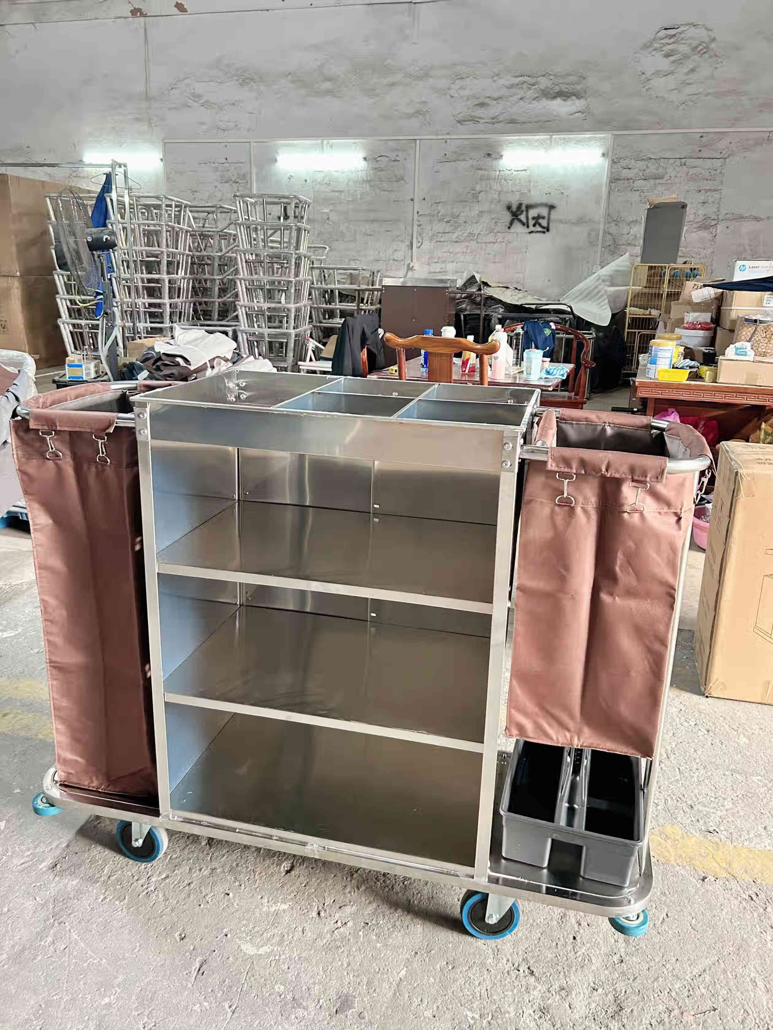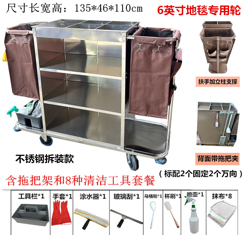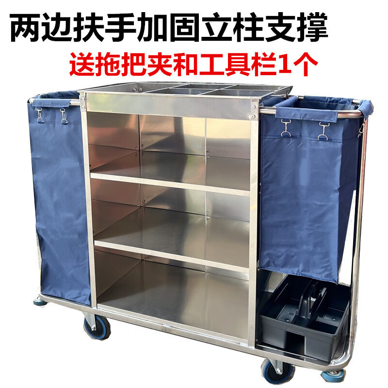 Hotel work linen cart universal wheel hotel stainless steel double-sided room entrance cleaning truck room service cart 1.35 meters steel double-sided blue long and short cloth bags - disassembly and assembly of mop rack 1