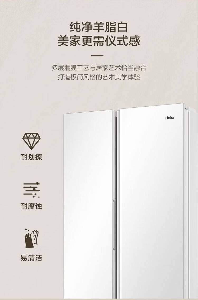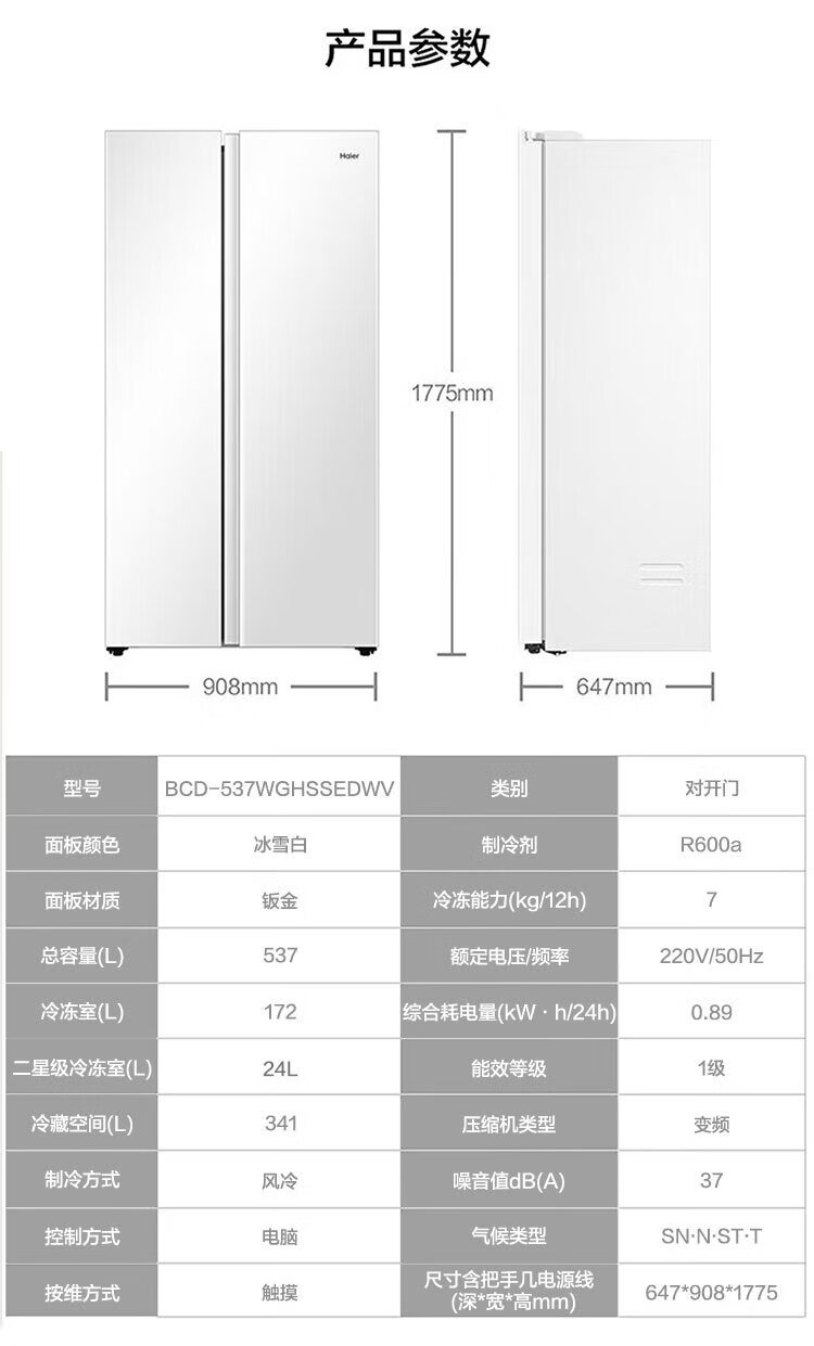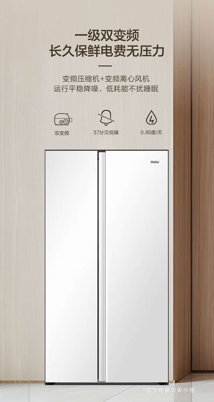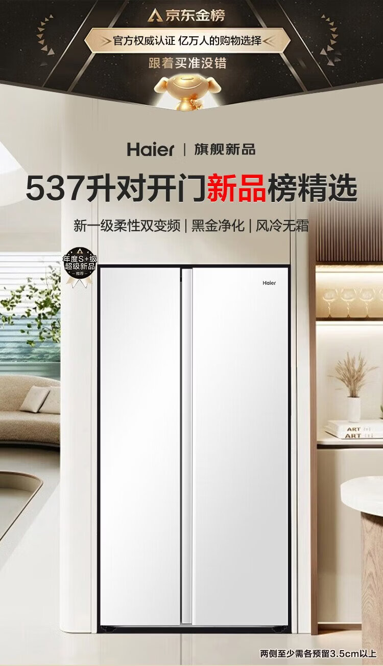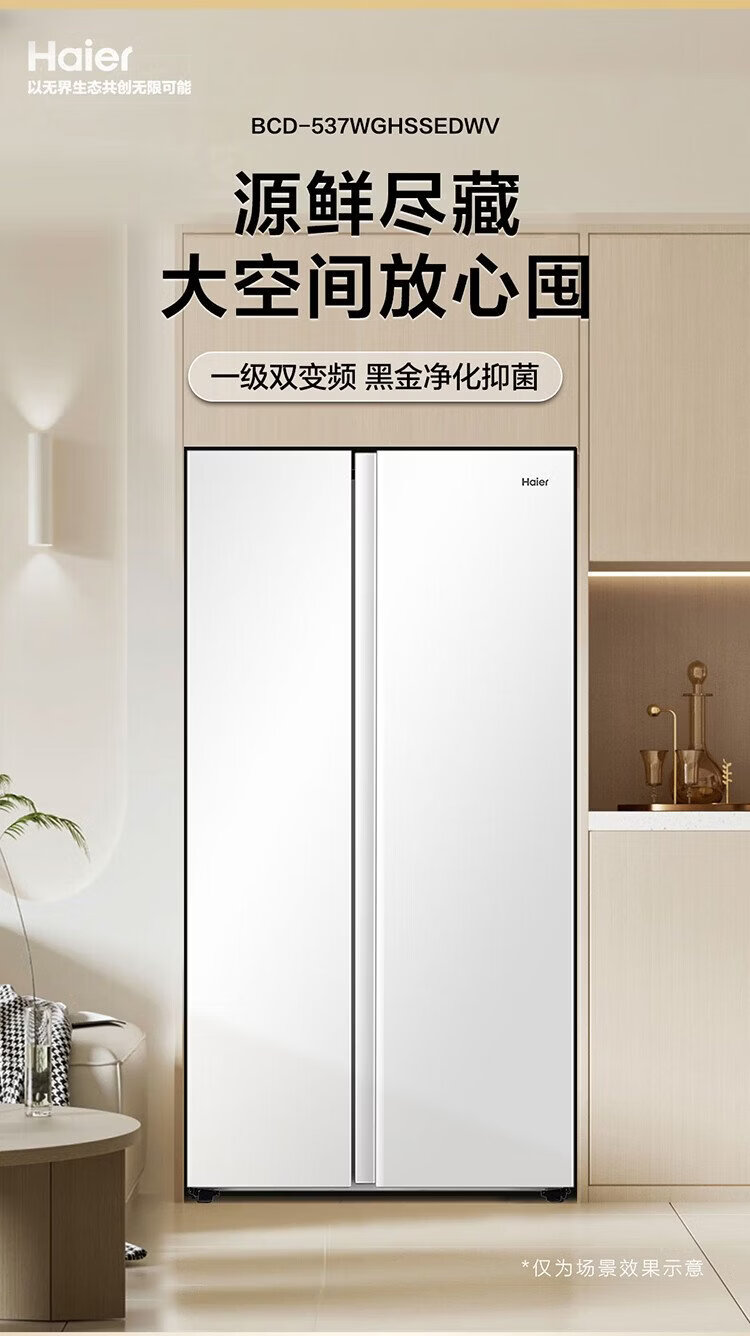 Haier refrigerator 537 liter side-by-side double door white first-class energy efficiency dual frequency conversion black gold purification and antibacterial air-cooled frost-free power-saving large-capacity household refrigerator 15% national subsidy 537L + first-class energy efficiency dual frequency + black gold purification and antibacterial