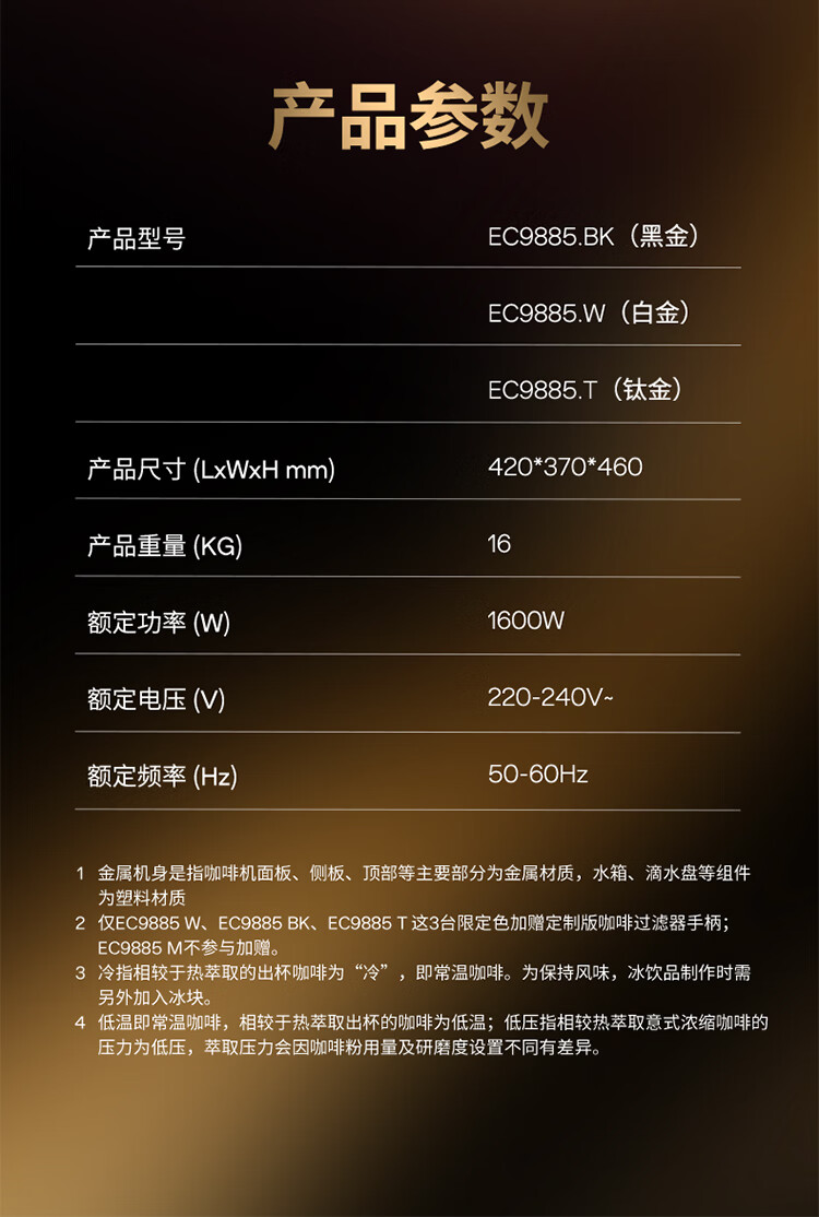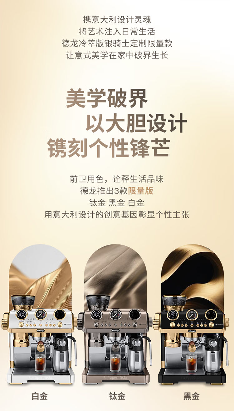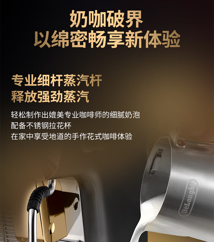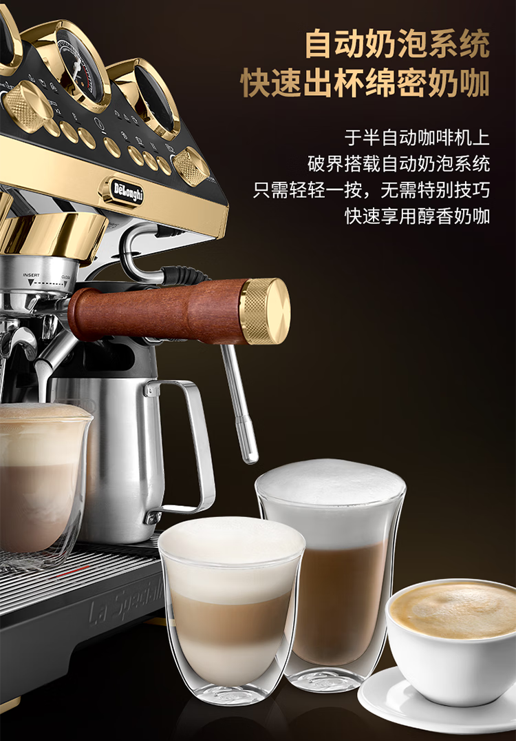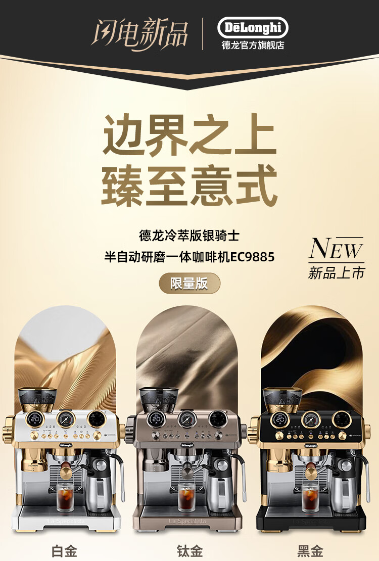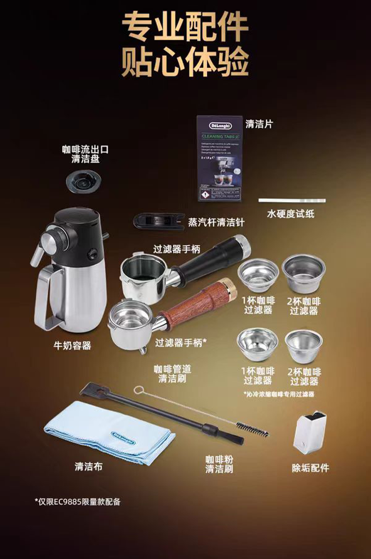 Delonghi Italian semi-automatic coffee machine for home use 19Bar freshly ground American grinding integrated fully automatic milk foaming metal panel body cold brew version Silver Knight Limited Edition EC9885.BK black gold 15-speed grinding bean powder dual-purpose wooden handle large-capacity water tank