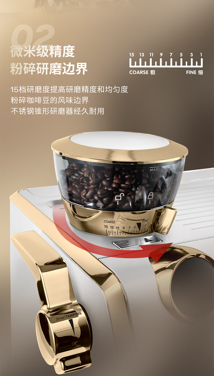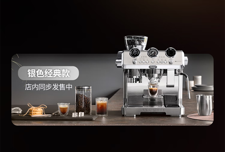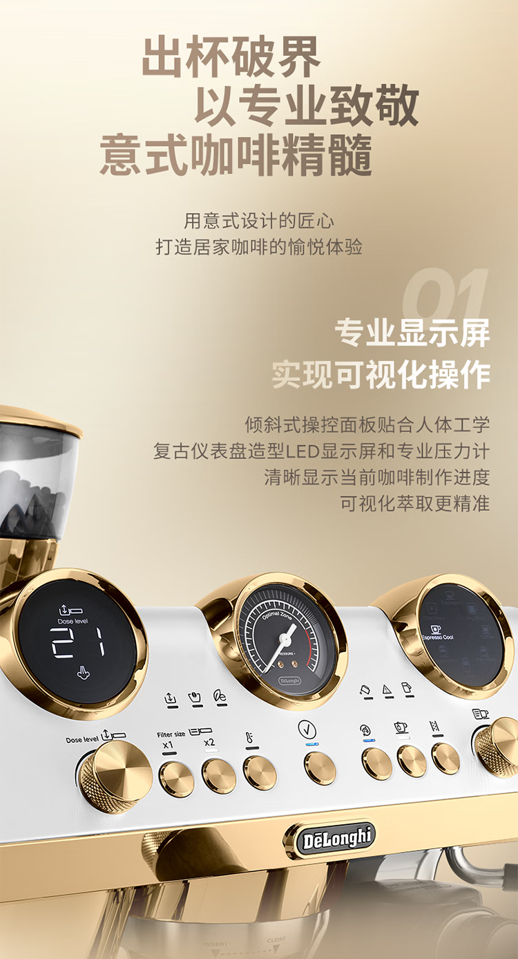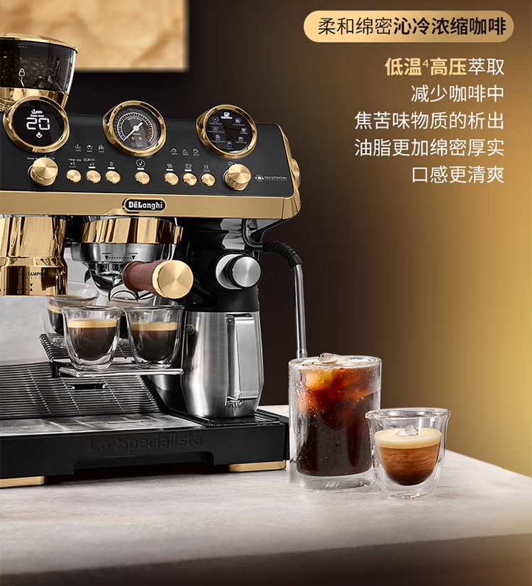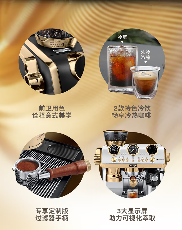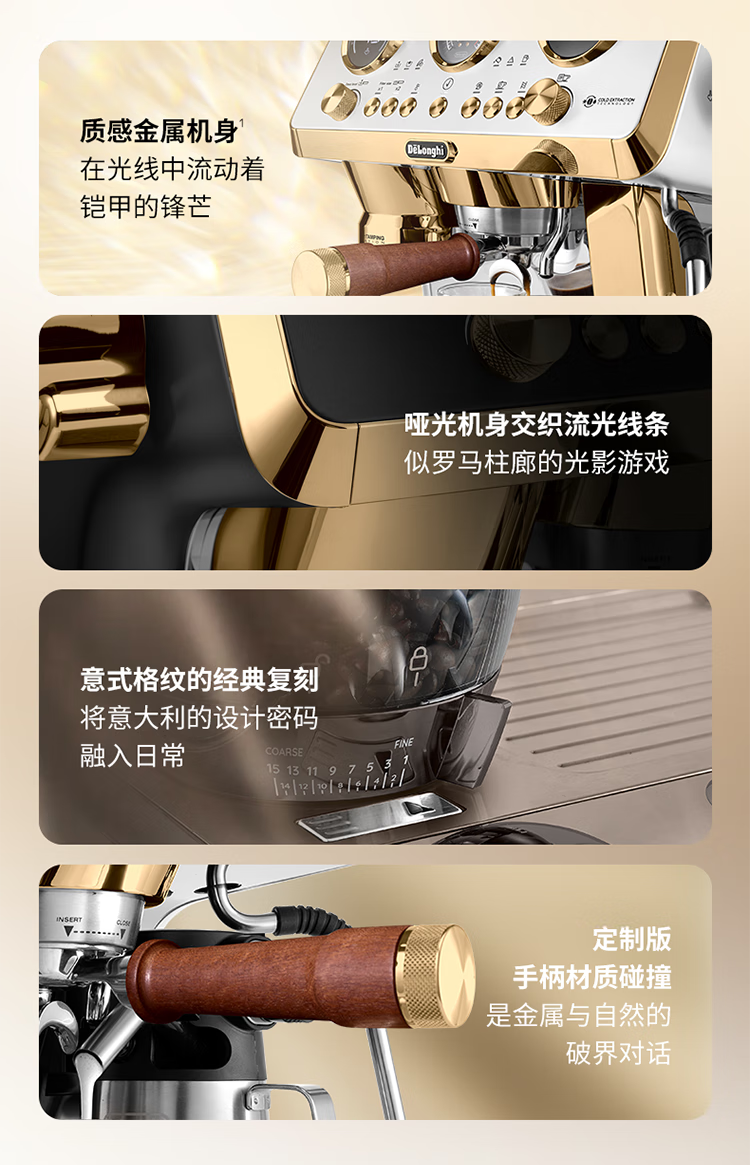 Delonghi Italian semi-automatic coffee machine for home use 19Bar freshly ground American grinding integrated fully automatic milk foaming metal panel body cold brew version Silver Knight Limited Edition EC9885.BK black gold 15-speed grinding bean powder dual-purpose wooden handle large-capacity water tank