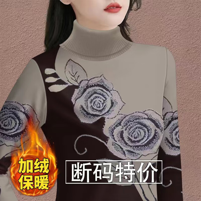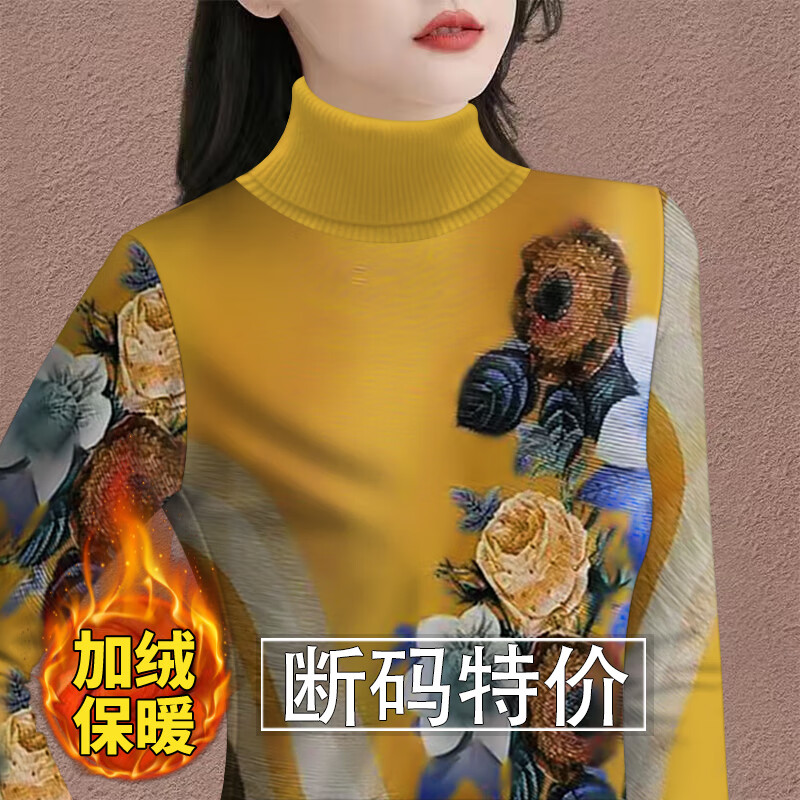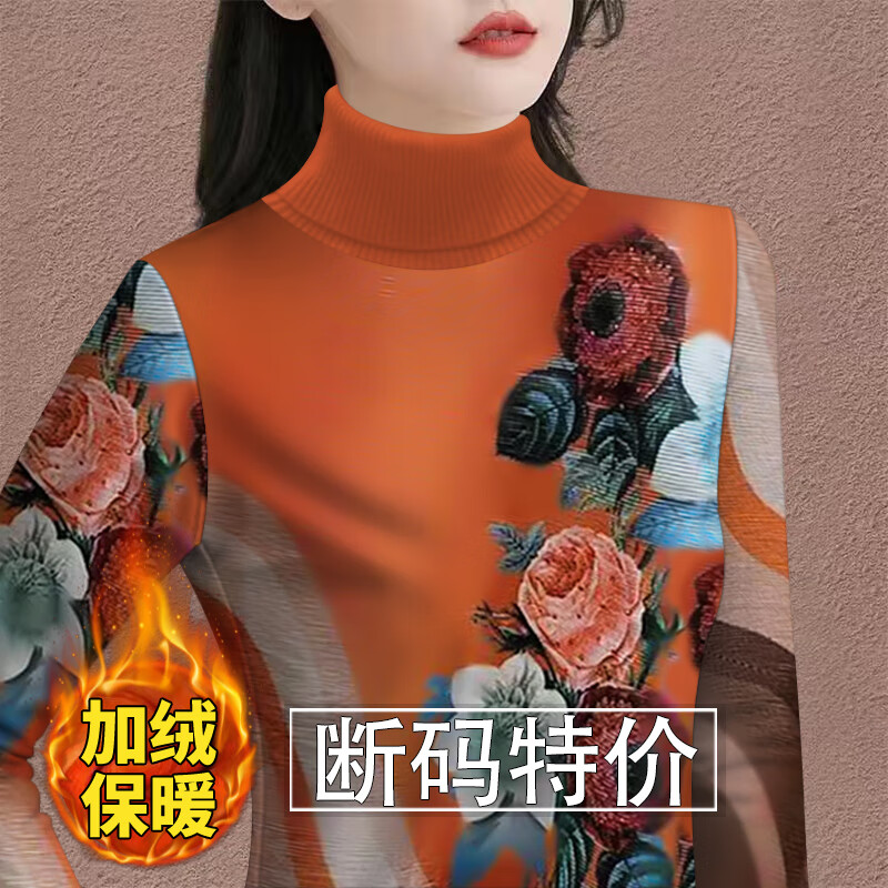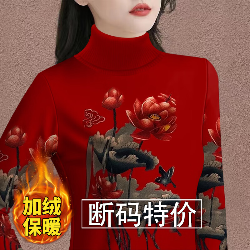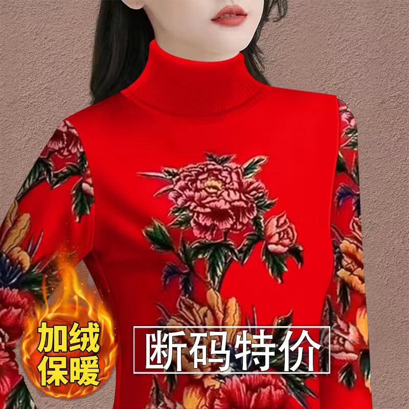 Woodpecker (TUCANO) velvet thickened bottoming shirt for women to keep warm in winter, new high-neck T-shirt with western style long-sleeved printed belly-covering top 8529 red bottom lotus, warm, velvet, 2XL, recommended 120-135 pounds