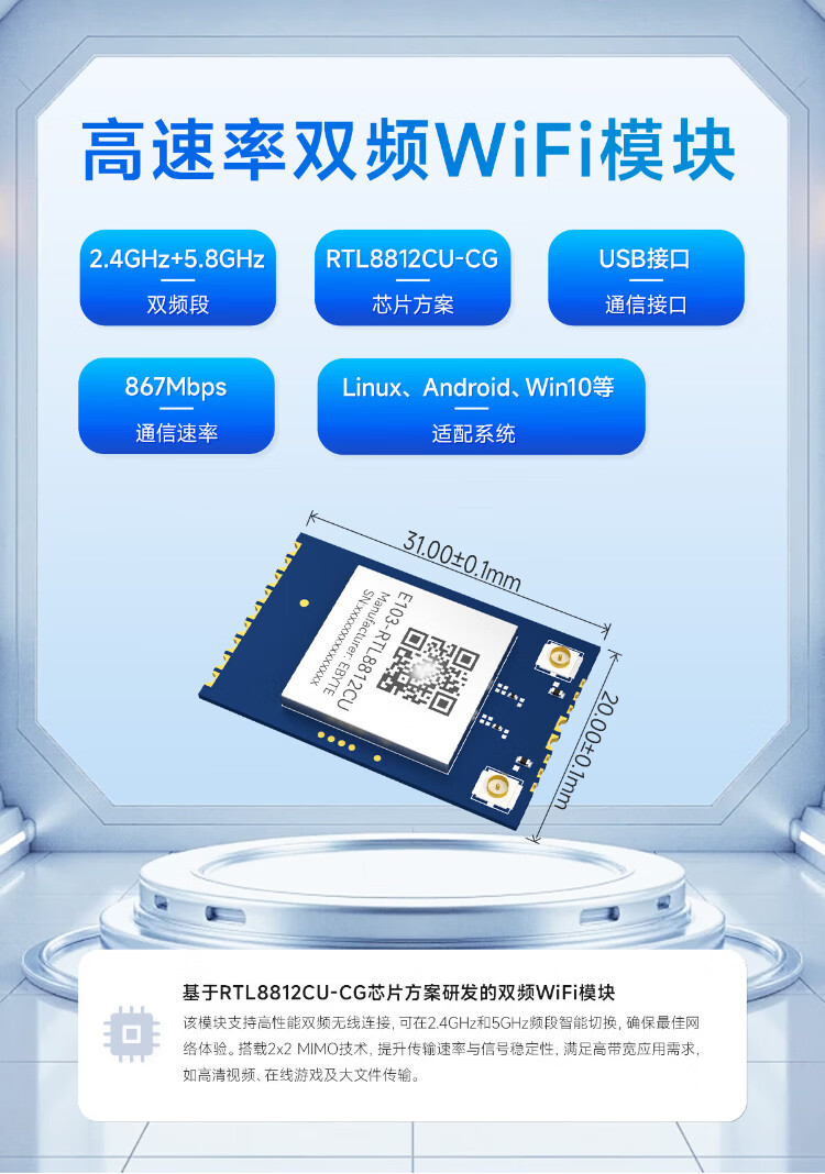 2.4/5.8GHz dual-band WiFi wireless module RTL8812CU chip high-speed audio transmission USB port E103-RTL8812CU double cheek module
