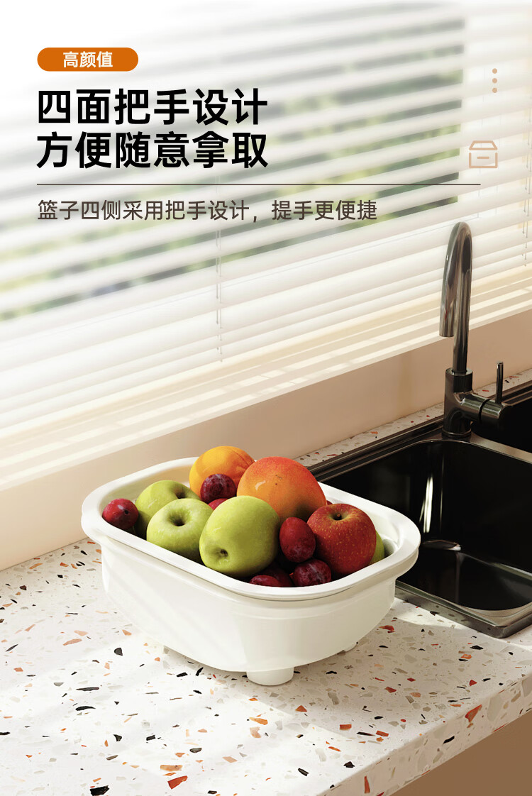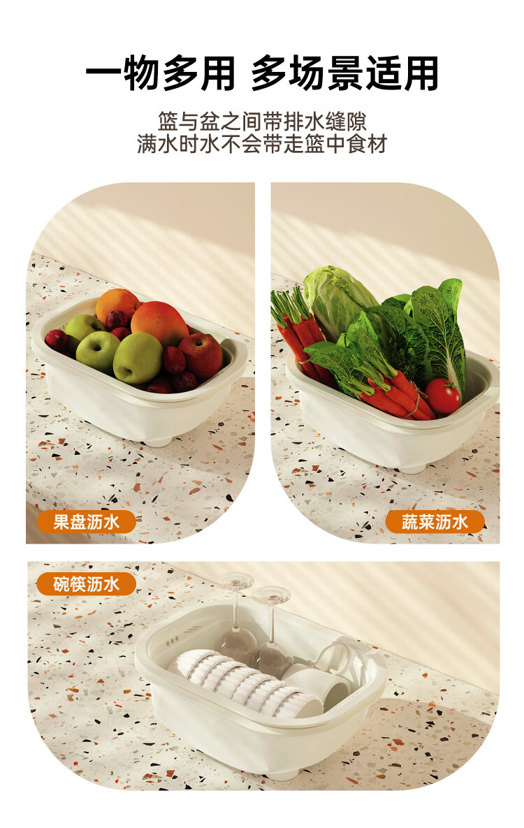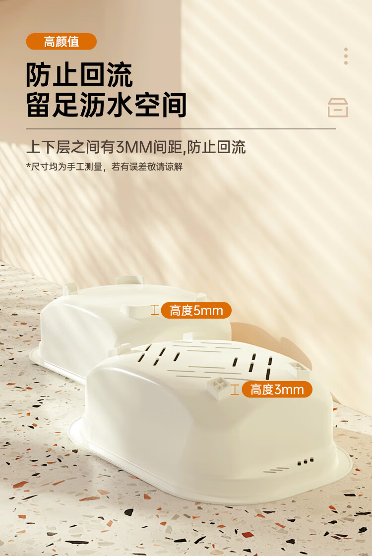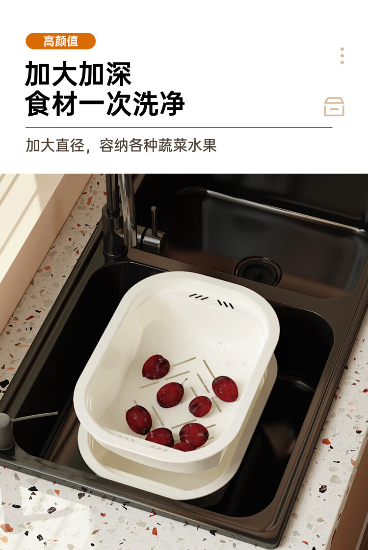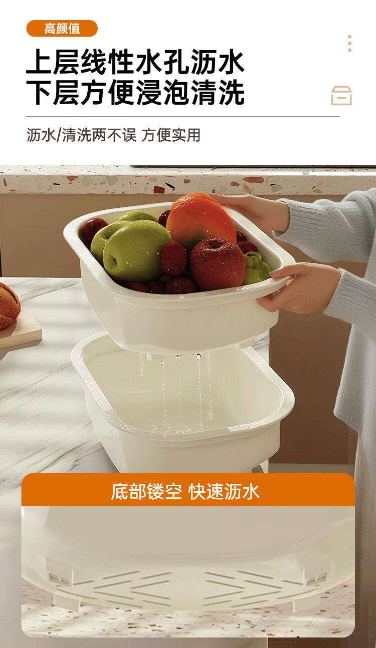 Fahrenheit Double Layer Drain Basket Sink Washing Basket Kitchen Storage Vegetable and Fruit Basket Food Grade Environmentally Friendly Material Thickened and Durable Double Layer Drain Basket - Cream Large Size Set of Two