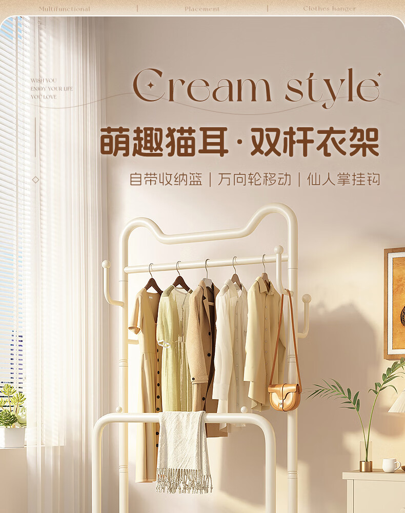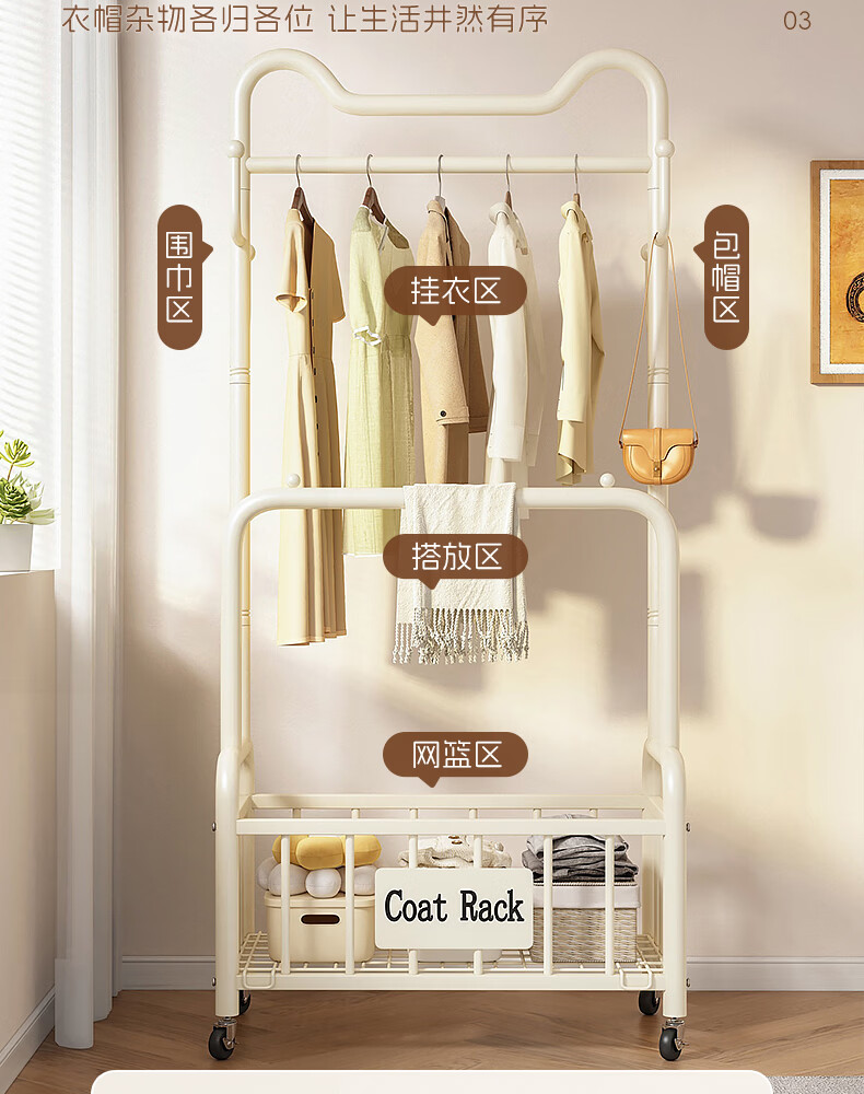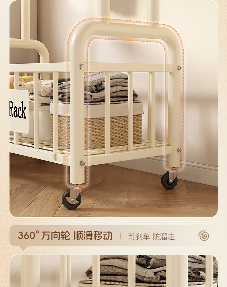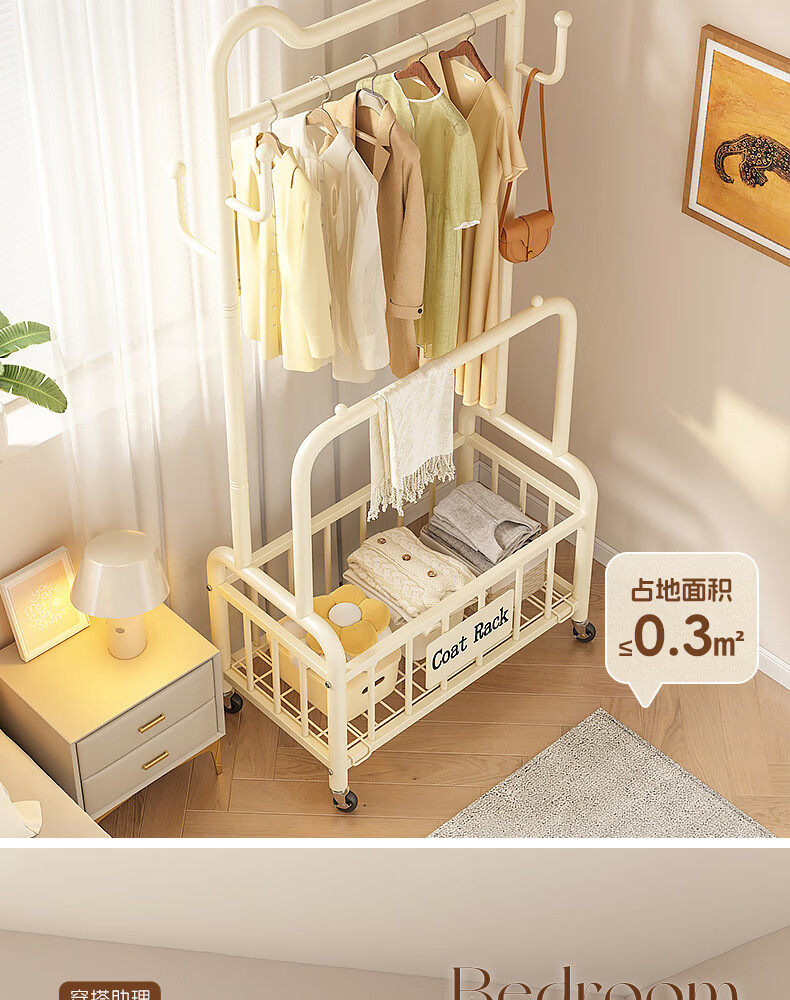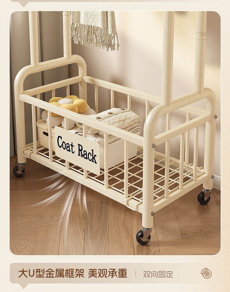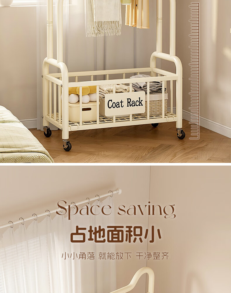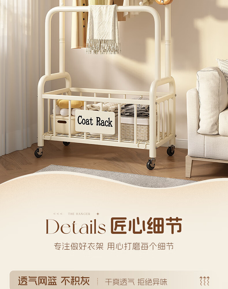 Wooden cream style simple clothes hanger floor-standing bedroom coat rack with wheels mobile living room single pole clothes drying storage hanger 60cm cream white
