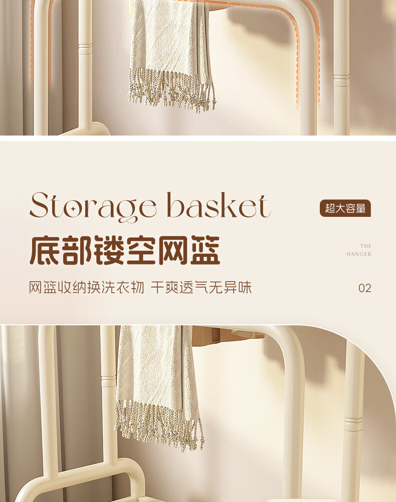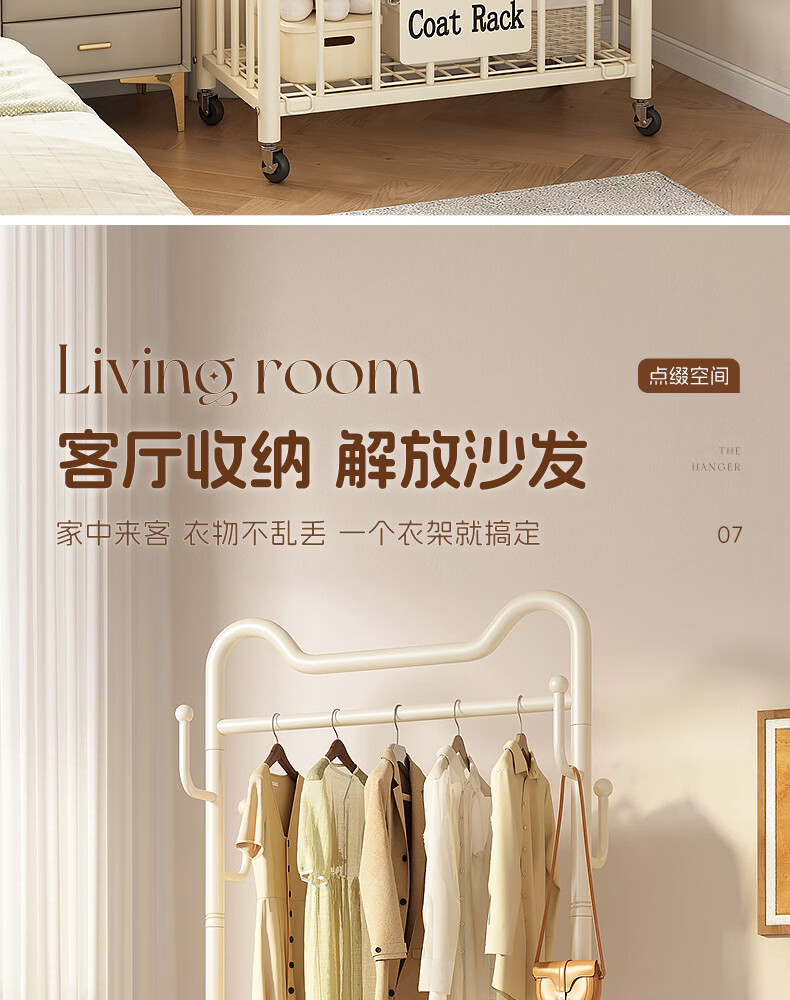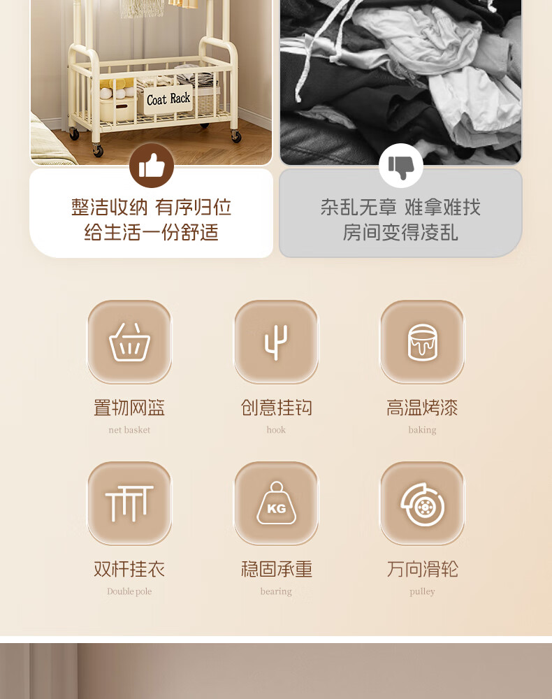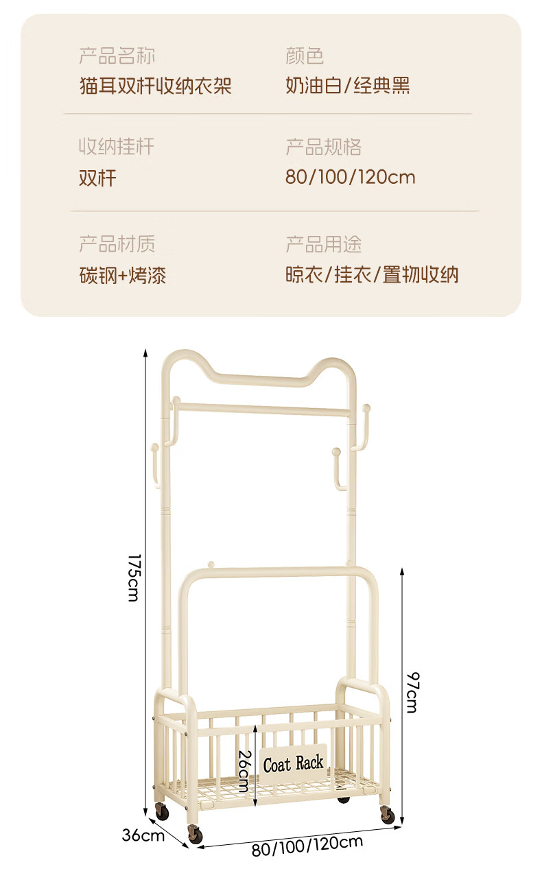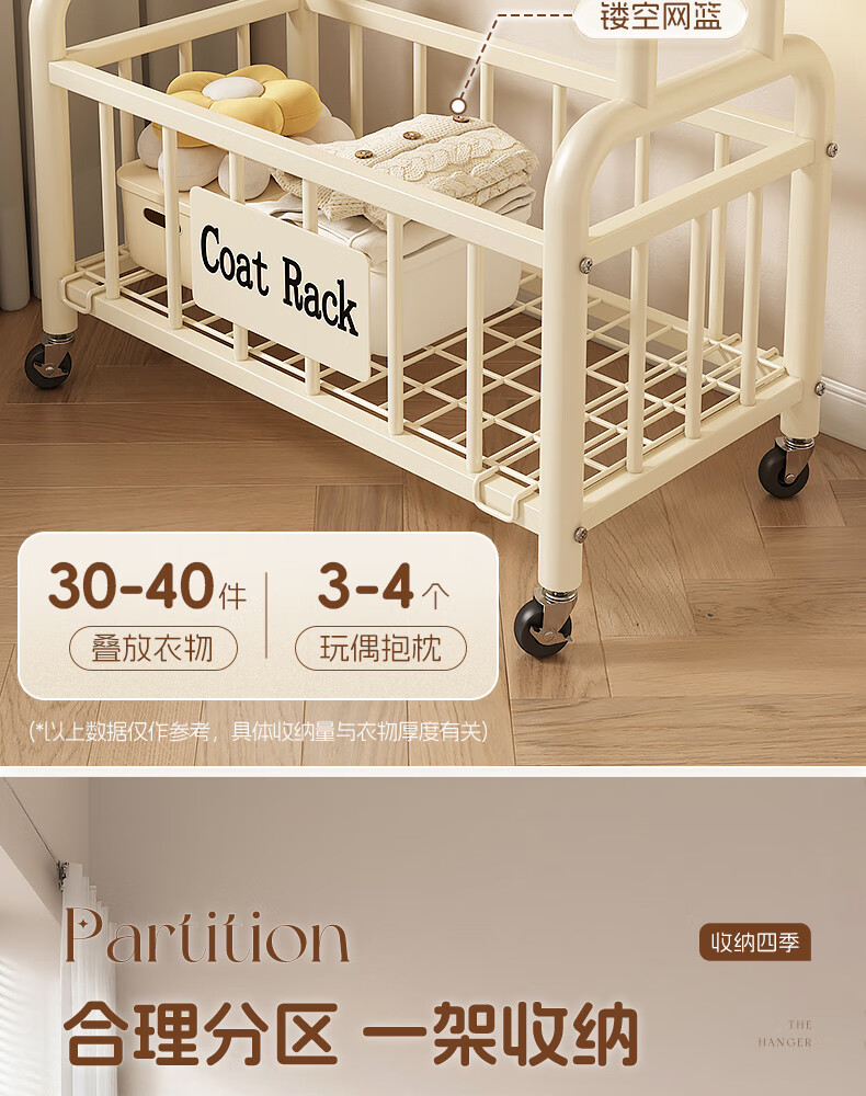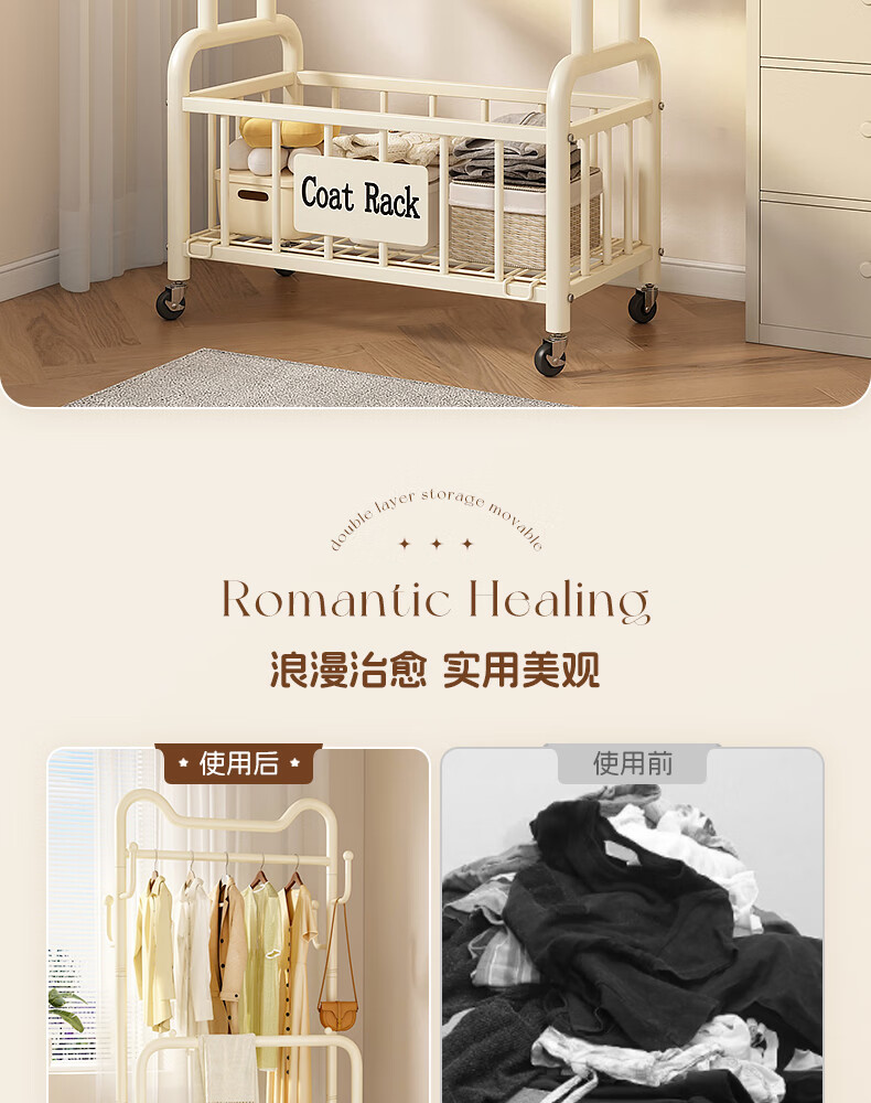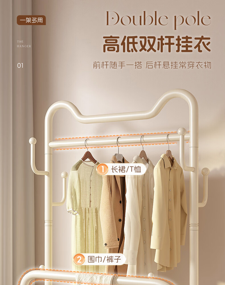 Wooden cream style simple clothes hanger floor-standing bedroom coat rack with wheels mobile living room single pole clothes drying storage hanger 60cm cream white