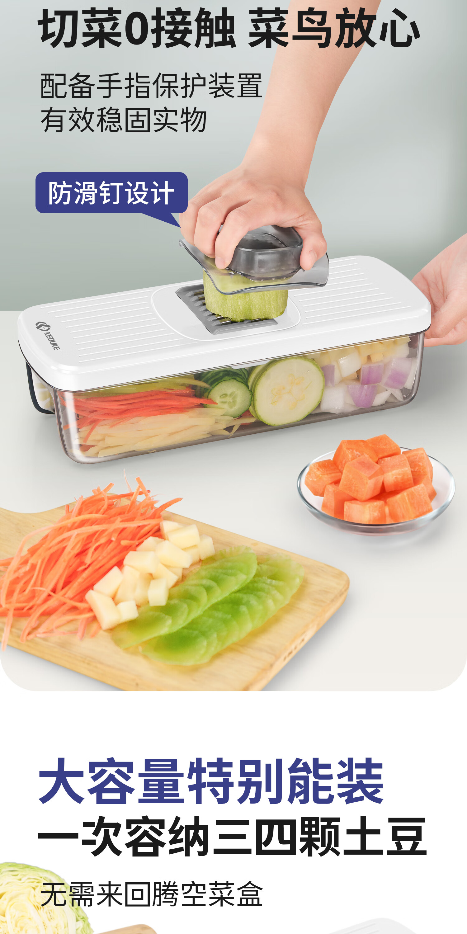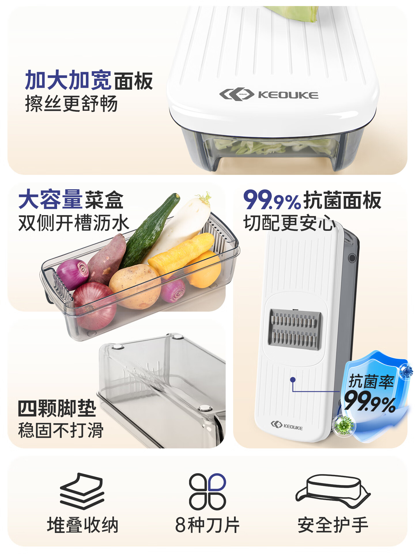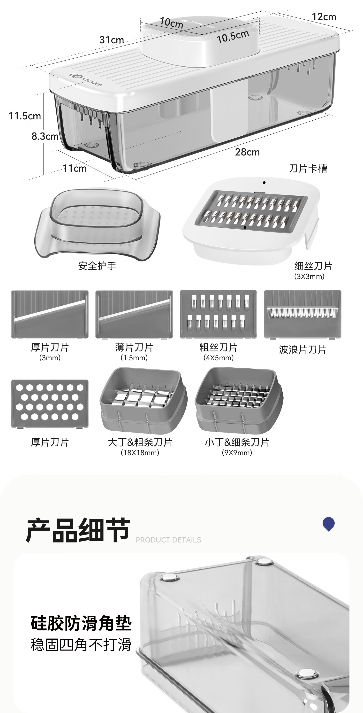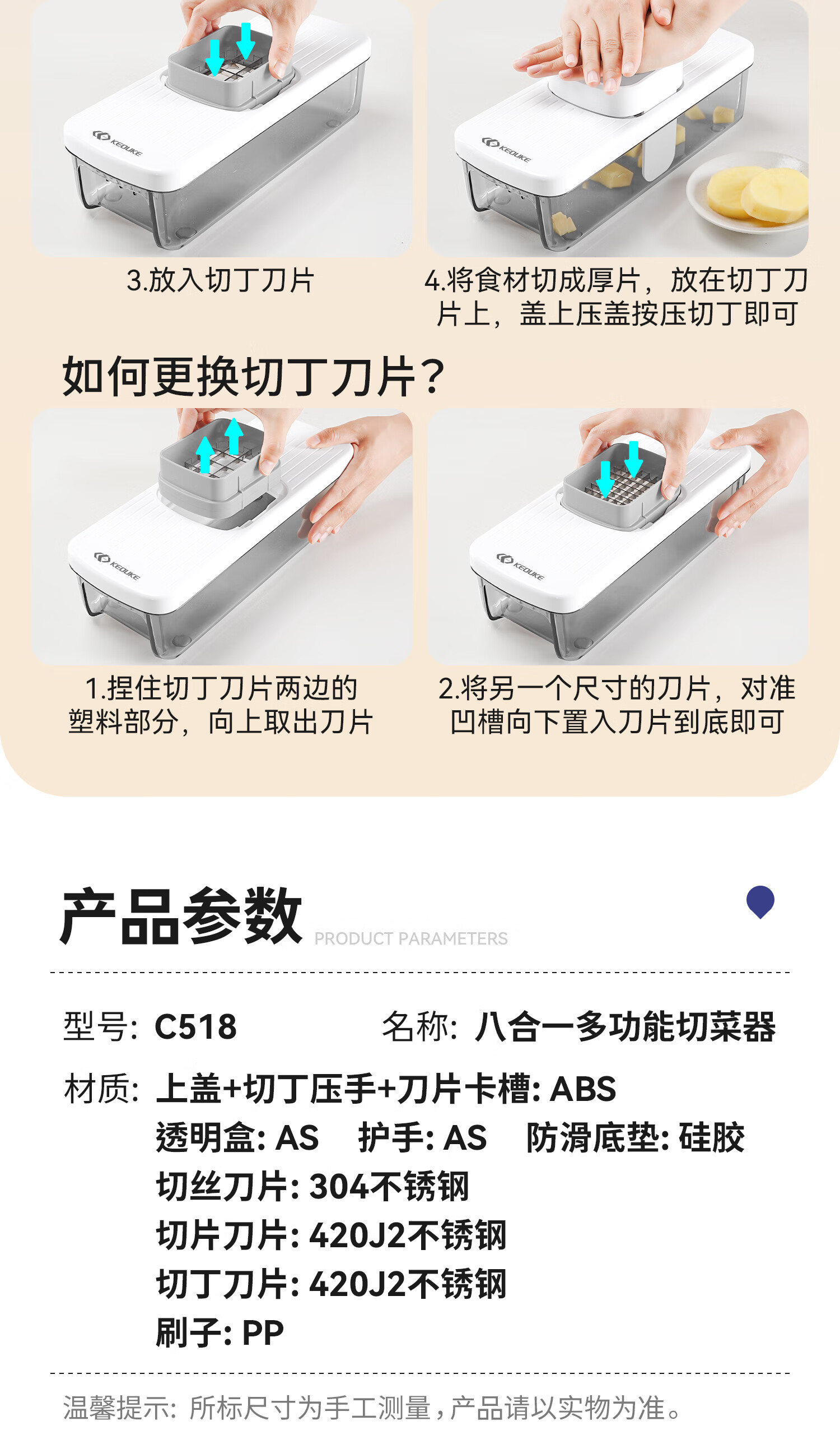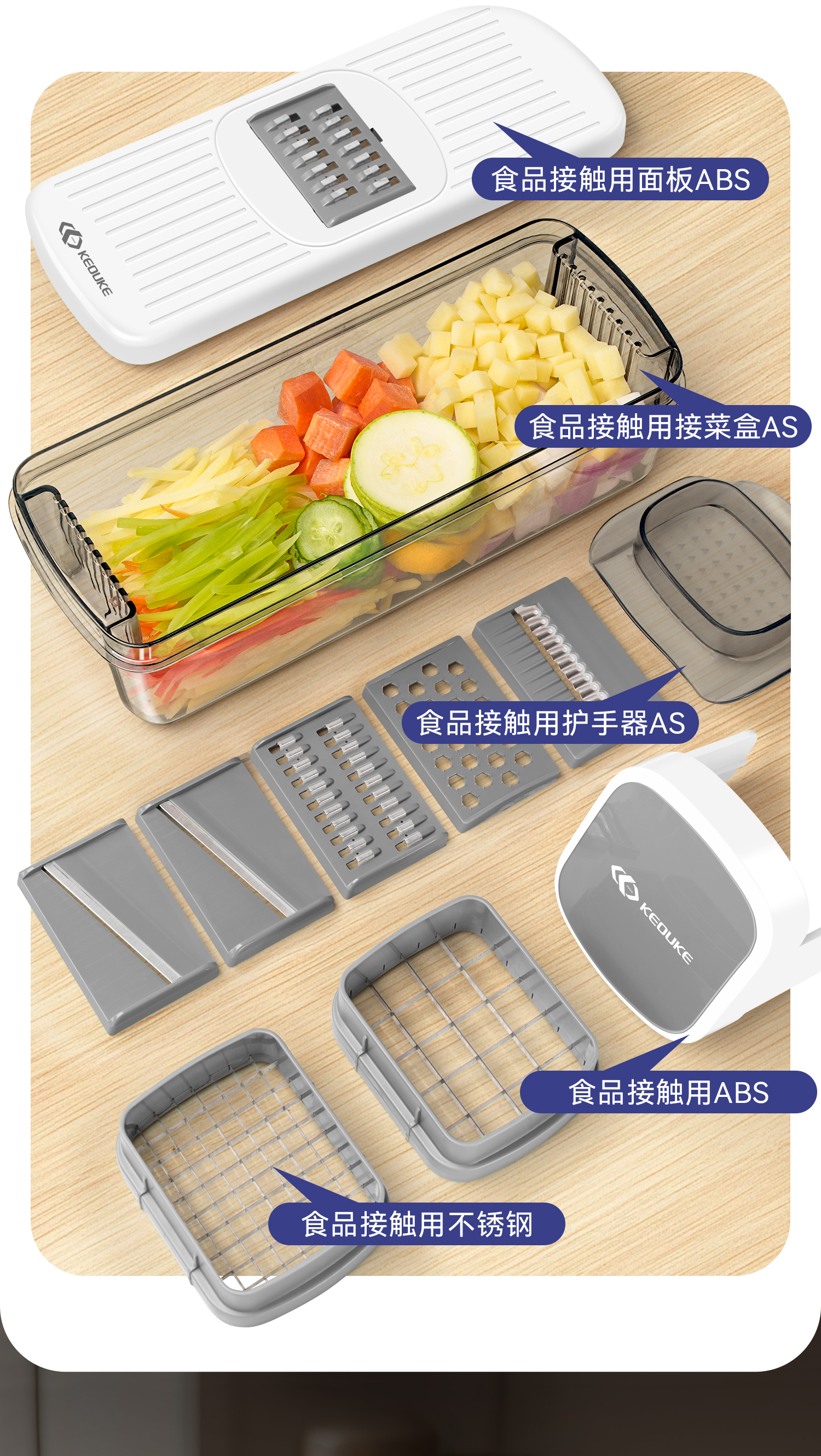 Keok stainless steel vegetable cutting tool dicer potato shredded multi-functional radish grating slicer equipped with six knives + two dicing knives