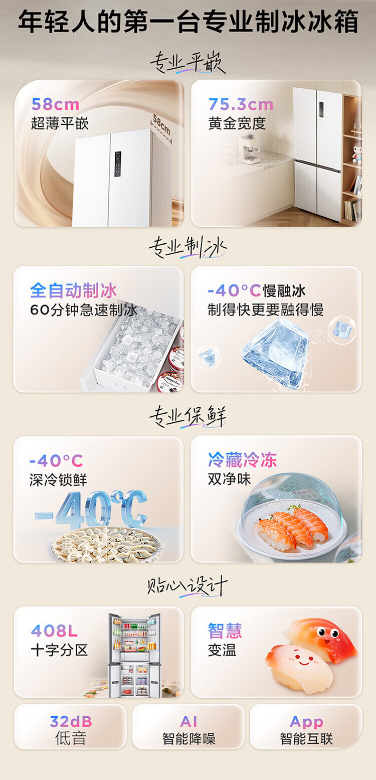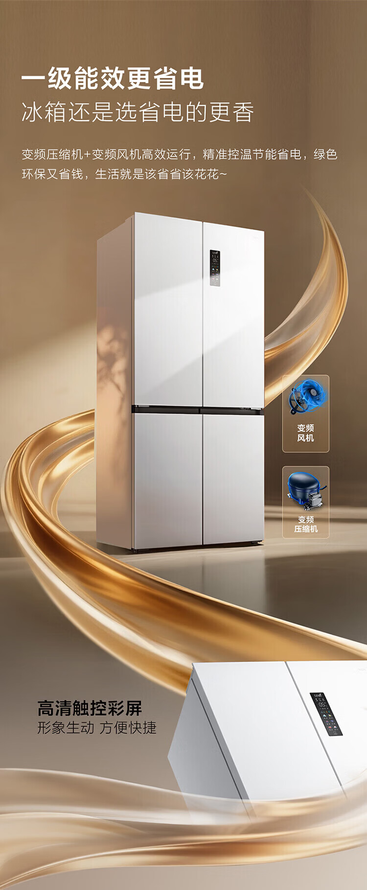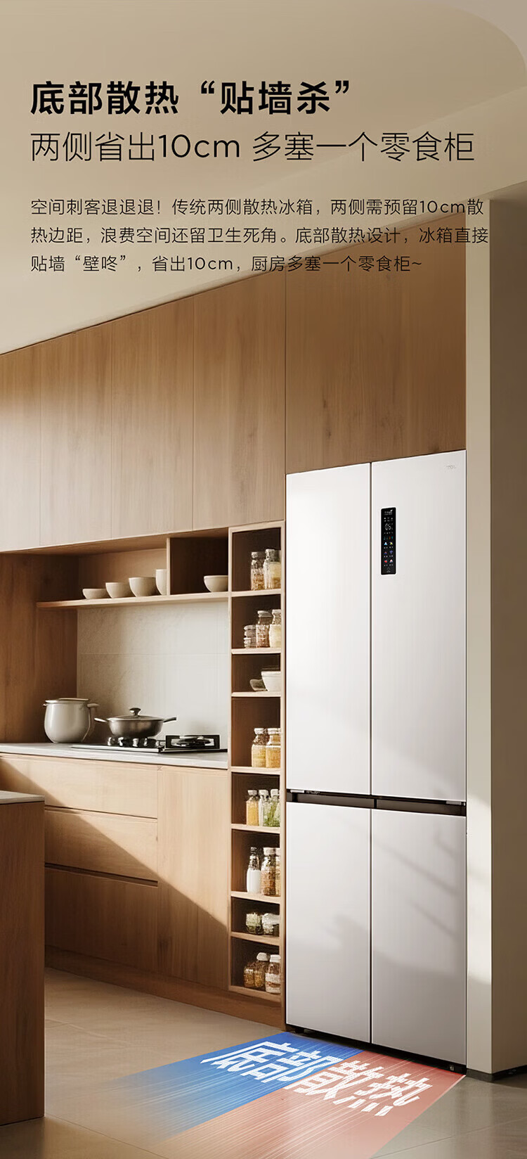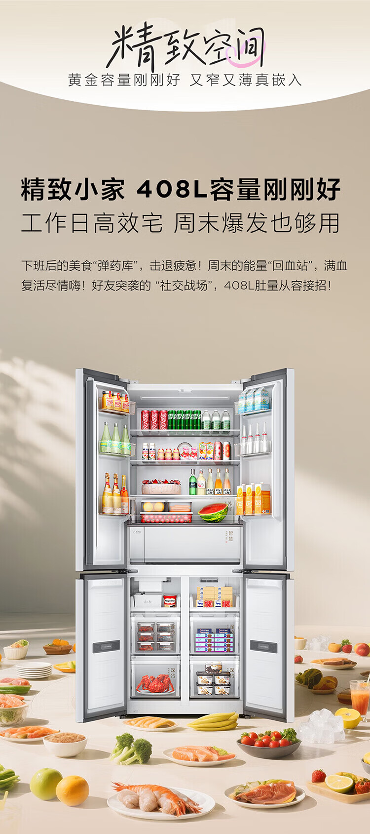 TCL four-door refrigerator with small width 80 cm embedded ultra-thin narrow 408 liters bottom cooling air-cooled frost-free frequency conversion double cycle first-level energy efficiency fully automatic ice cube cold pudding R408T7-UQB