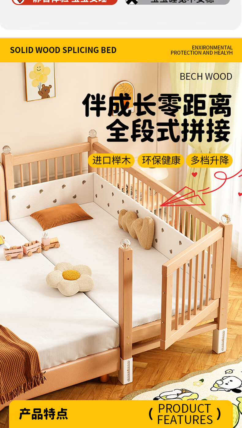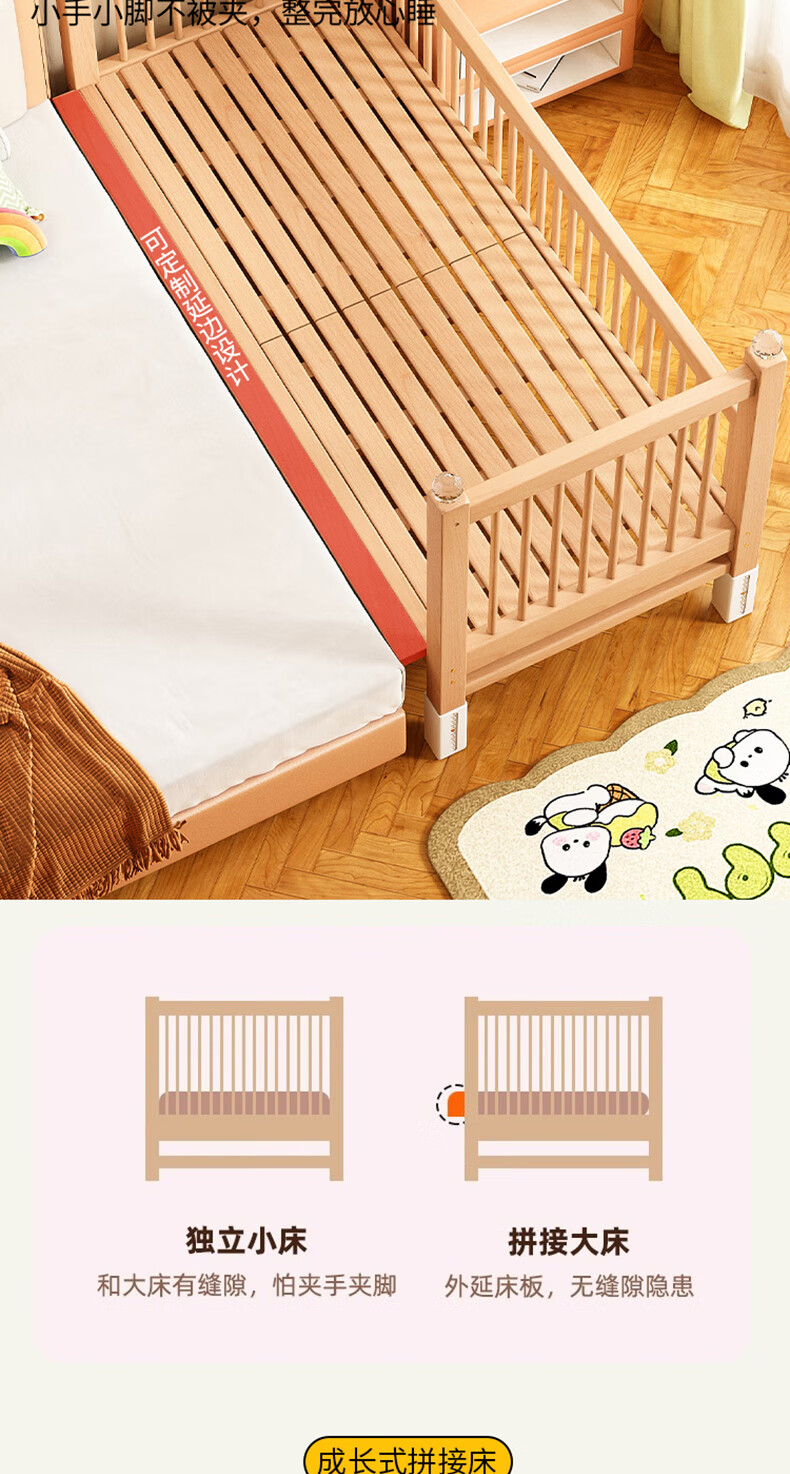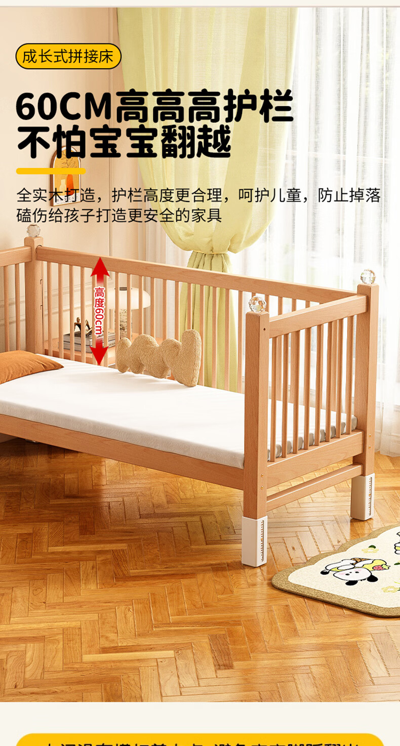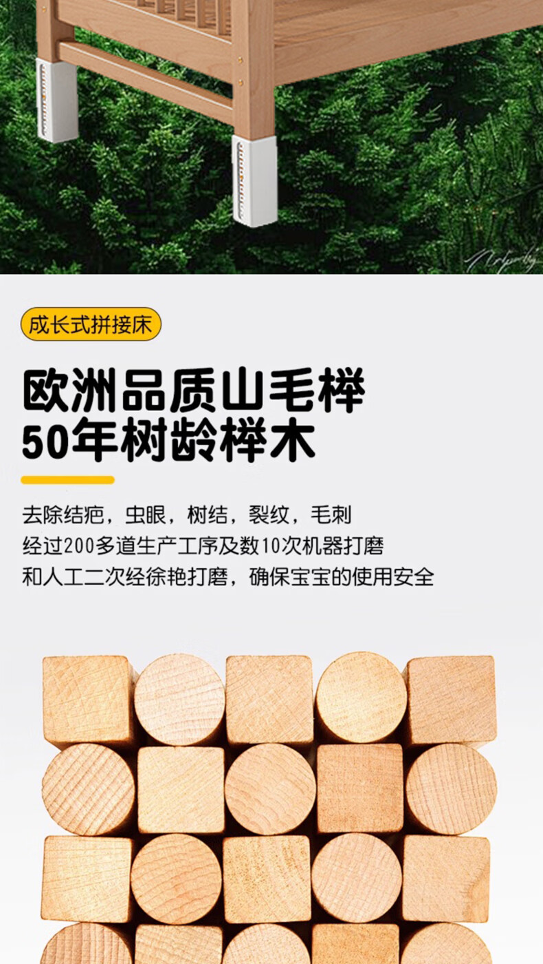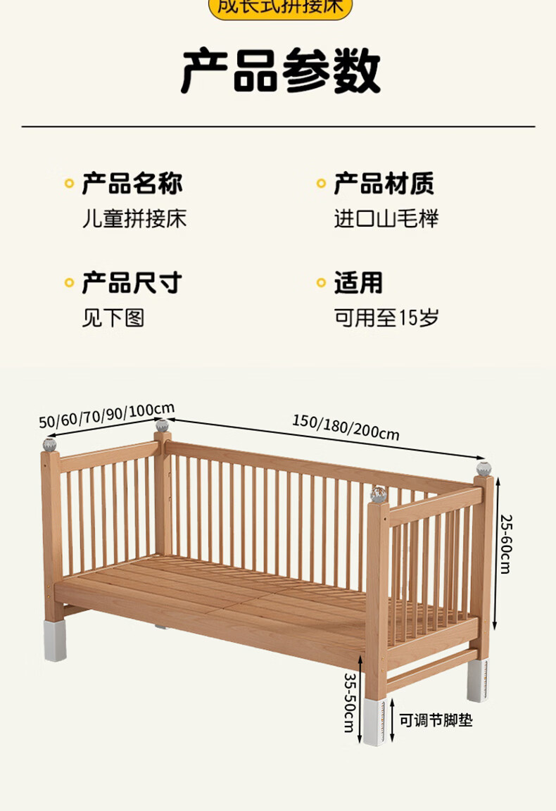 Zhiqushu all solid wood liftable beech wood spliced bed children's bed crib widened spliced large bed bedside bed can be customized three guardrails + 6cm coconut palm mattress + side lift can lift length 200 width 60 height 35 60 guardrails