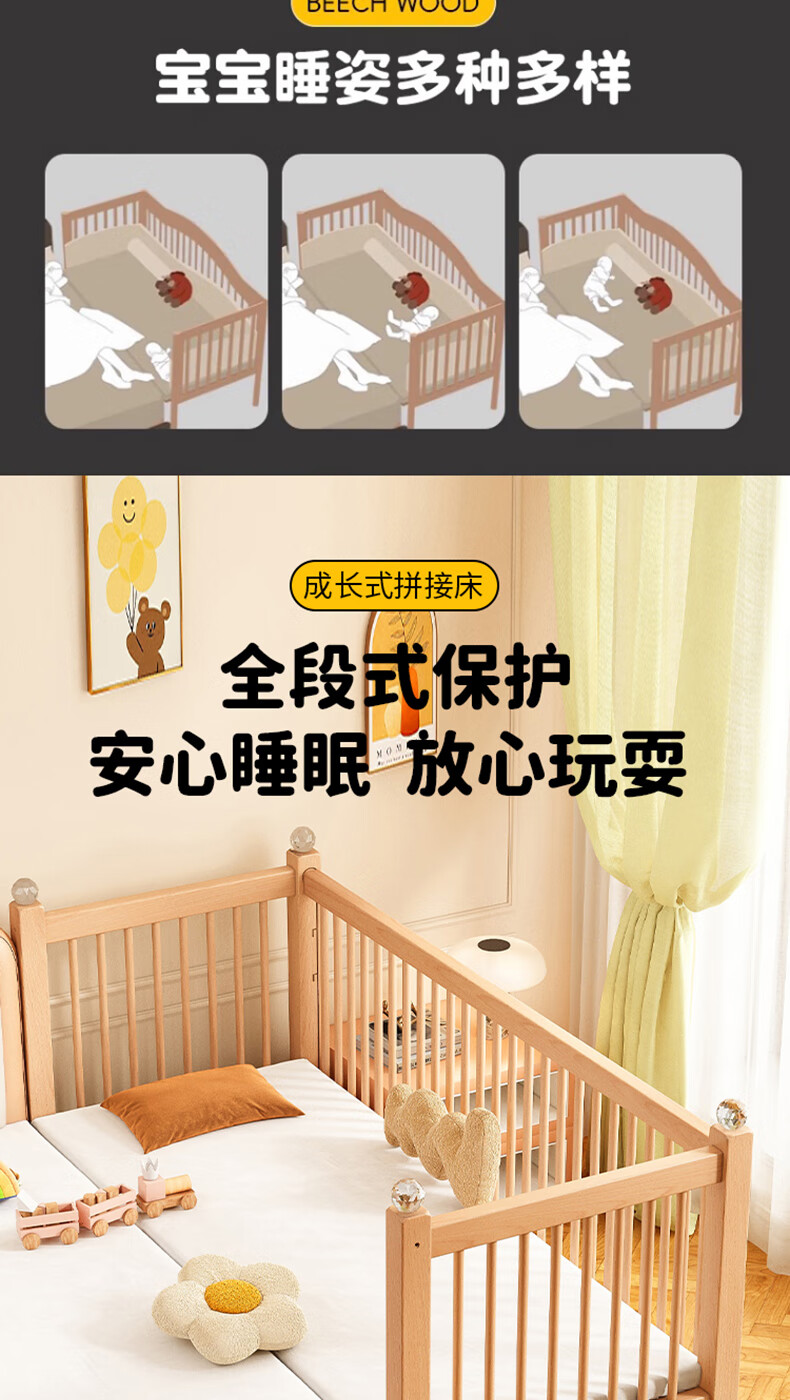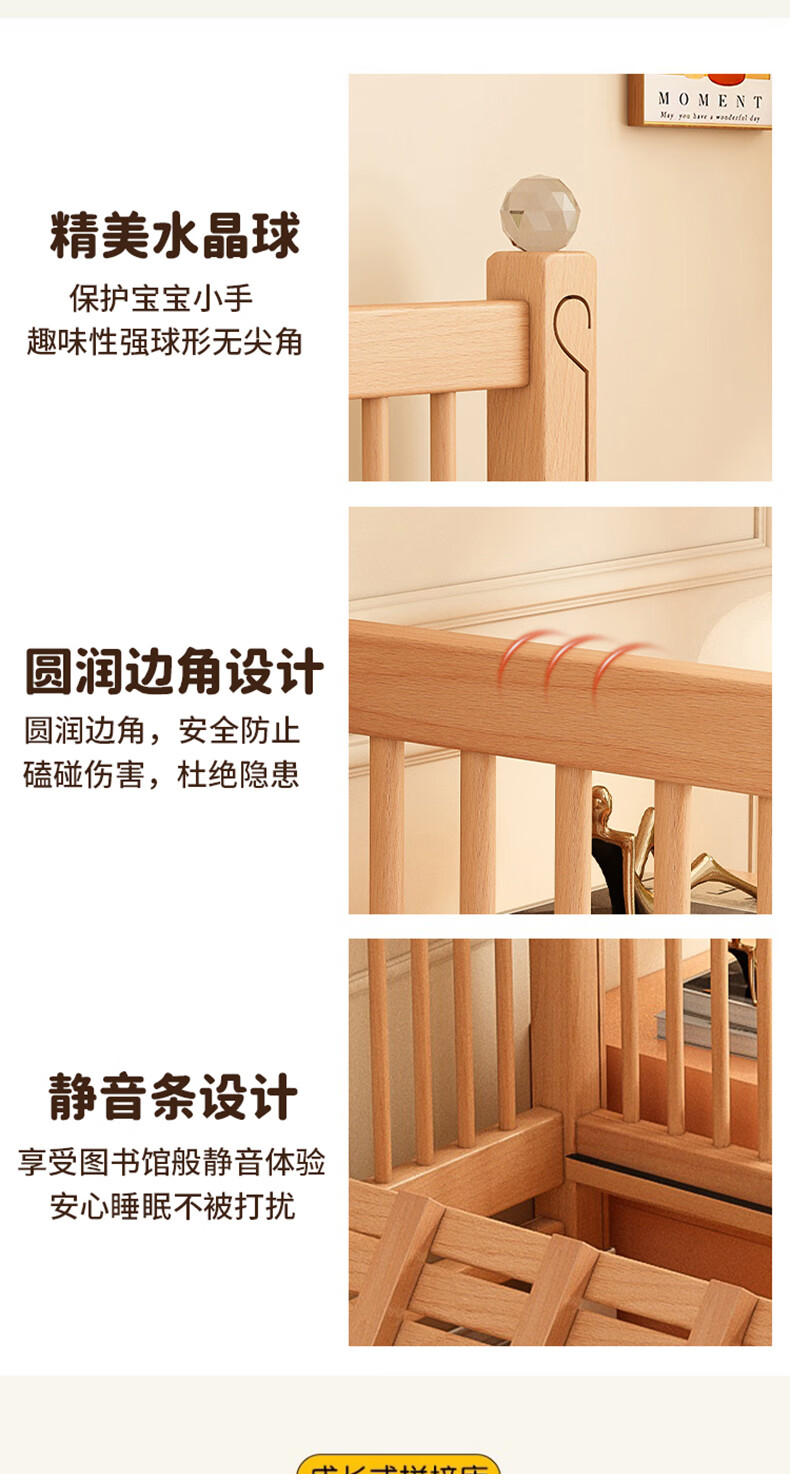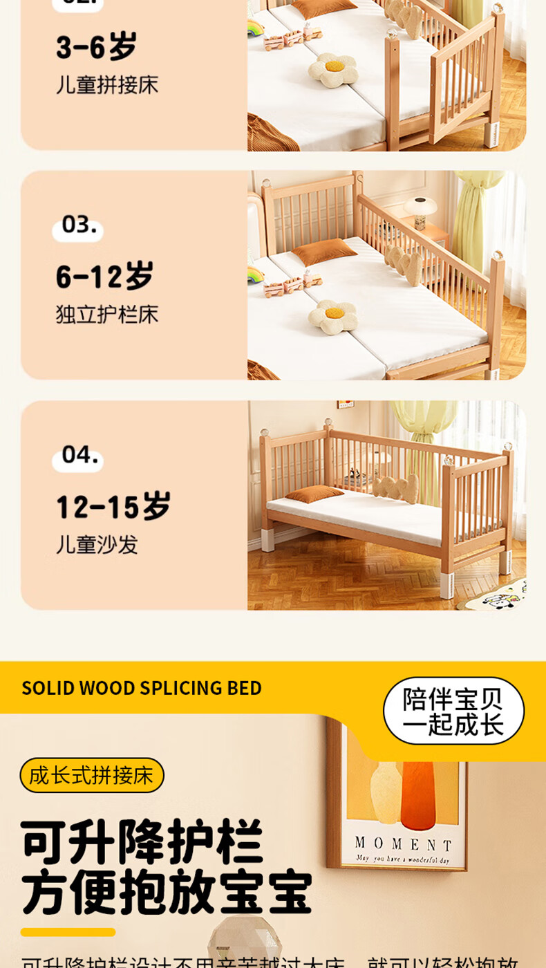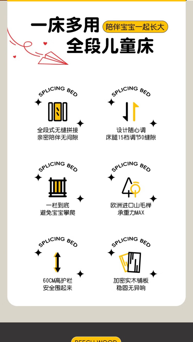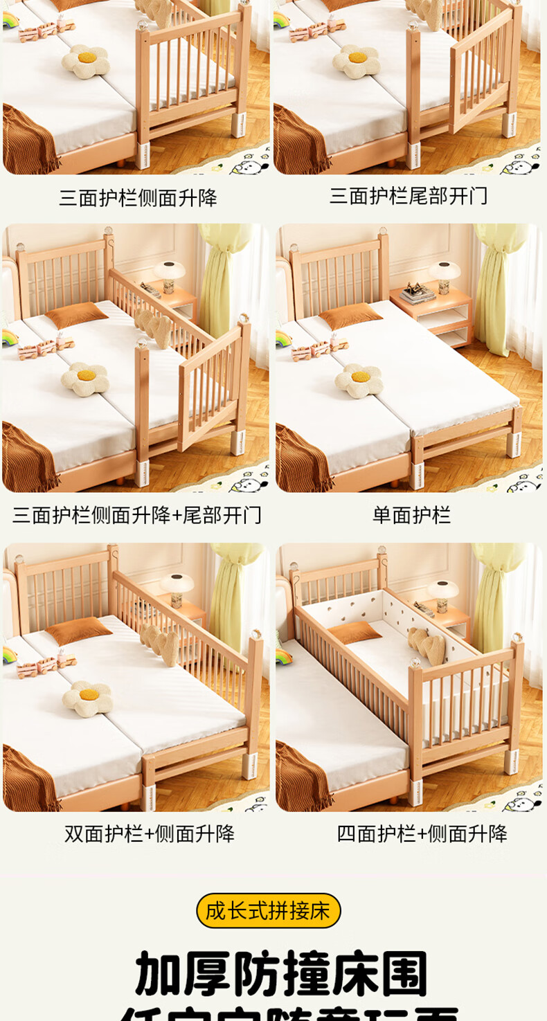 Zhiqushu all solid wood liftable beech wood spliced bed children's bed crib widened spliced large bed bedside bed can be customized three guardrails + 6cm coconut palm mattress + side lift can lift length 200 width 60 height 35 60 guardrails