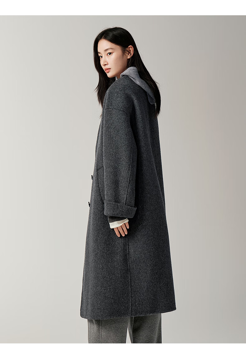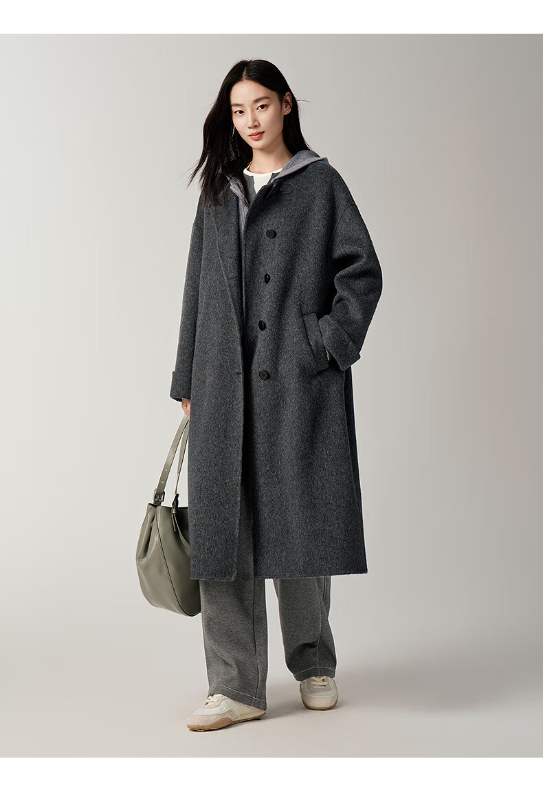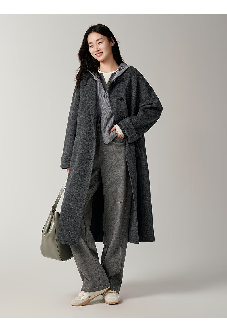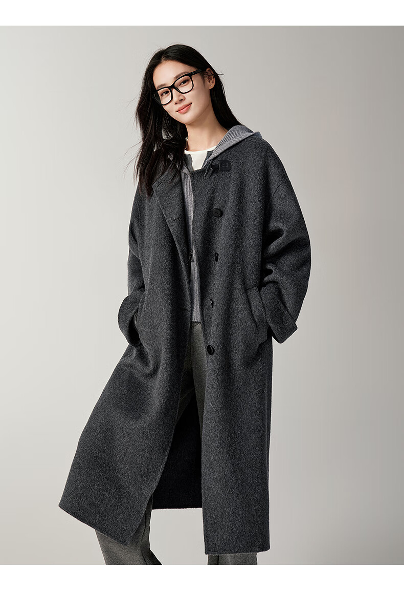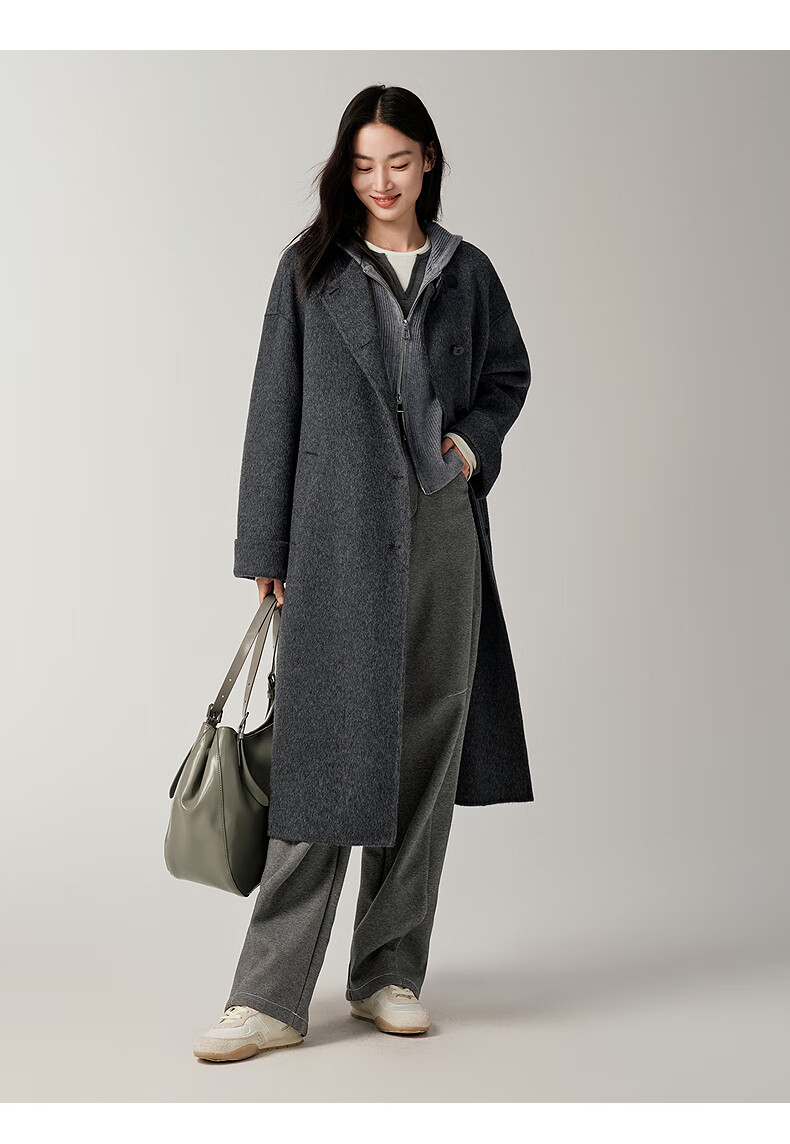 Jiuzi Annako college style 100 wool genuine two-piece hooded collar double-sided woolen coat for women 2025 winter new style dark gray S