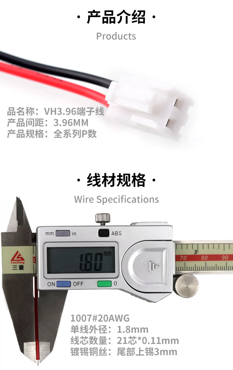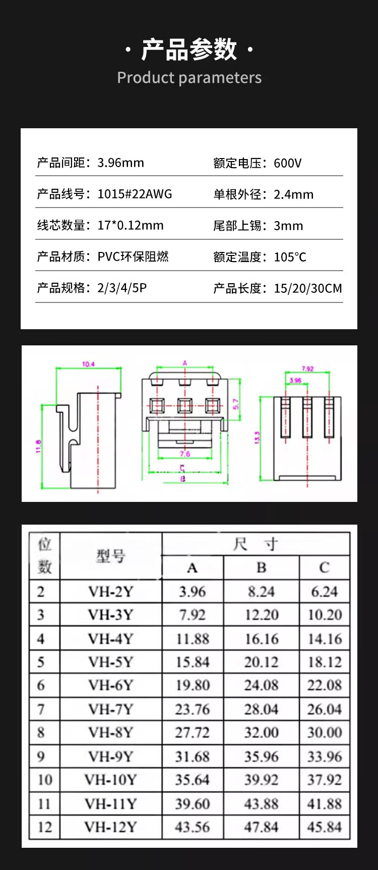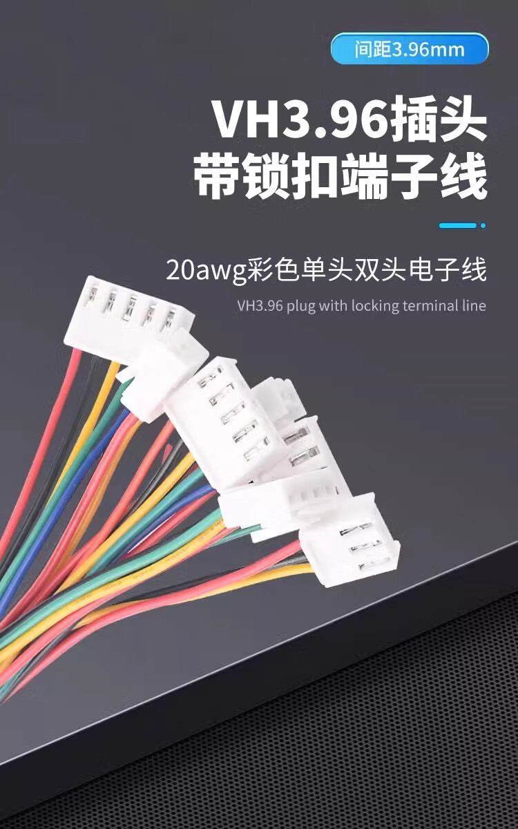 VH3.96 plug with locking terminal wire, pitch 3.96mm, 20awg color single-ended double-ended electronic wire, 150mm single-ended (tin-plated tail) 3P male connector, no specifications